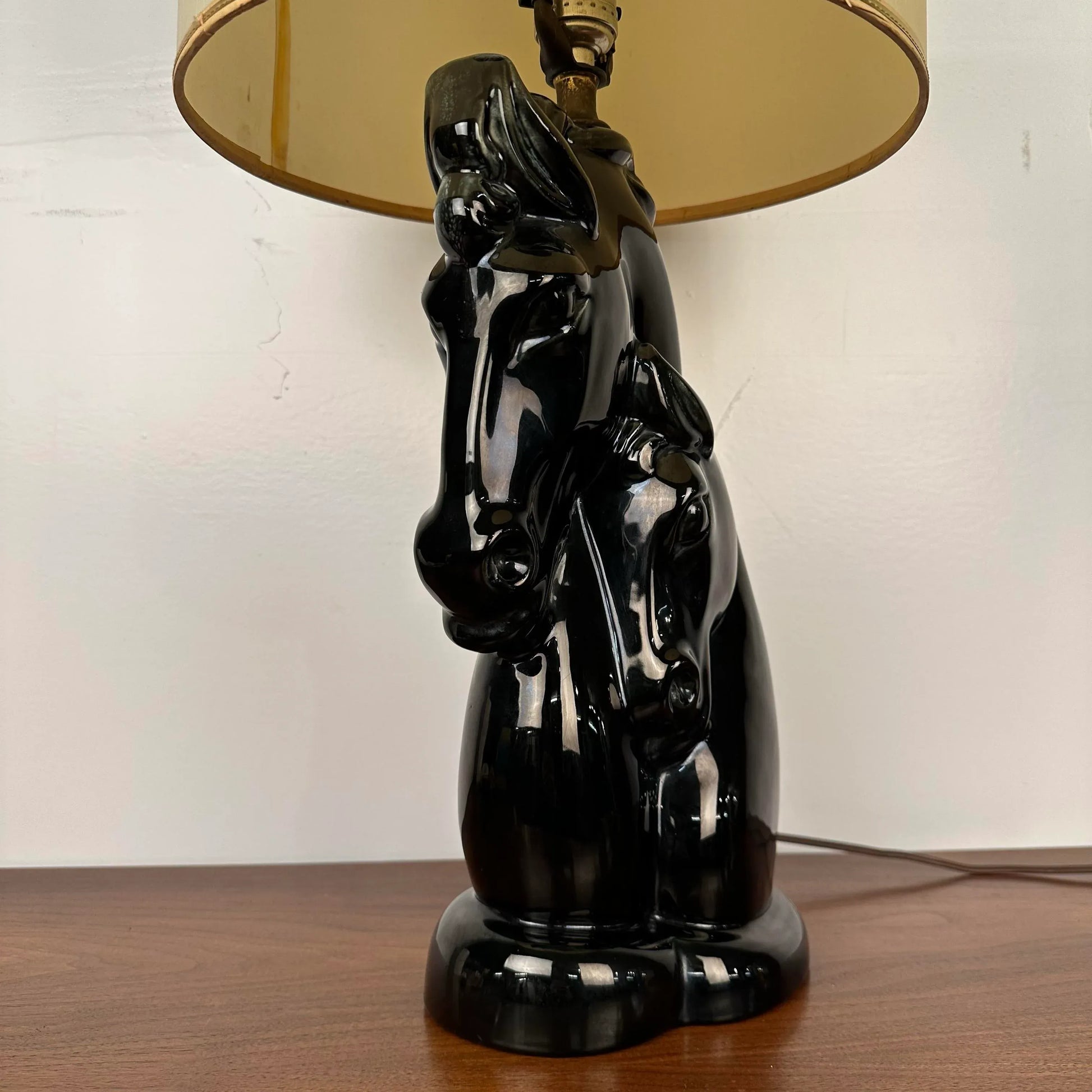 Black glazed ceramic table lamp featuring two horse heads—one adult horse and one little horse. The shade is barrel-shaped and has gold trim detailing. Brass finial.