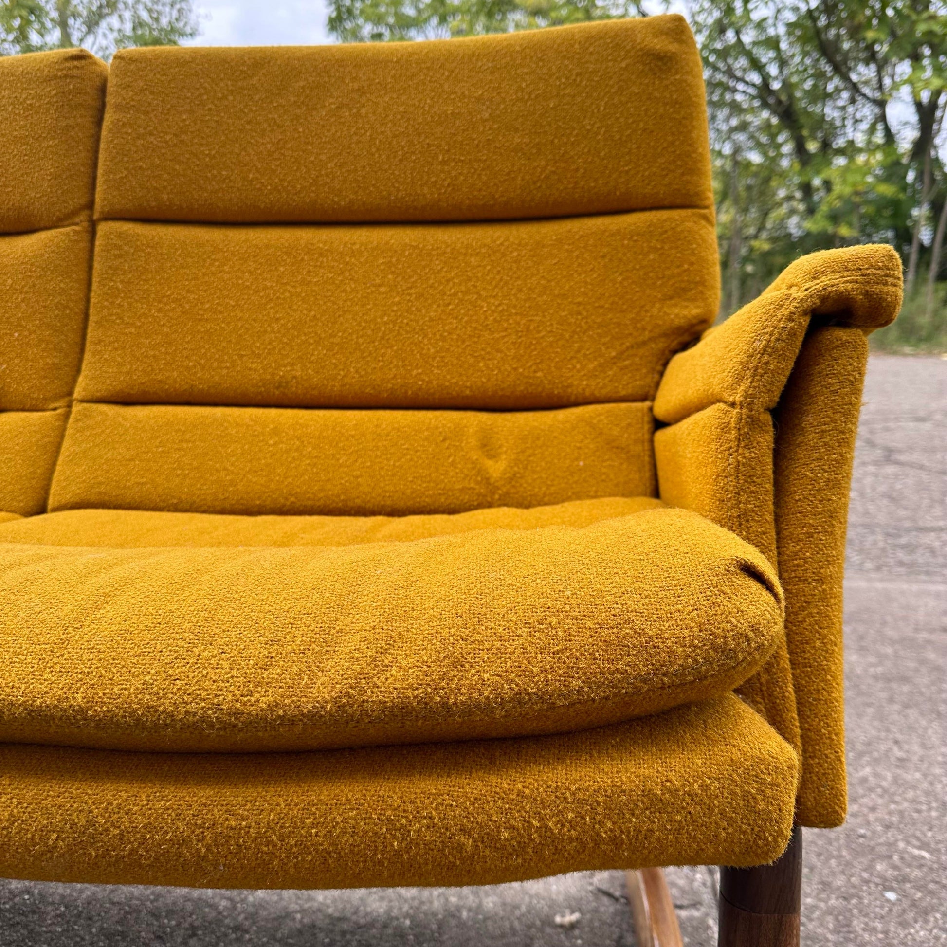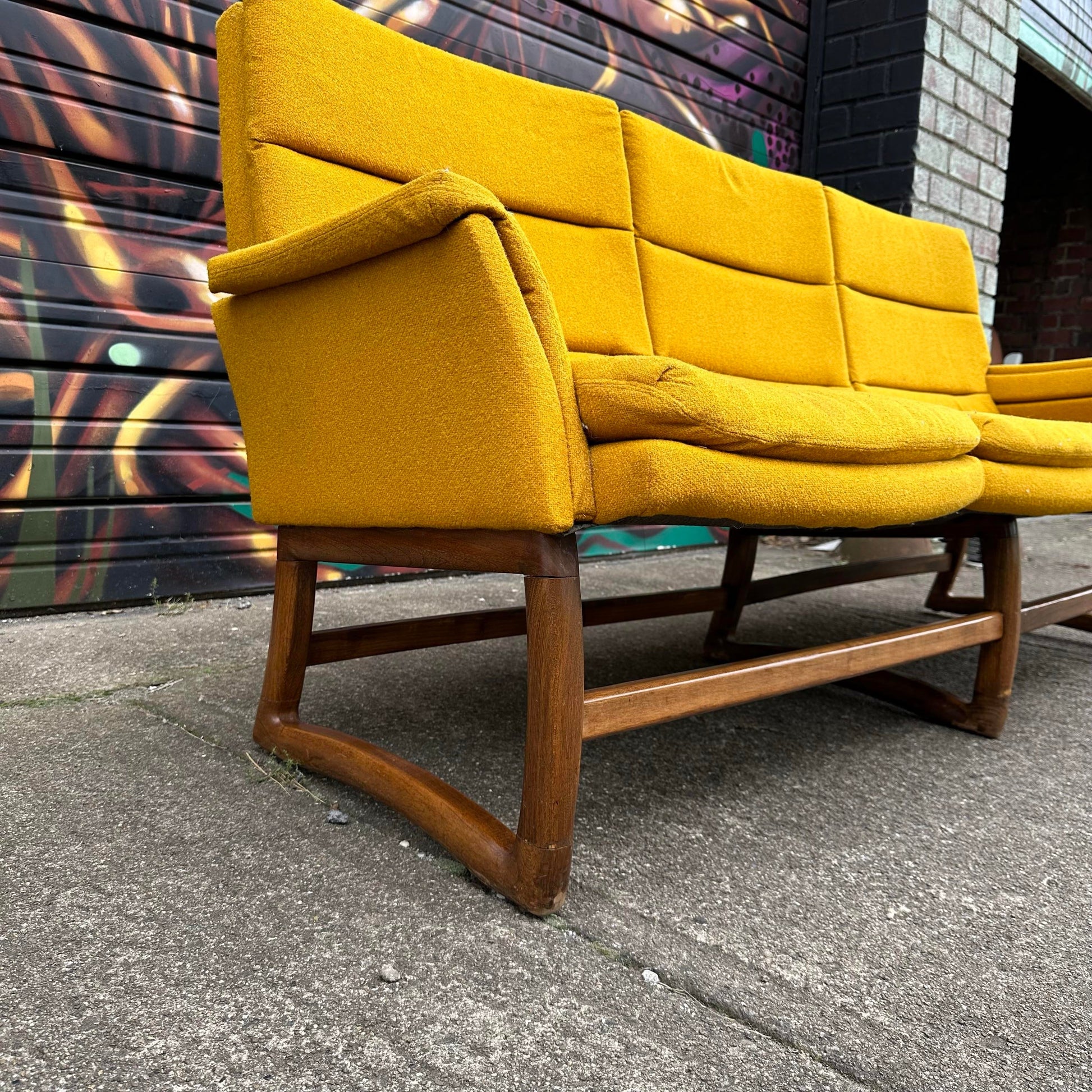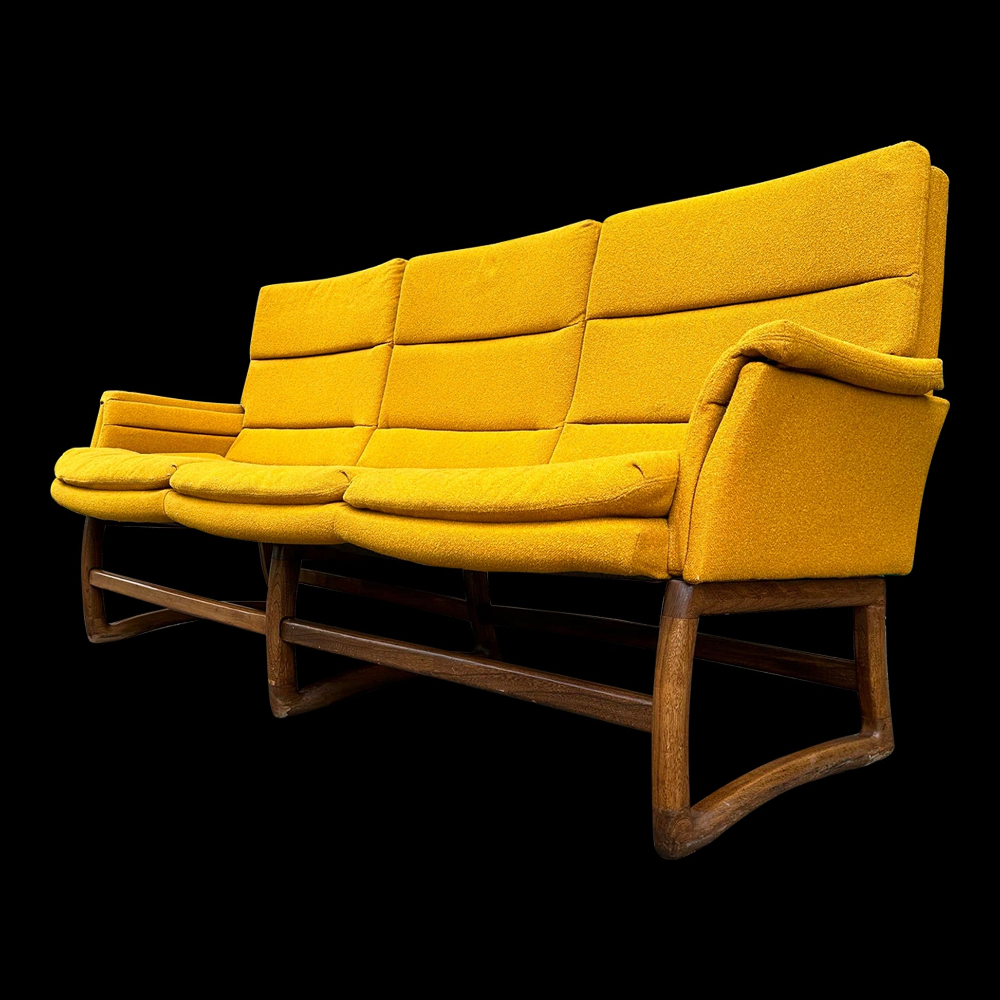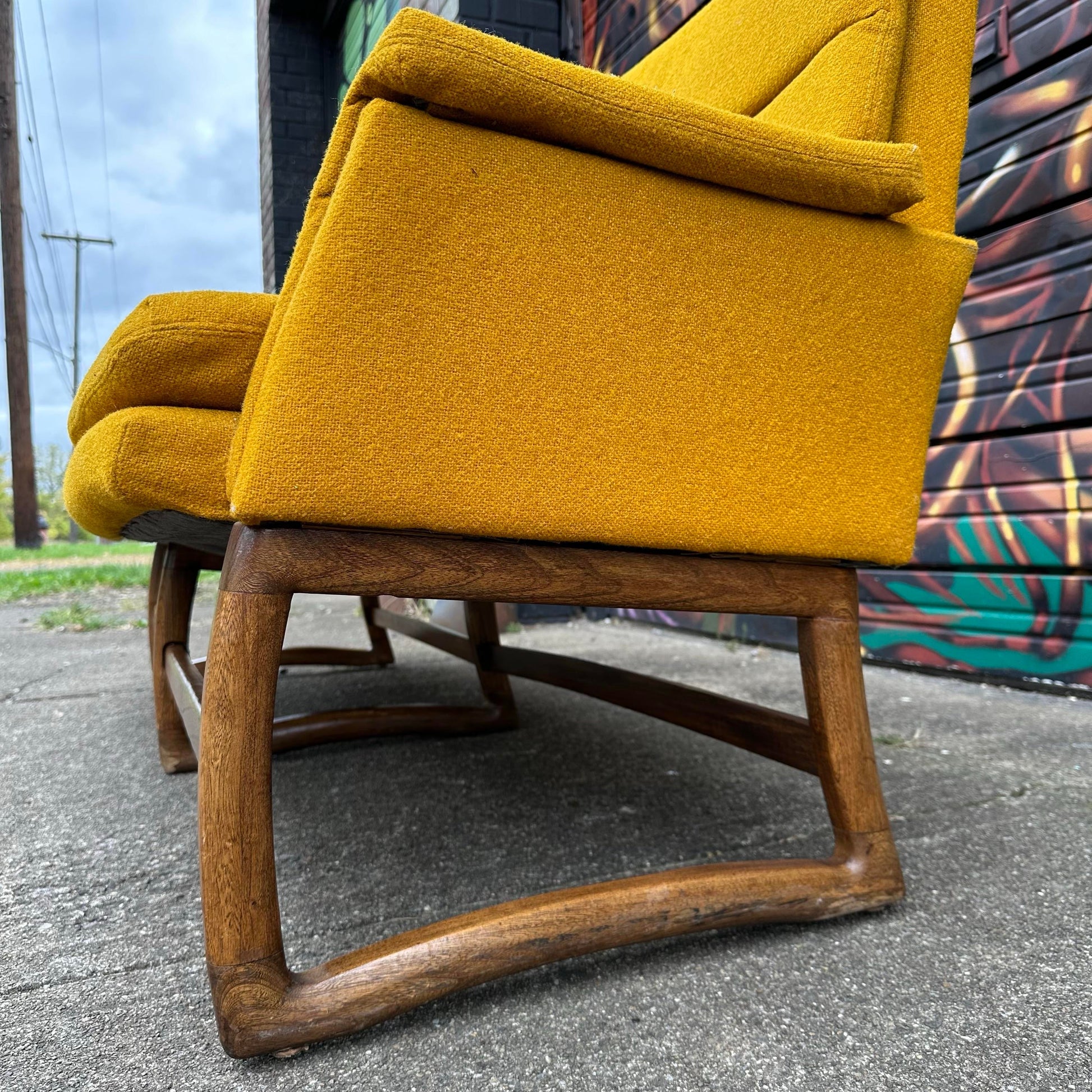 This mid-century modern sofa features a mustard yellow fabric with channeling along the back rest and arms. The frame and base is constructed of a sculptural curved walnut. We have been unable to identify maker of sofa but it has an Adrian Pearsall style look and feel to it.