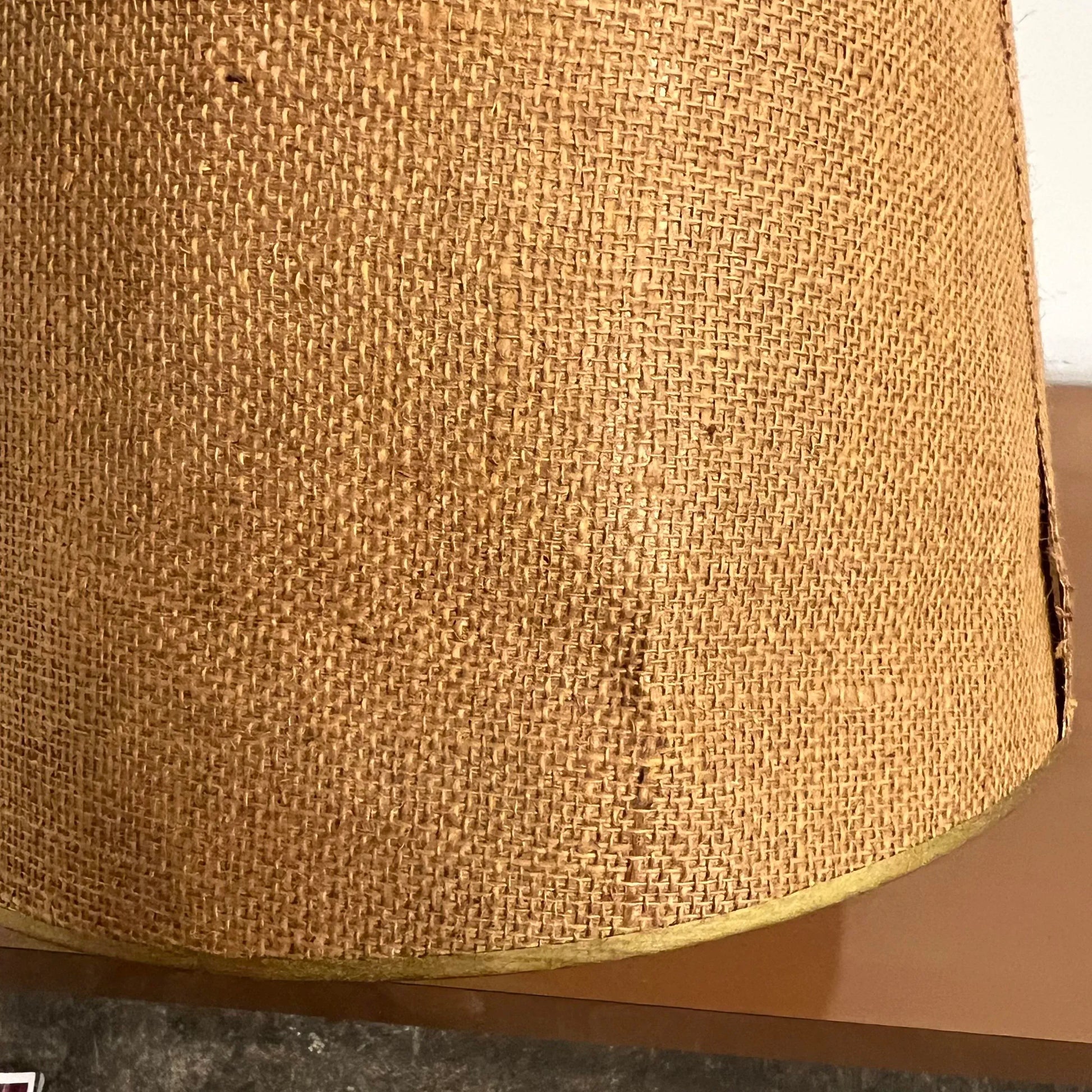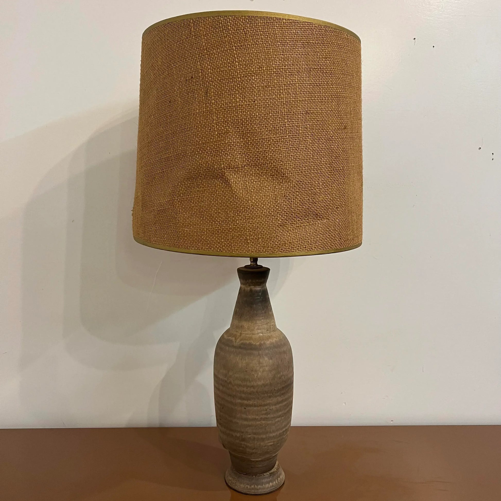 Mid century table lamp with ceramic pottery base and woven lamp shade glazed in earthen tones. Height of lamp with shade 31.5”. Shade dimensions 16”w x 16”d x 13.25”h.