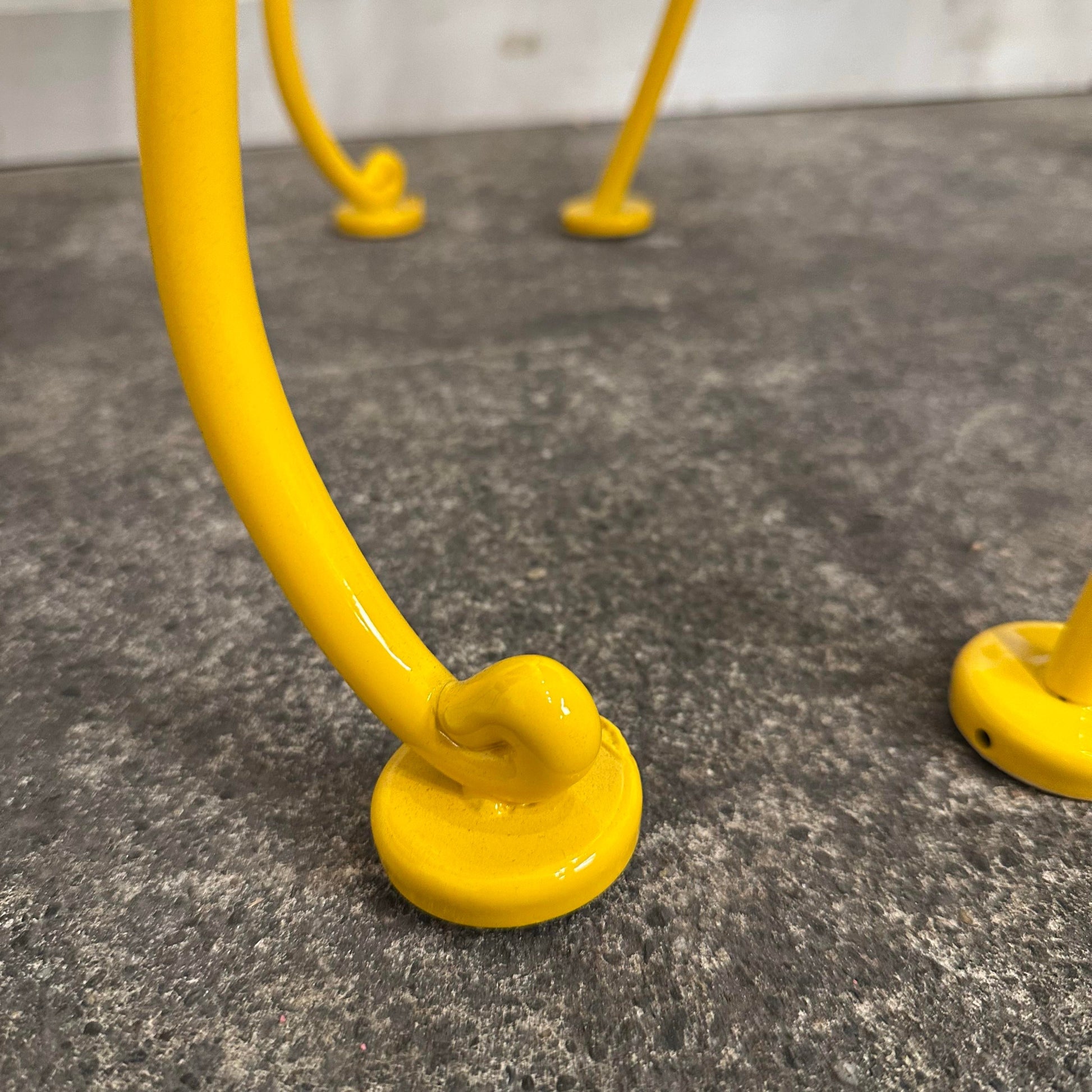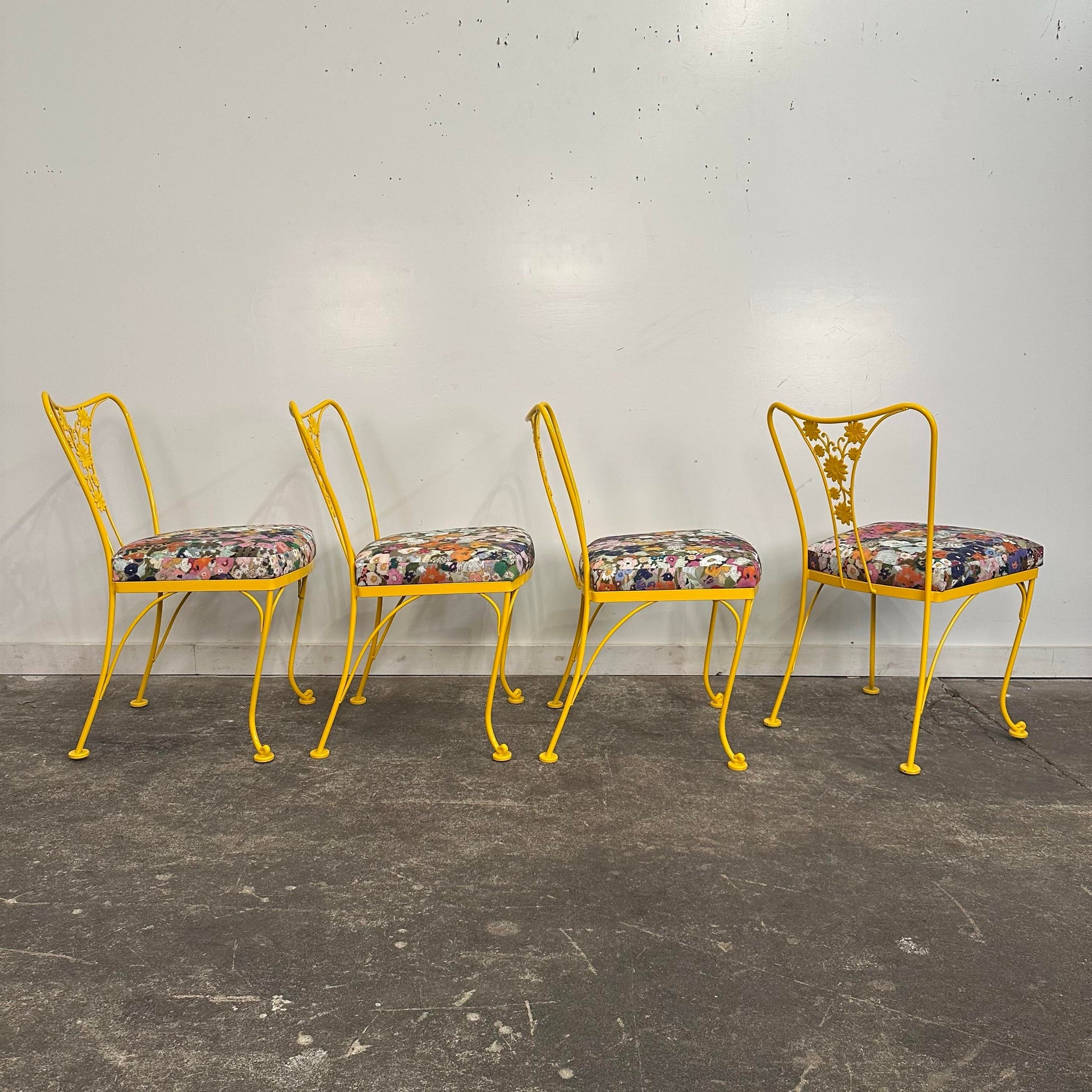 This set of chairs has been recently powdered coated yellow and the seats has been recovered in a colorful floral outdoor fabric.