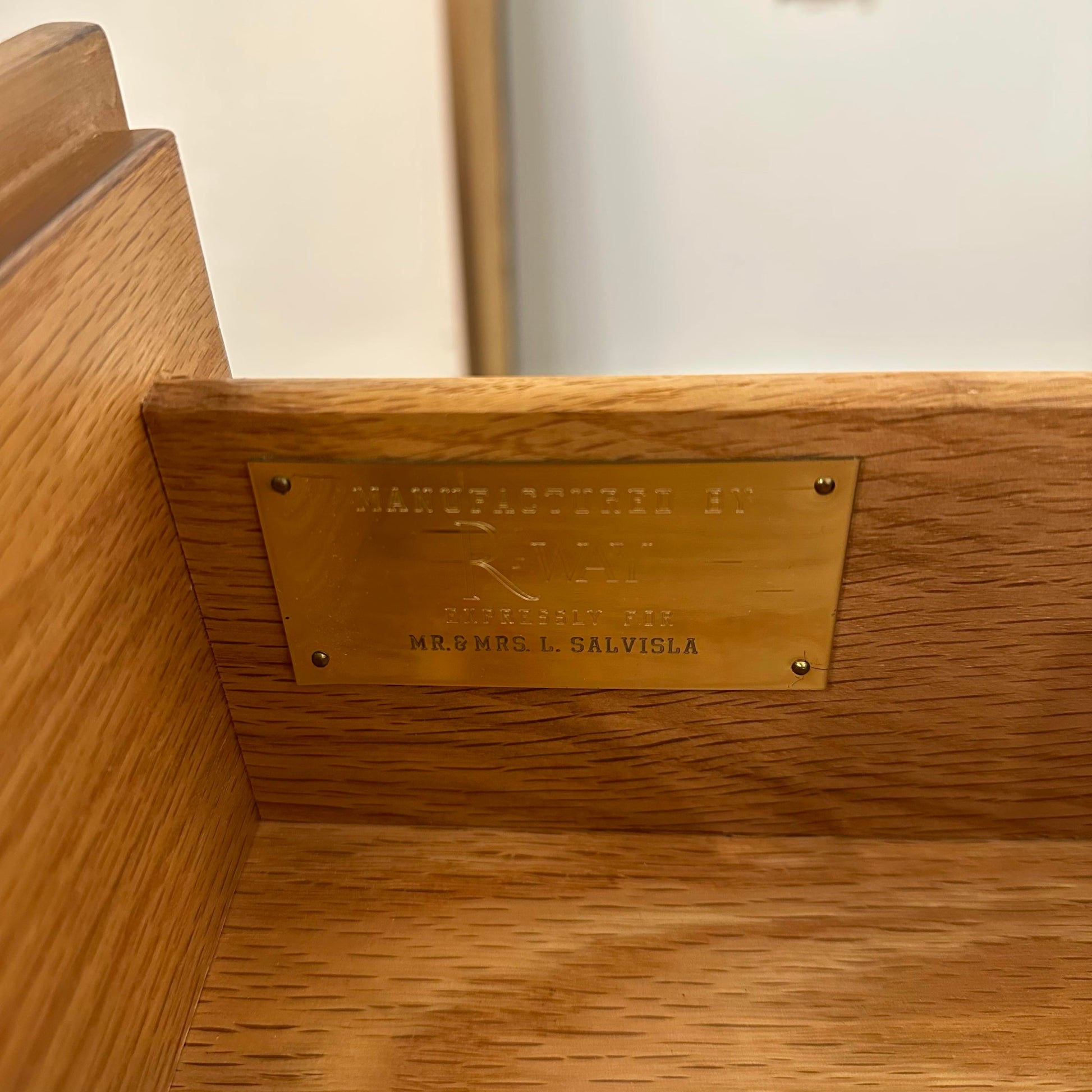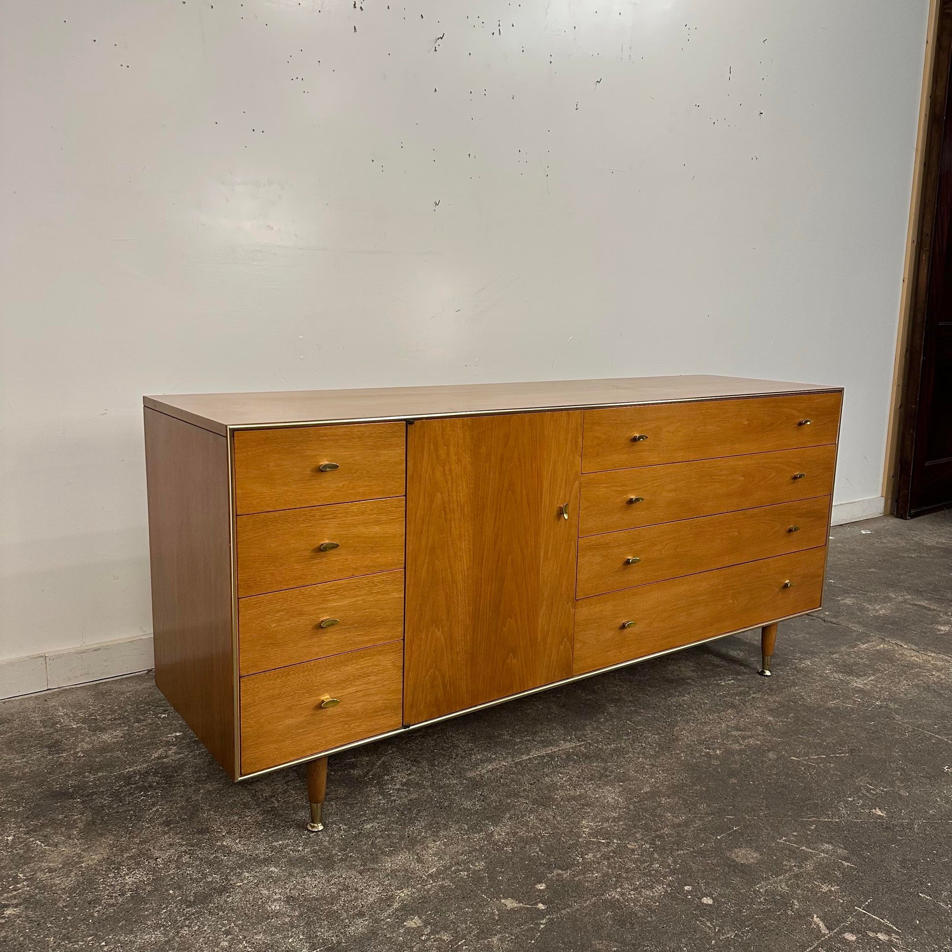 RWAY 8-drawer lowboy dresser with brass capped feet and pulls. This piece features brass capped feet and pulls, as well as a brass trim detailing. There are 4 large drawers, a door that opens to reveal 3 adjustable shelves, and four more smaller drawers.