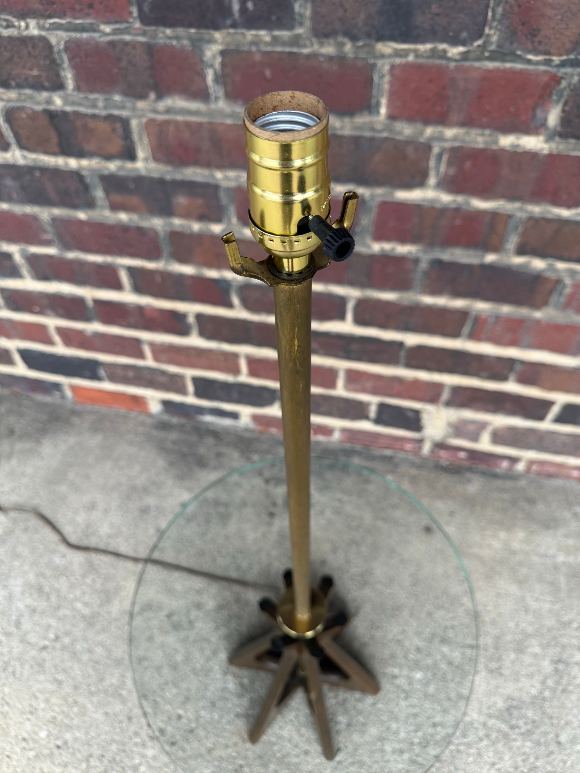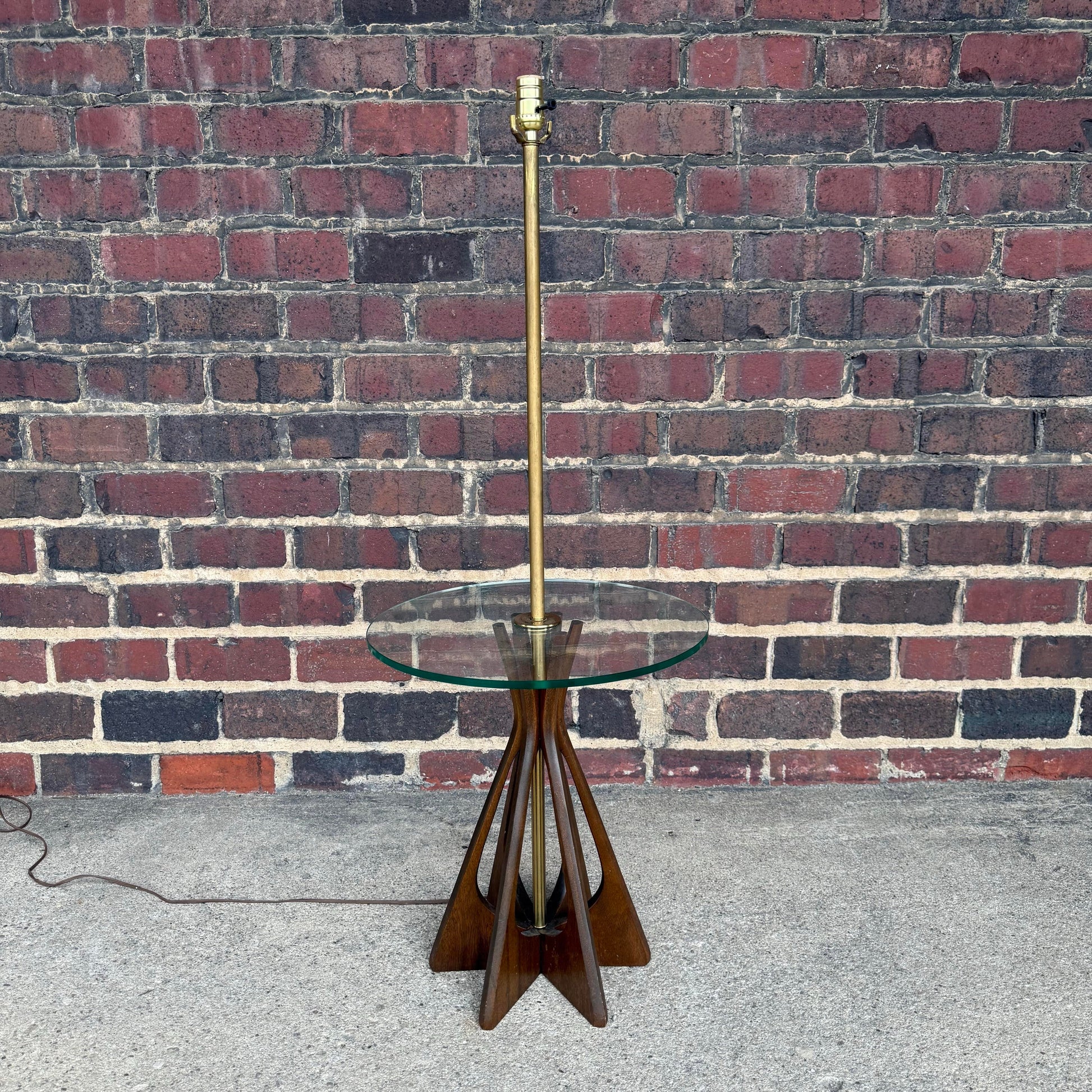 While the maker is unknown, the piece strongly evokes the aesthetic of Mod Line and similar designers from the 1960s. The lamp stands 47 inches from floor to socket, with the glass table positioned at 20.5 inches high. The glass top itself measures 18 inches in diameter.