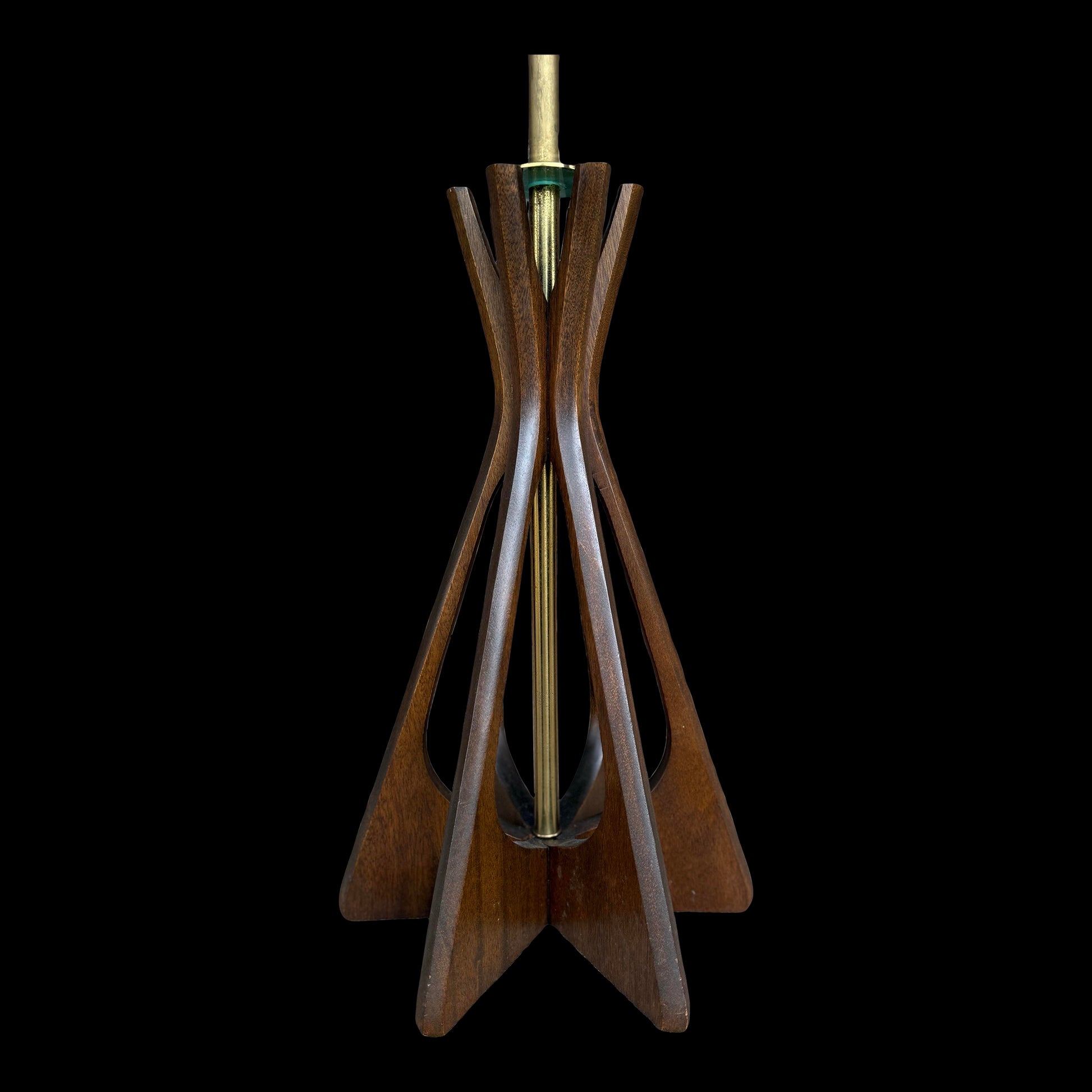 A striking mid-century modern floor lamp in the style of Mod Line, featuring a sculptural solid walnut base and integrated glass table. The design showcases a vertical brass tube rising from the base—adding both elegance and architectural presence.