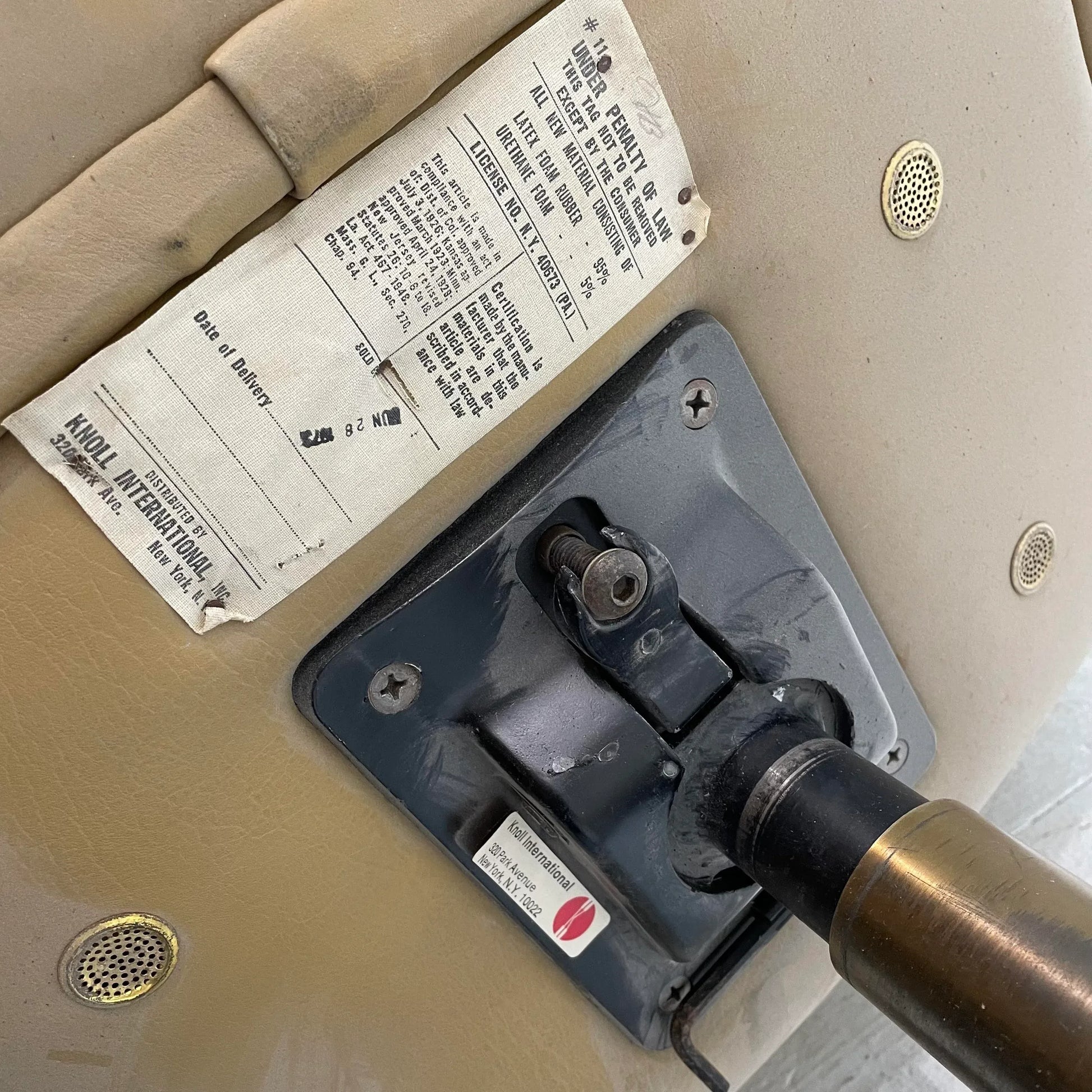 Mid Century Leather Executive Chair by Max Pearson for Knoll. these chairs have become increasingly popular and risen in value drastically over the past 10 years as the design has become increasingly loved for its large curved body and the supply of them has dwindled to the point they are becoming harder and harder to find. We have 6 that are all in need of Upholstery. they are all tagged with a knoll furniture tag and came from the tallest building in wheeling Virginia at the top executive meeting room. not the board room but the room off of the presidents office.