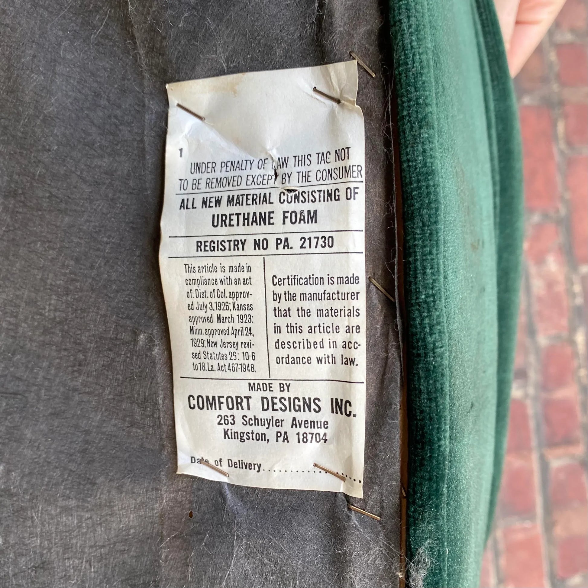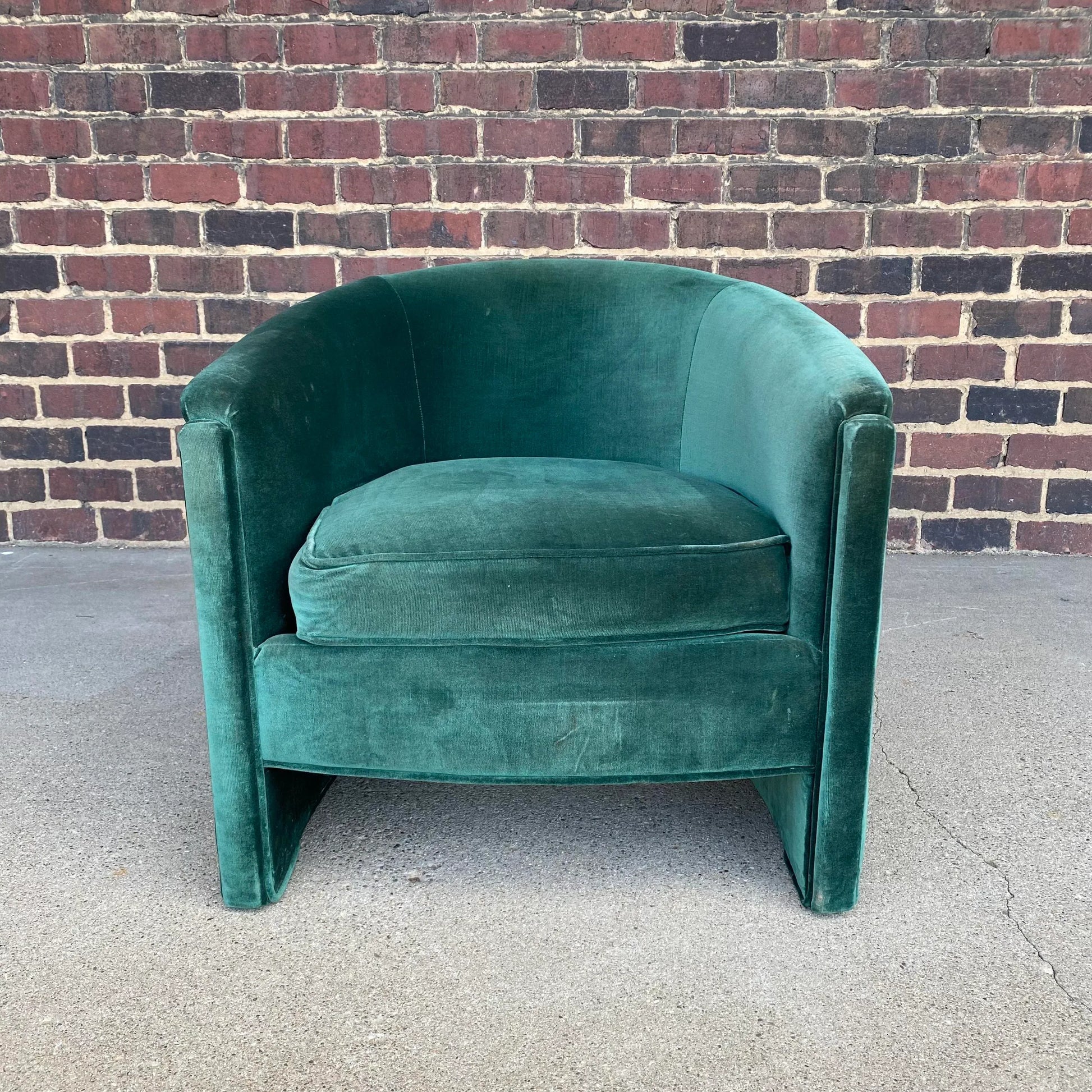 The upholstery job is unreal. The green velvet club chair by comfort craft does not come up often. The chair is tagged on the bottom with paper label.