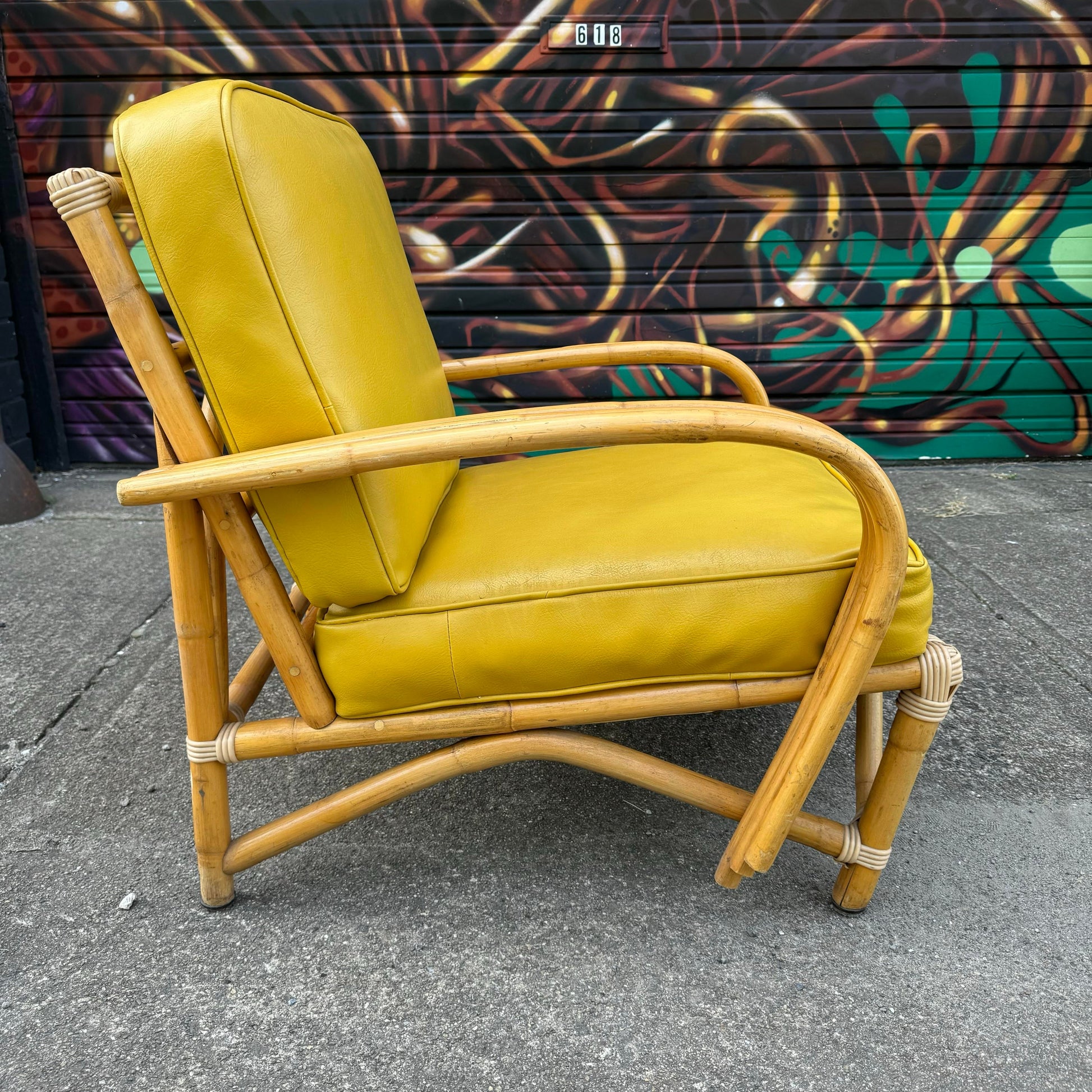 Mid Century Modern Bamboo Arm Lounge Chair. This chair features bamboo base and a yellow or gold faux leather cushion. This legs are wrapped with a faux canning. This design is similar to the iconic Paul Frankl bamboo furniture.
