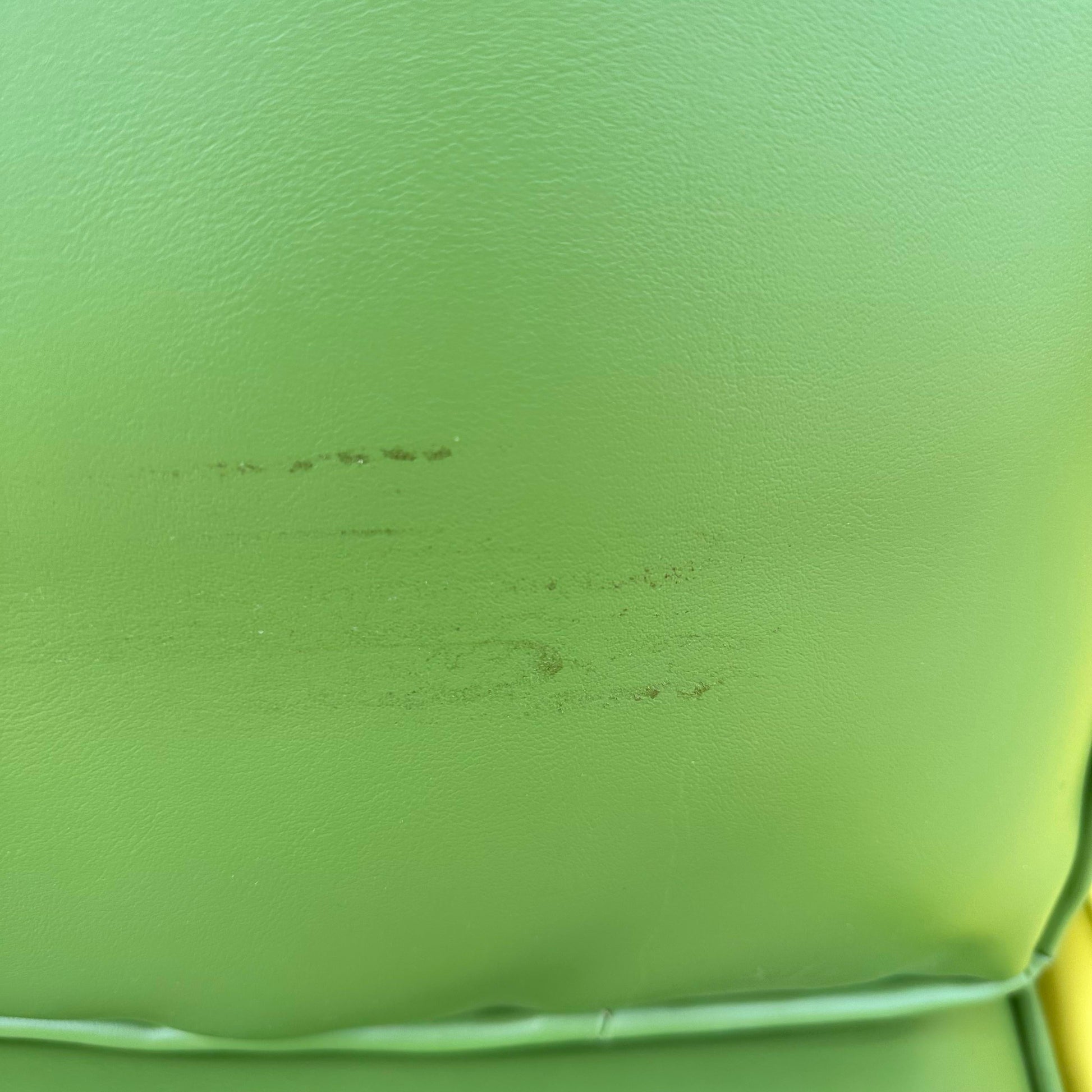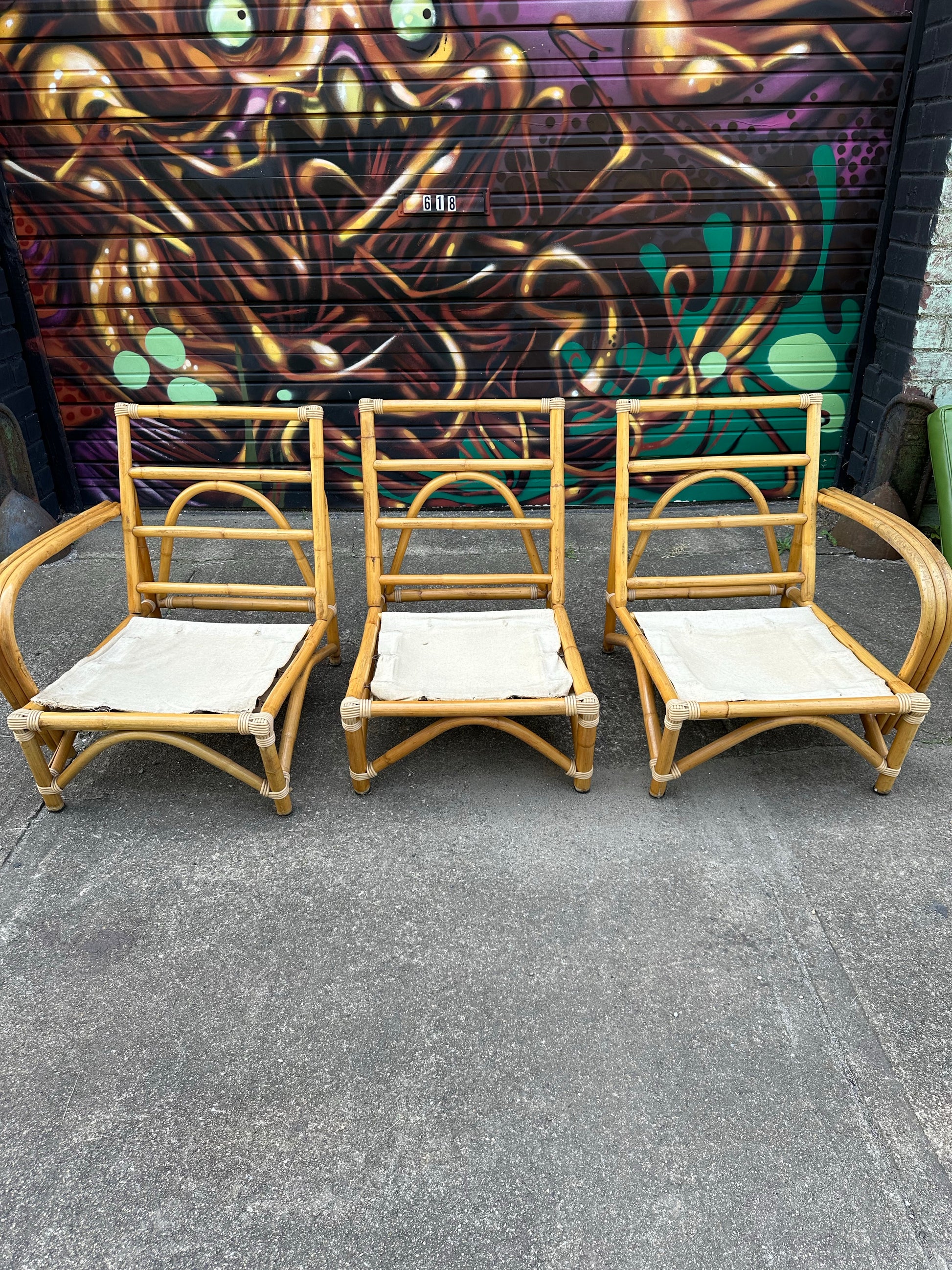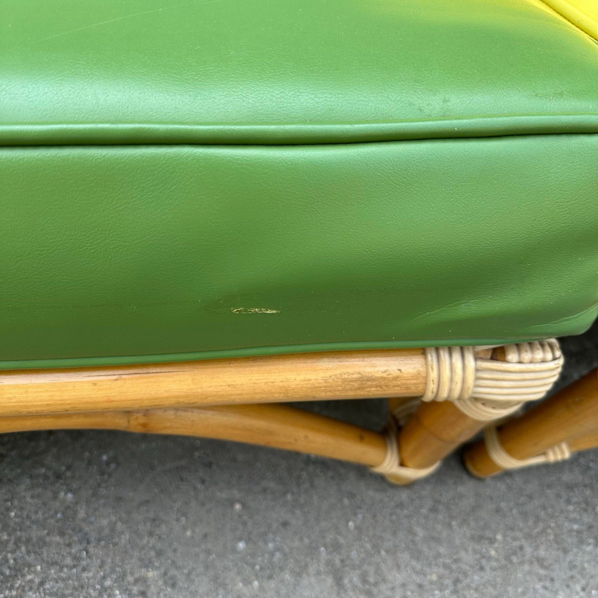 Mid Century Modern Bamboo Sectional Sofa. This sofa features yellow and green cushions, which suggest that you can take out one section and turn it into a loveseat which is optional. The cushions appeared to be a faux leather, possibly naugahyde. The corners are wrapped of a faux caning. And the base of the sectional are bamboo. This design is similar to the Paul Frankel bamboo furniture. There’s no makers mark on the sectional.