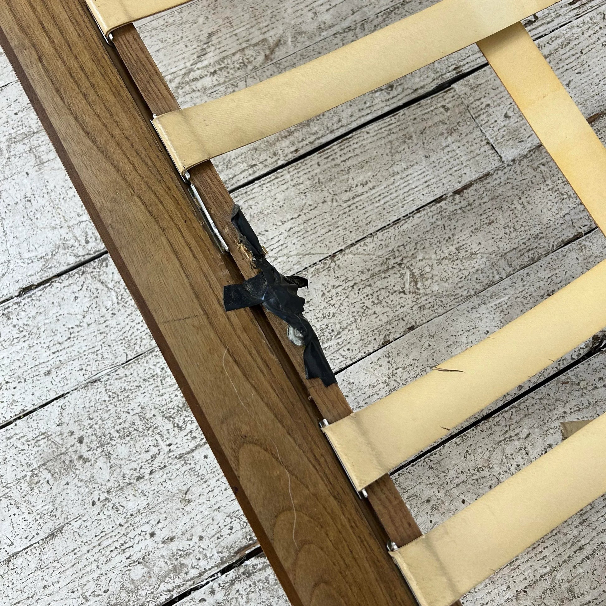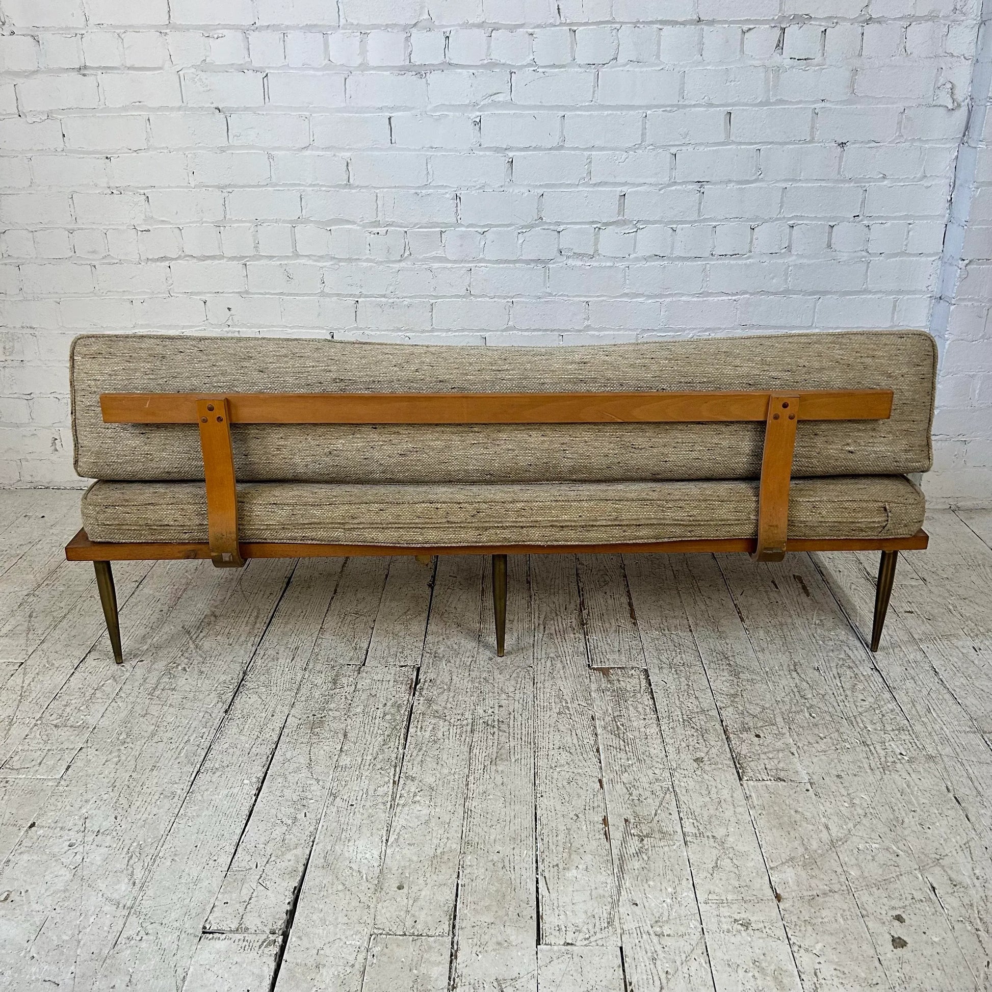 Mid century modern Brass Leg Daybed Sofa. This sofa has a sleek Scandinavia and clean line design. The tall brass legs are a nice touch of well made construction. The cushions are removable and can be made into a bed or used as a sofa.