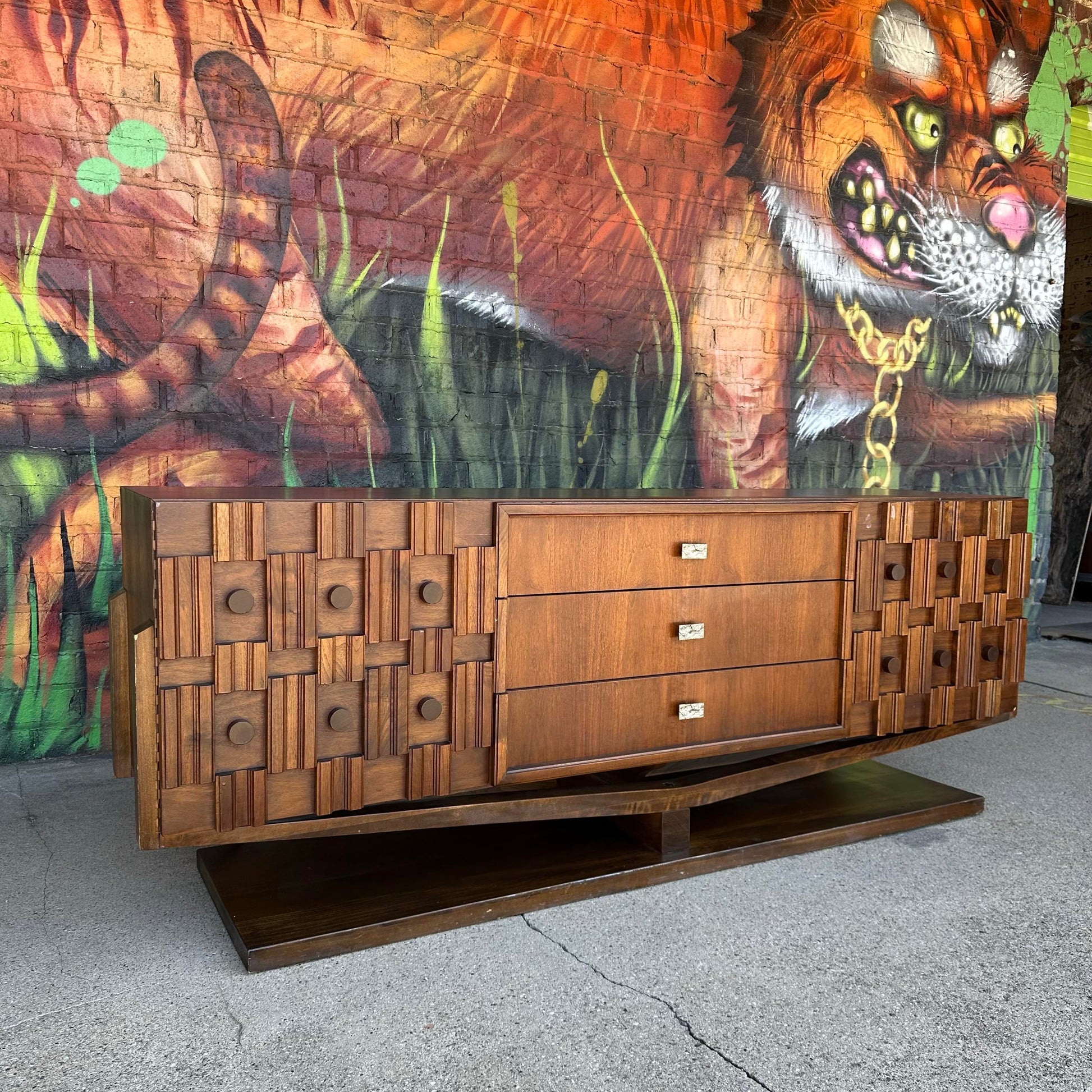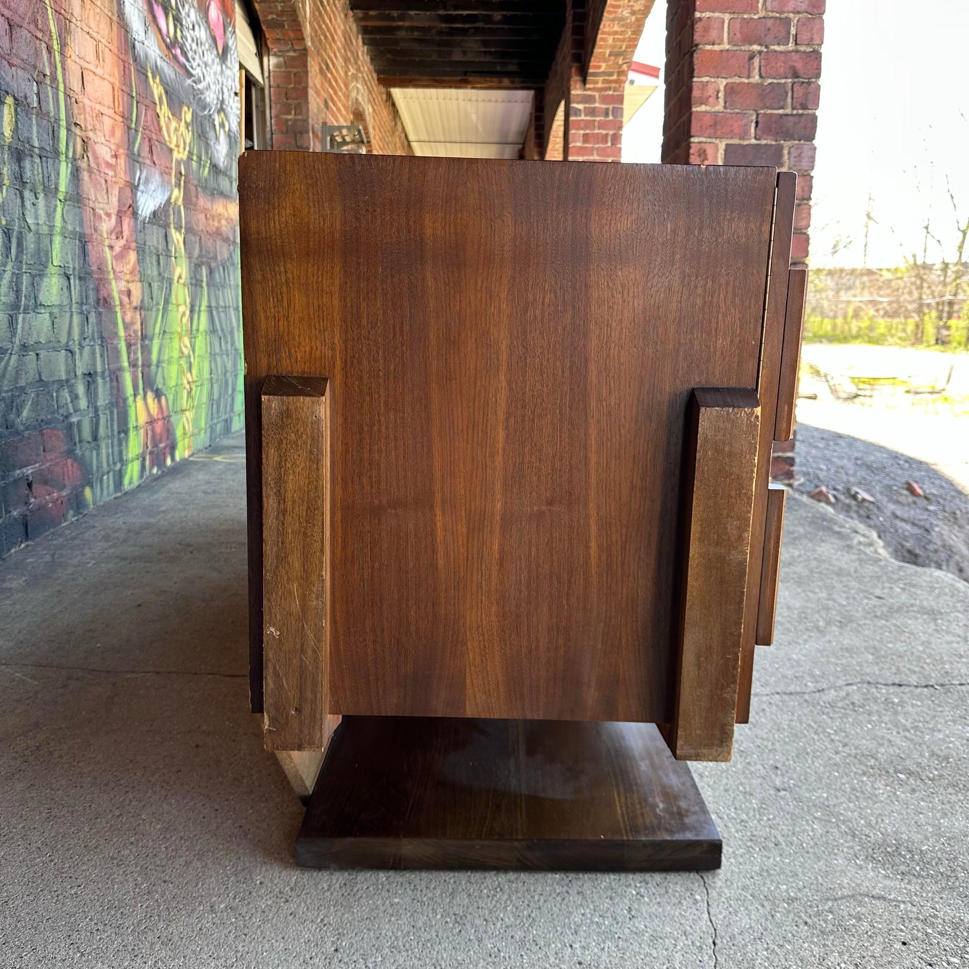 Mid century modern Canadian Brutalist Walnut 9 Drawer Pedestal Lowboy Dresser. The pulls are metal and made to look like stone. This piece is styled after a Paul Evans design. This piece could be used as a dresser or credenza. It is marked 1973 and made in Canada.