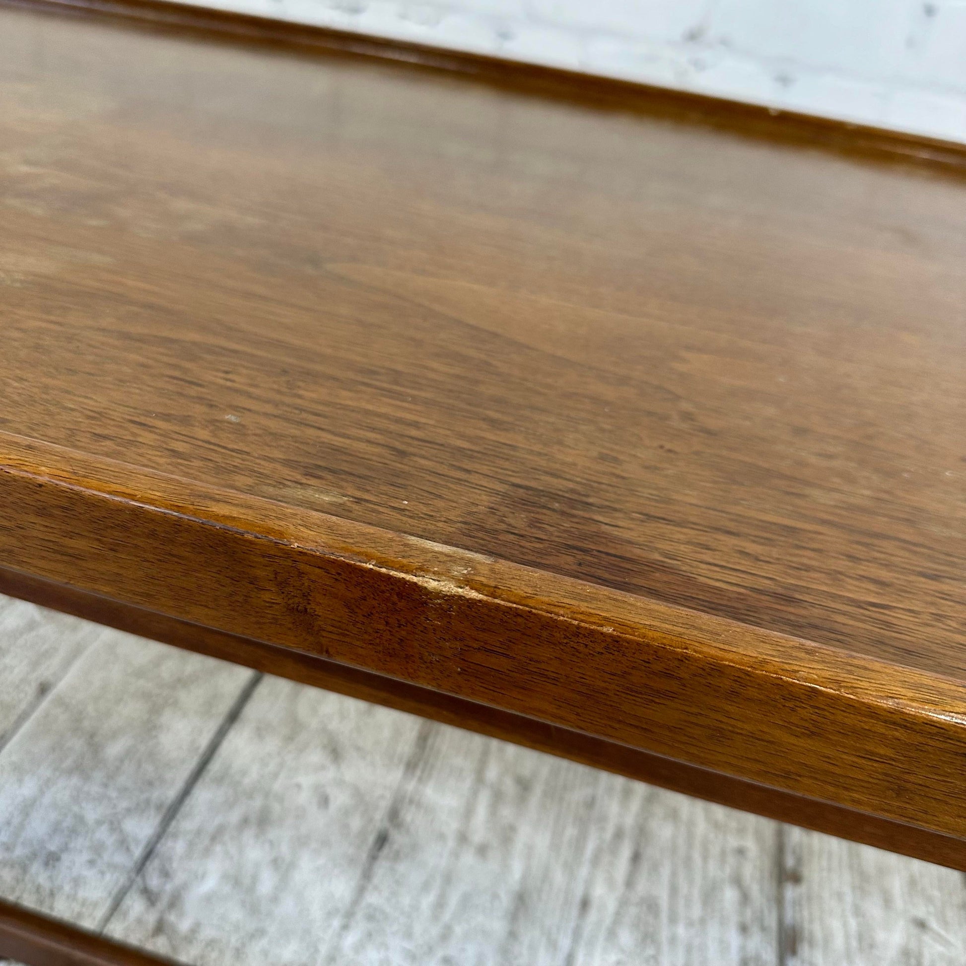 The coffee table has a tall and short design quality and an edged lip around the sides which adds to its mid century modern feel.