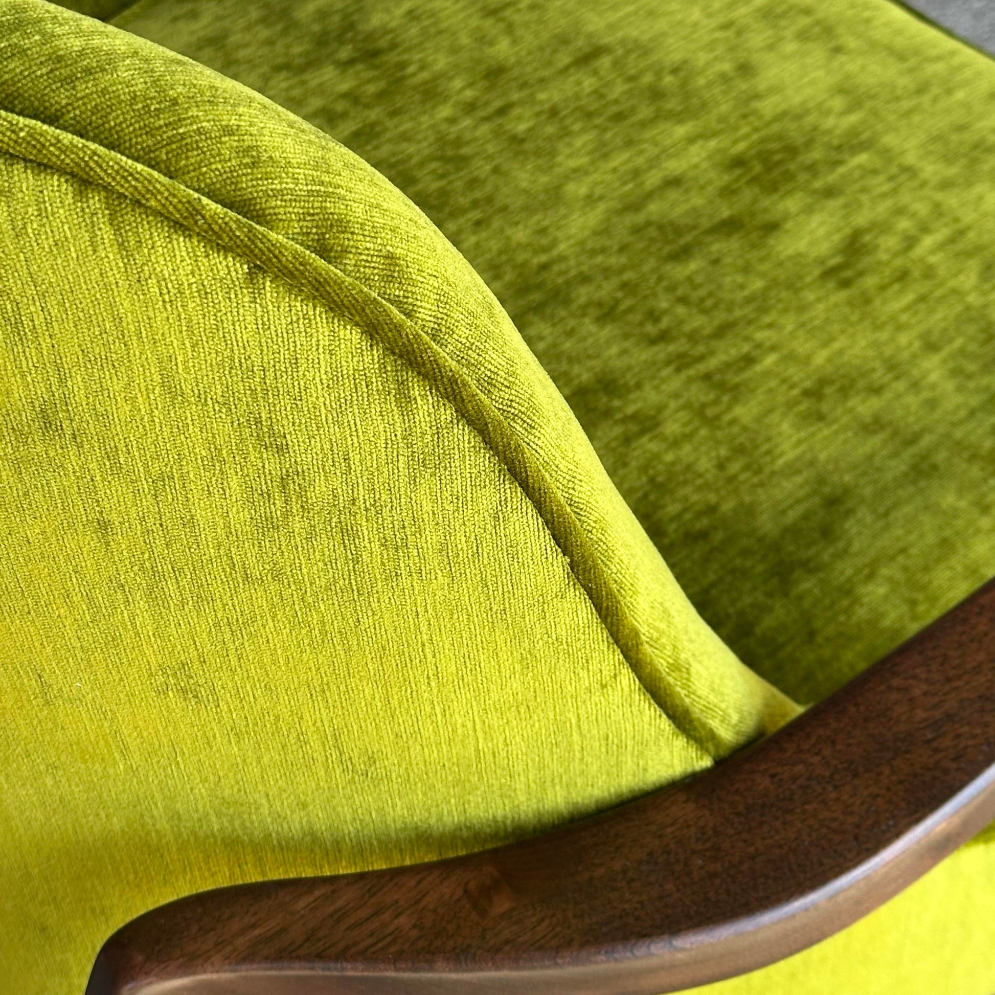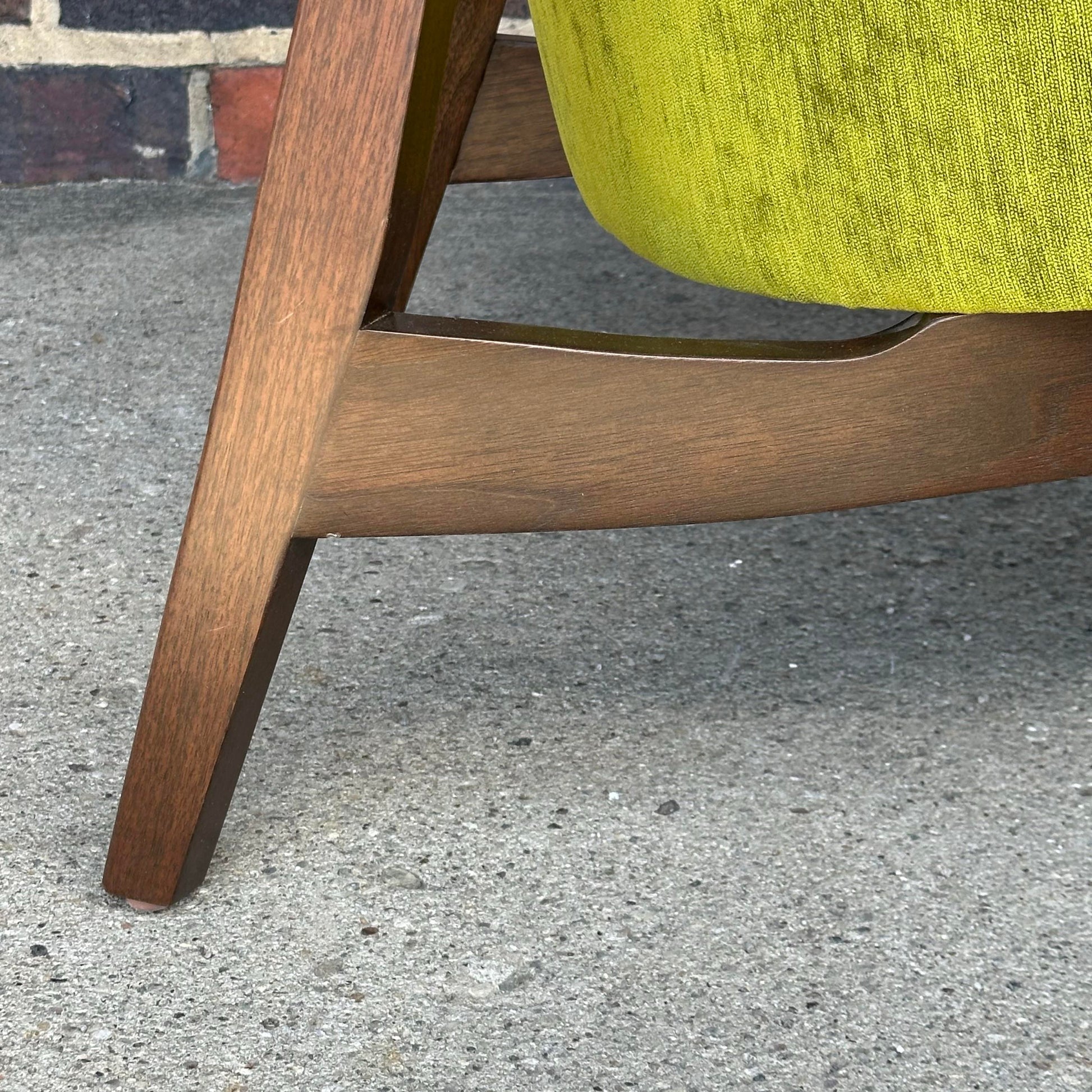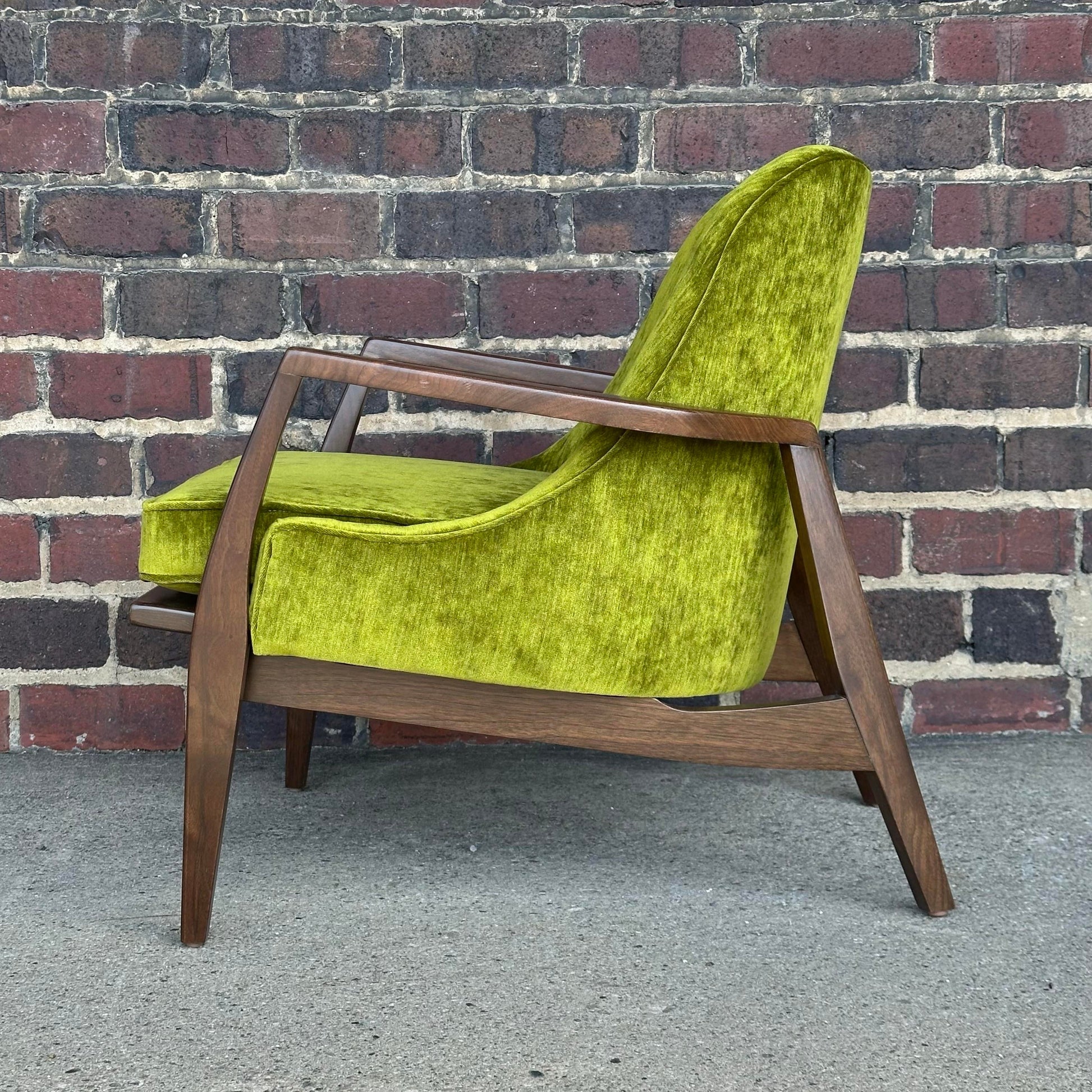 Mid Century Modern Custom Seal Style Lounge Chair covered in green crushed velvet. This chair is Vintage inspired a newly custom made in Ohio. The chairs frames are walnut, and the seats are covered in green velvet.