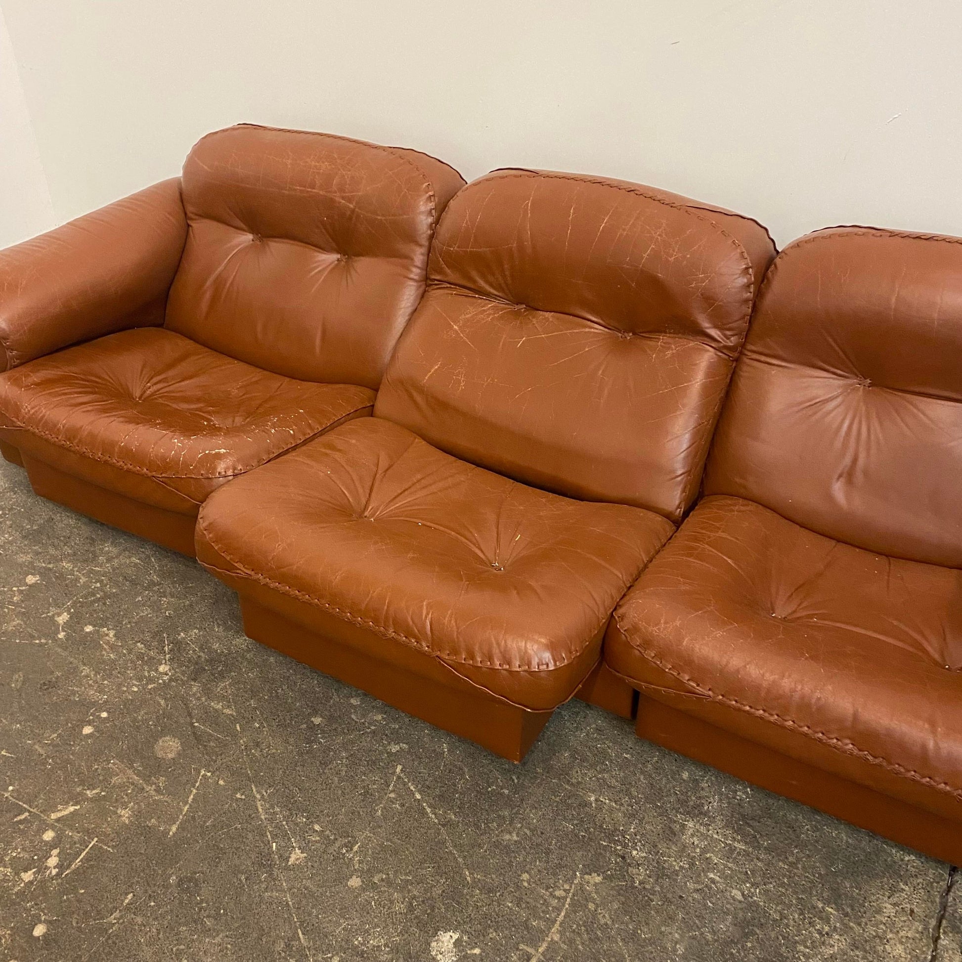 Mid-century modern reclining leather sofa. Each section reclines. Upholstered in brown leather with some wear to the seats and backs. One seat in particular appears to have been fixed before and and wearing. The stitching along the lines of the sofa make for an interesting detail to the sofa.