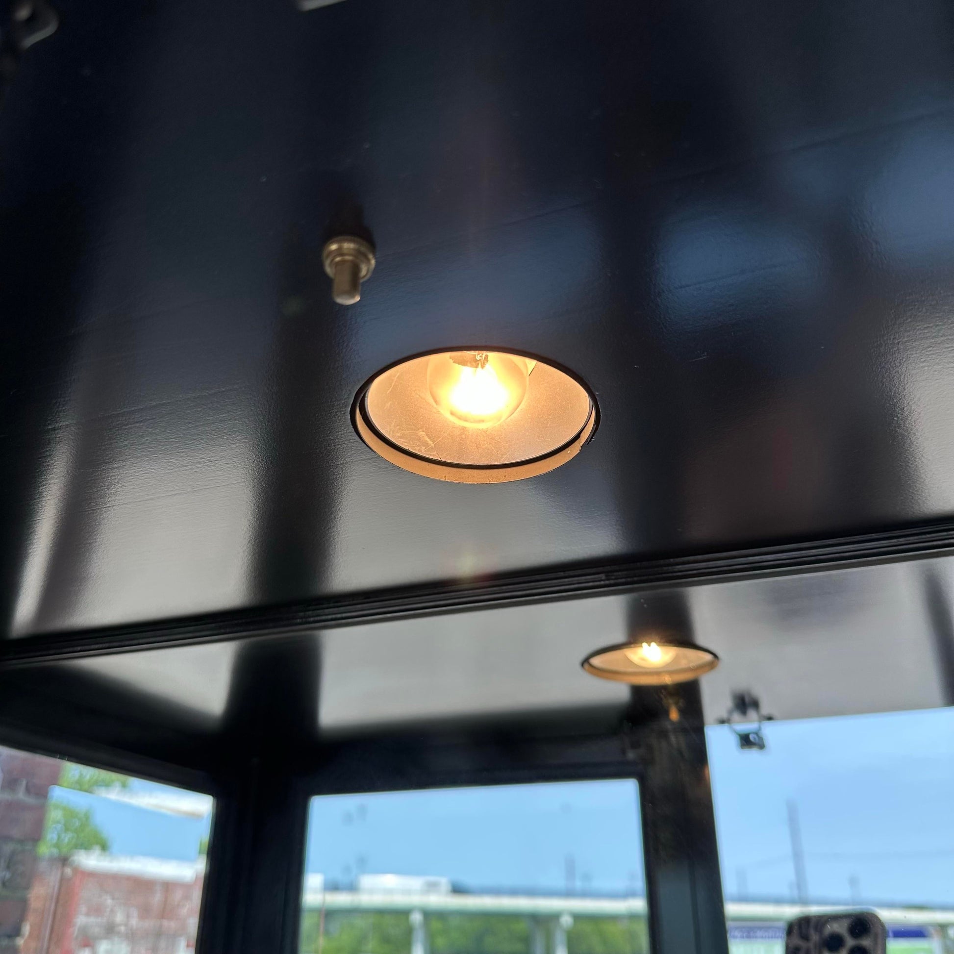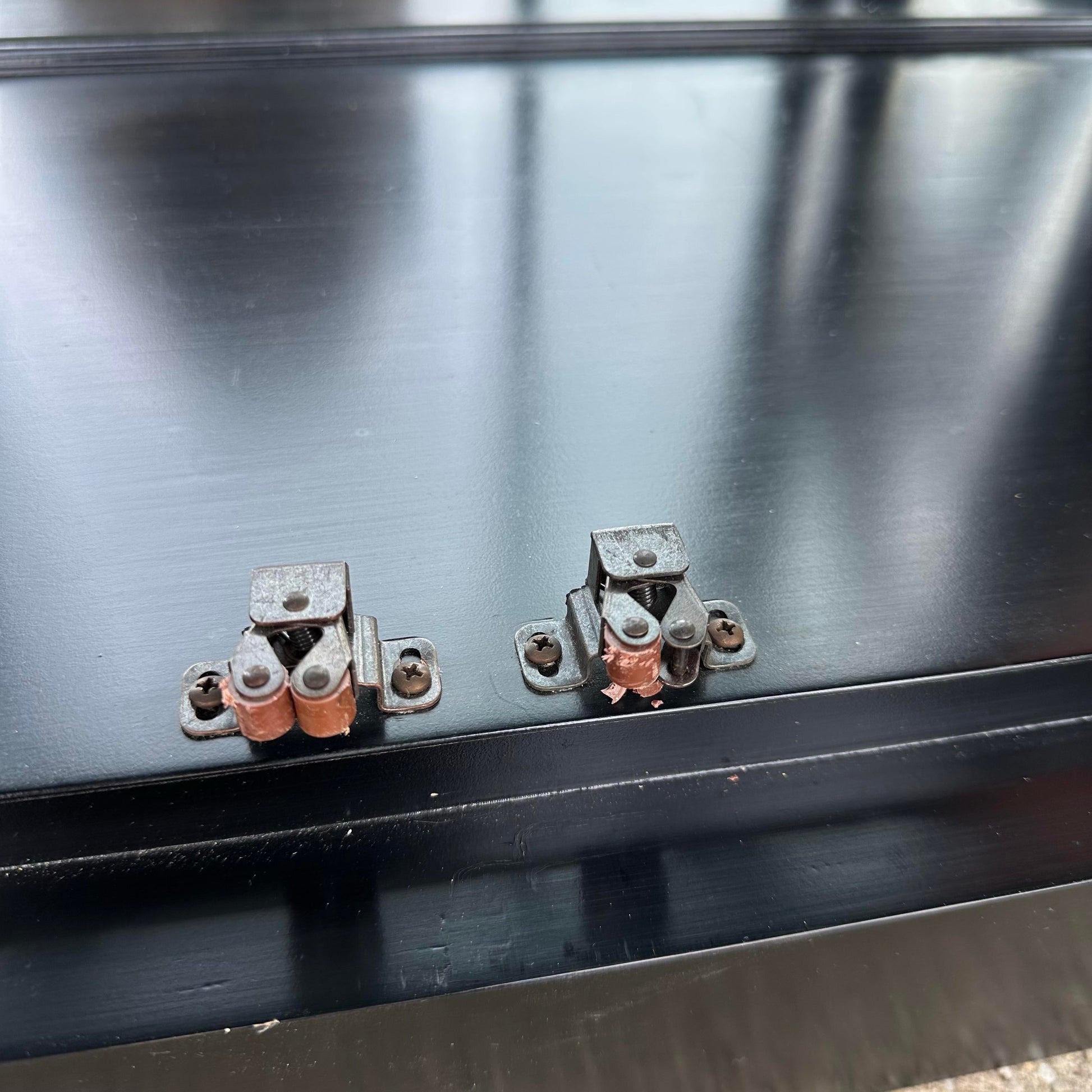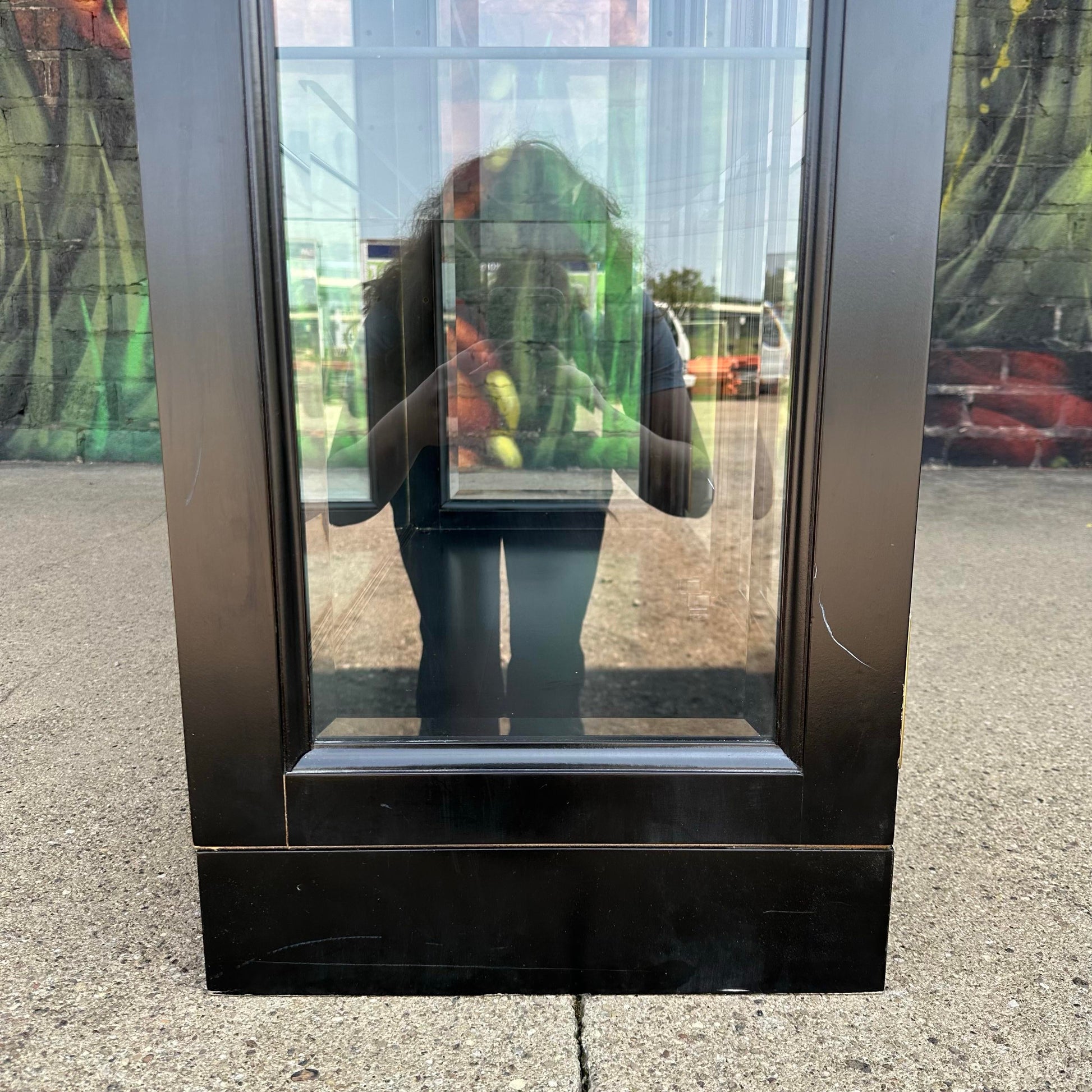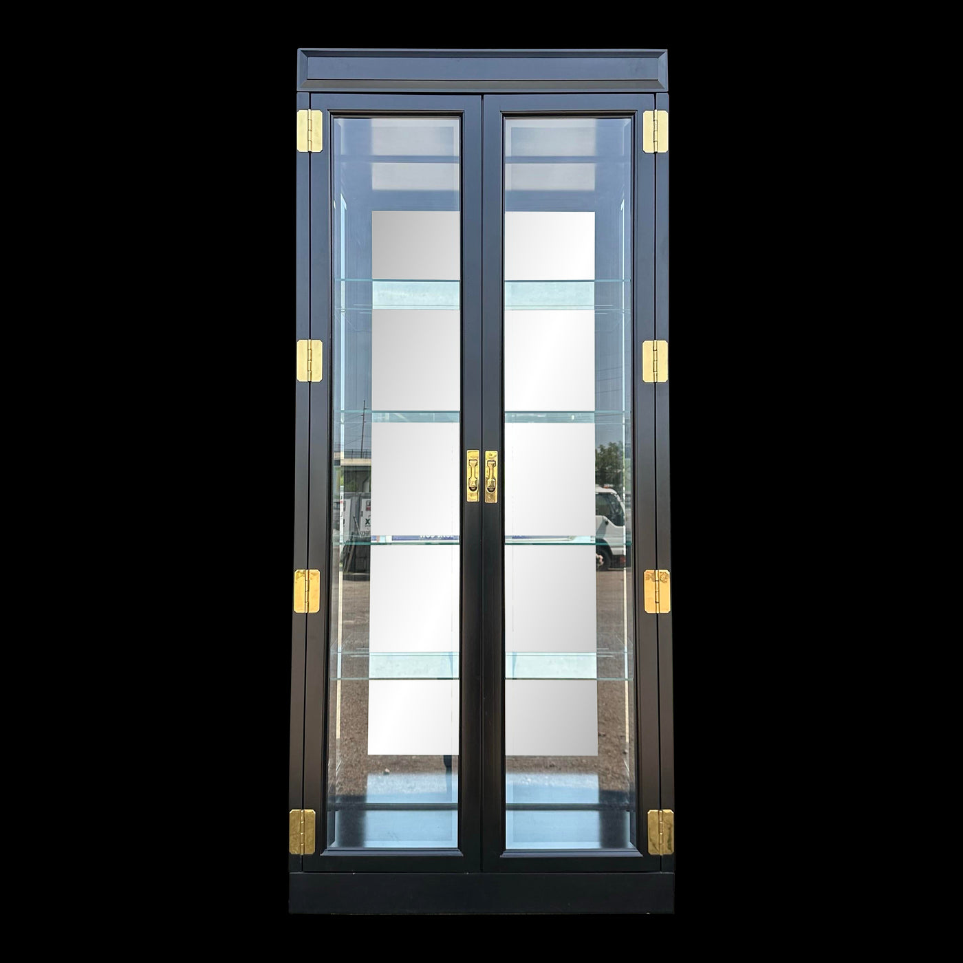 This beautiful display cabinet by Jasper Cabinet features an eye catching semi-gloss black finish with contrasting brass hardware perfect to accentuate any items you wish to display inside. There is an original, functioning light centered in the top of the cabinet to highlight your collection through all four adjustable glass shelves. We have two of these available.