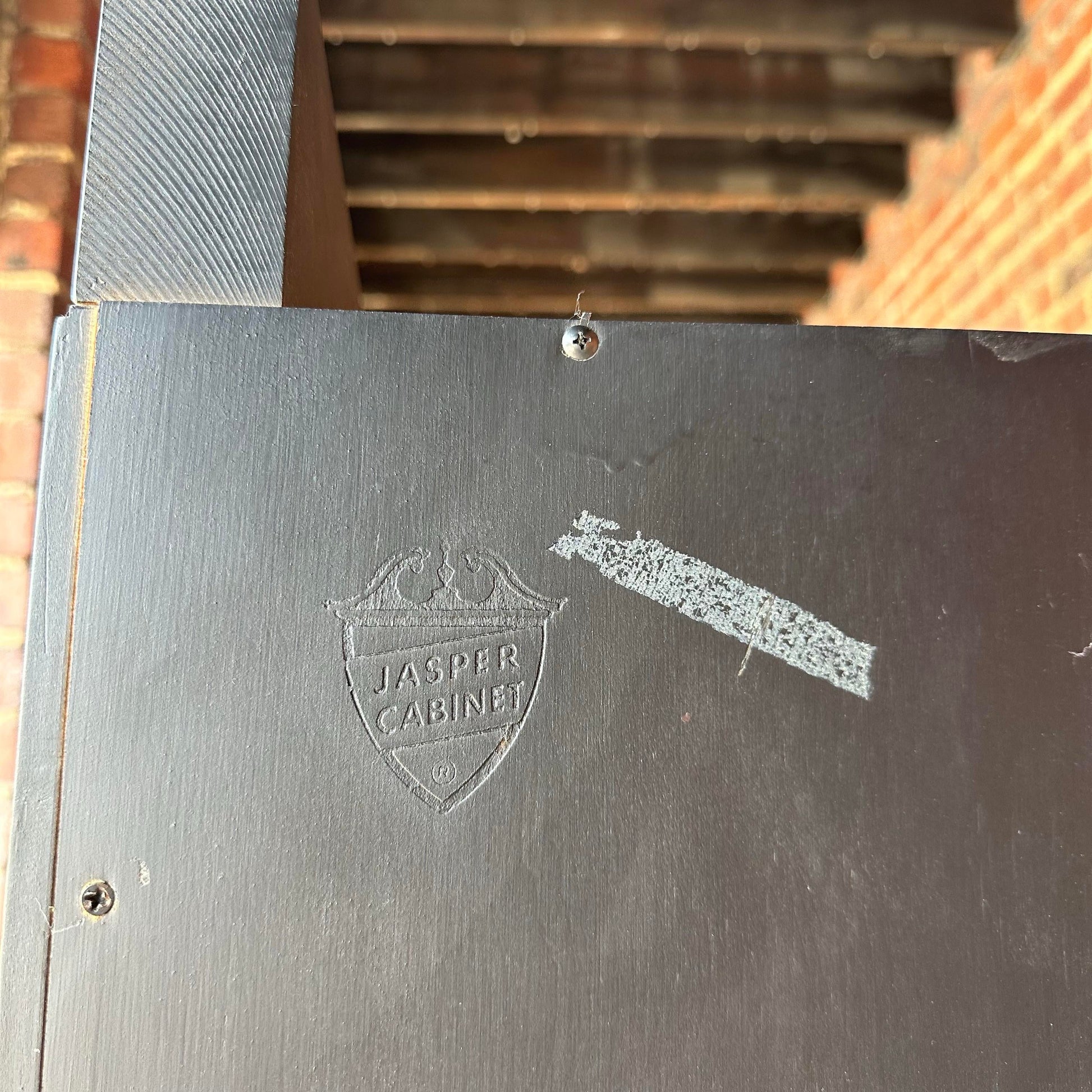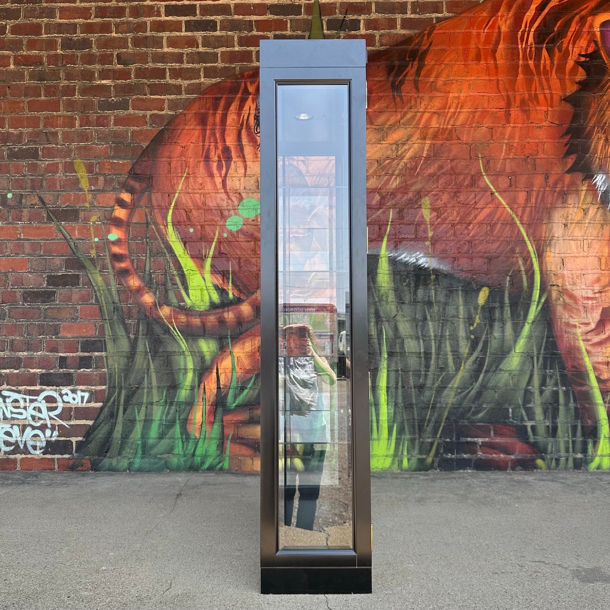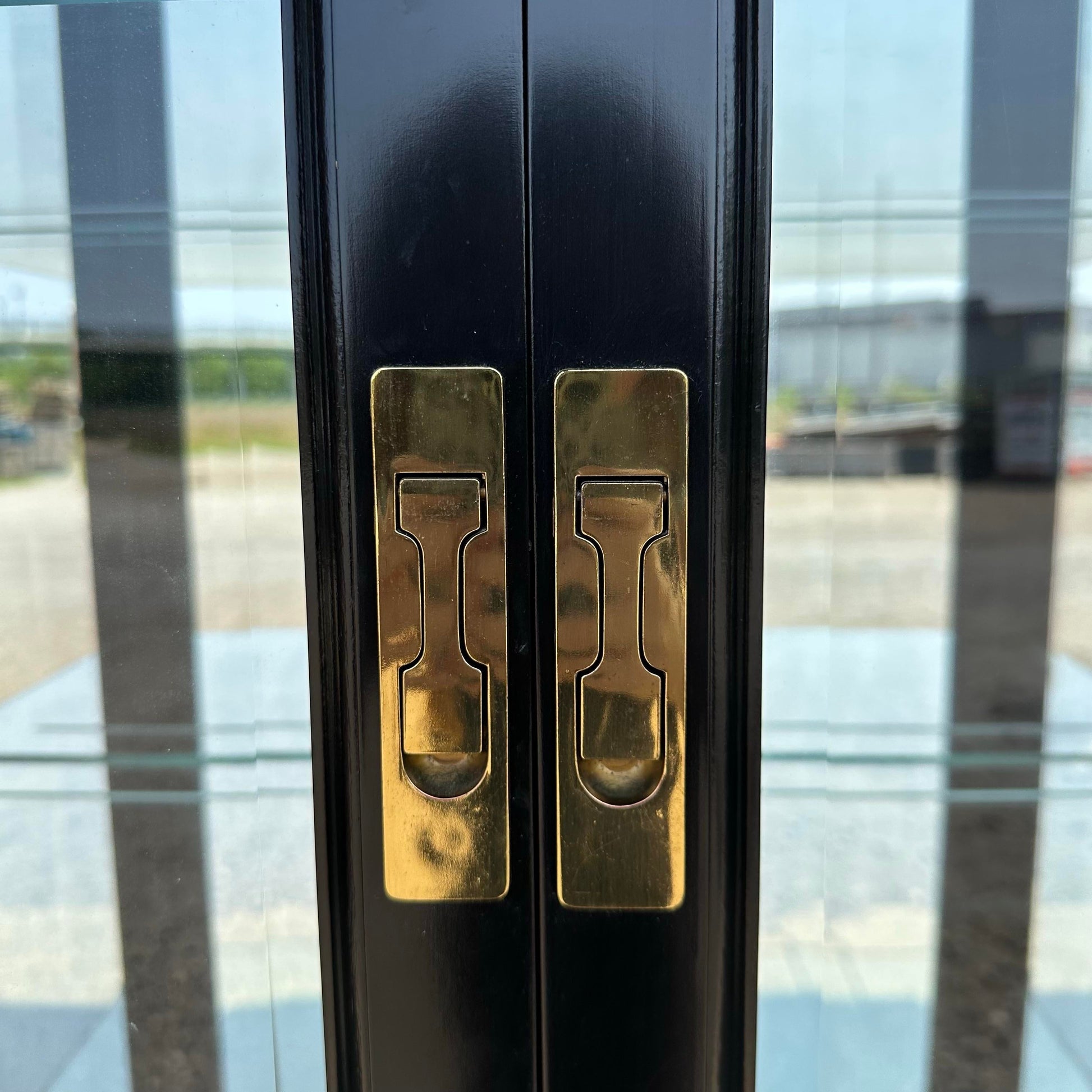 .This beautiful display cabinet by Jasper Cabinet features an eye catching semi-gloss black finish with contrasting brass hardware perfect to accentuate any items you wish to display inside. There is an original, functioning light centered in the top of the cabinet to highlight your collection through all four adjustable glass shelves. We have two of these available.
