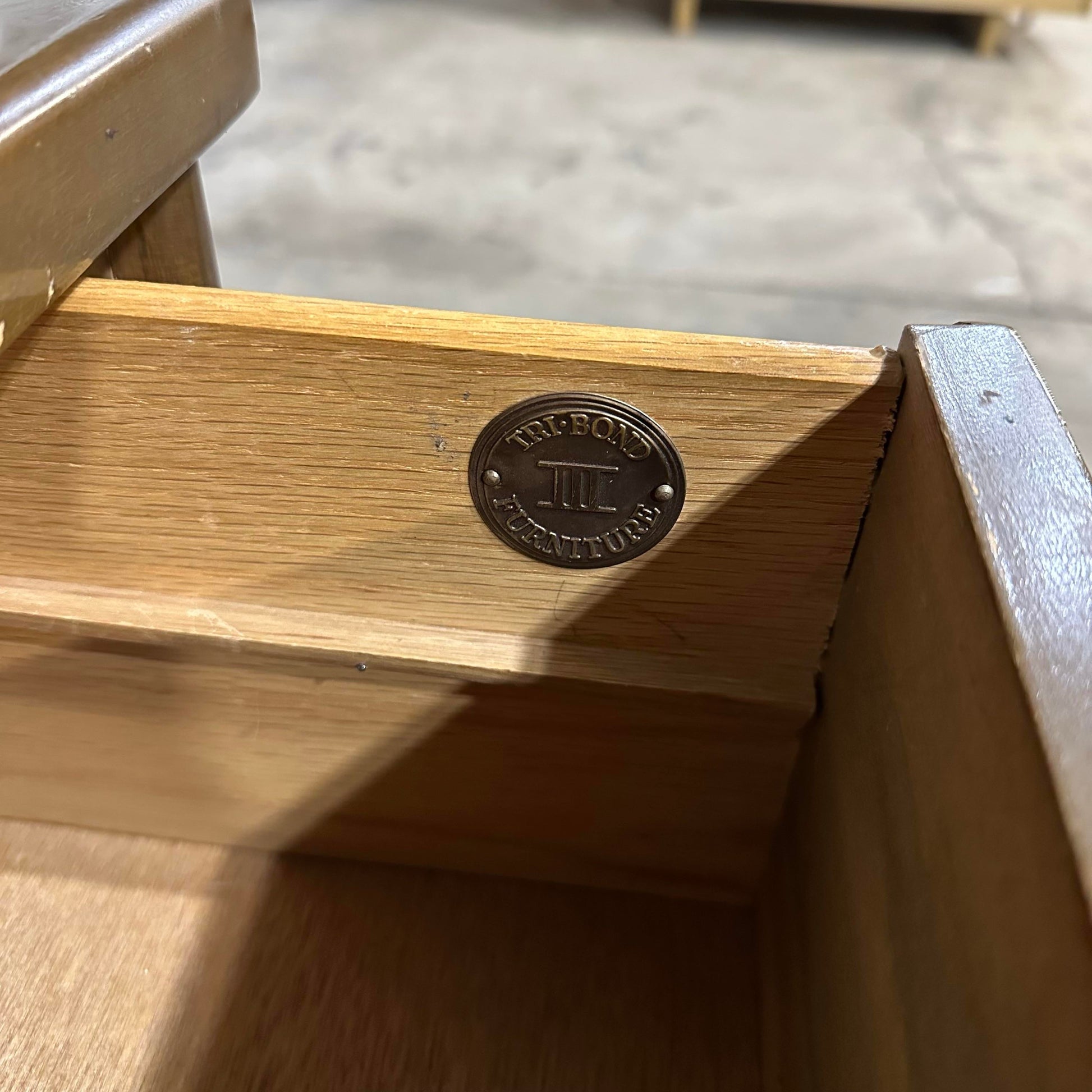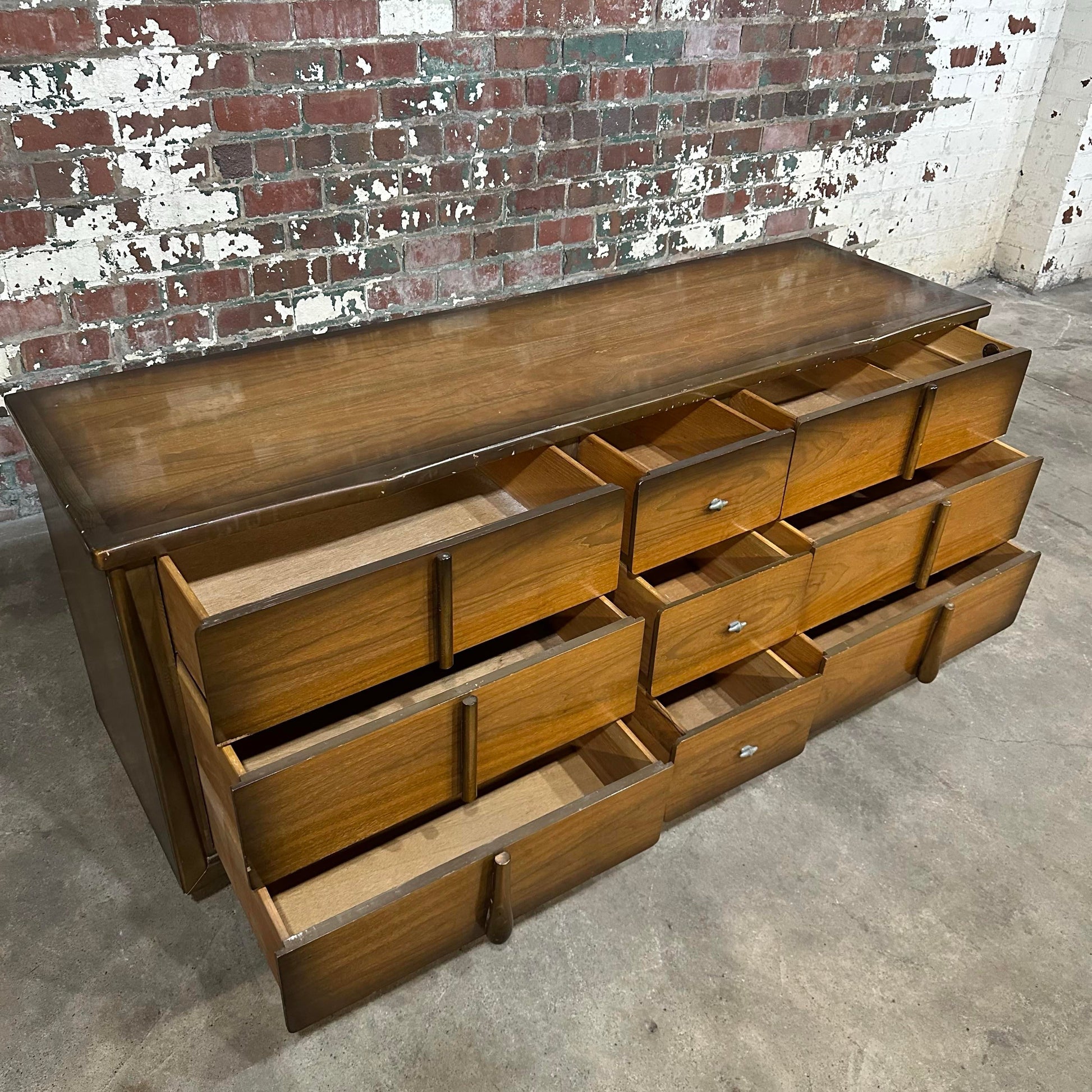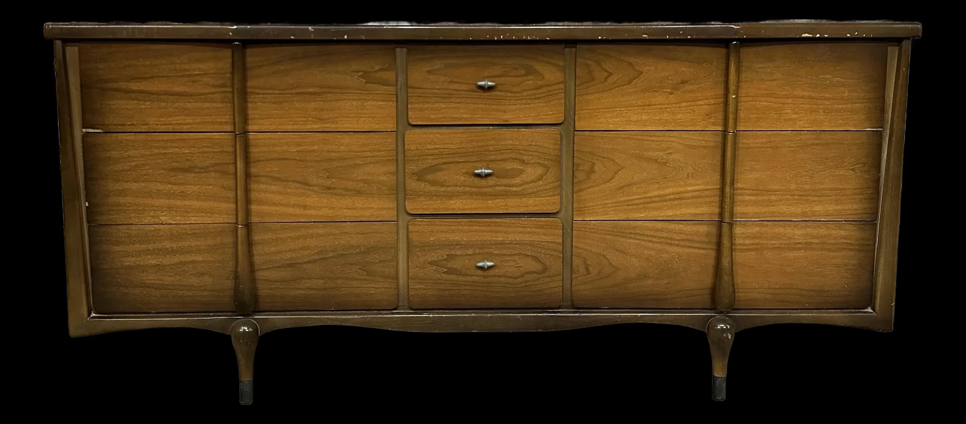 Mid-century modern 9 drawer dresser. This peice is by Tribond furniture and features interesting curves/angles and 3 aluminum drawer pulls.