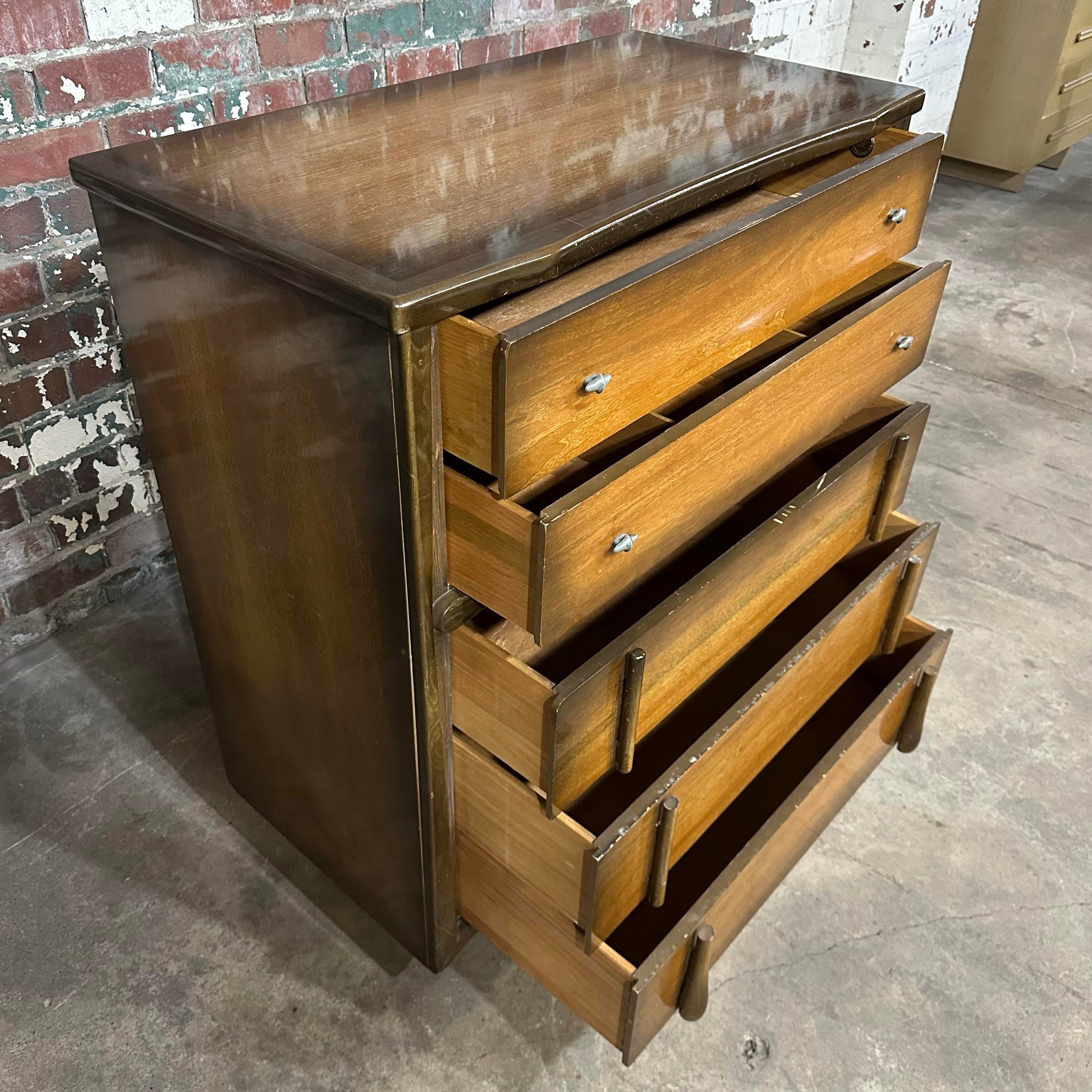 Mid-century modern highboy dresser by Tribold furniture with interesting curves and angles. There are 5 drawers and aluminum pulls.