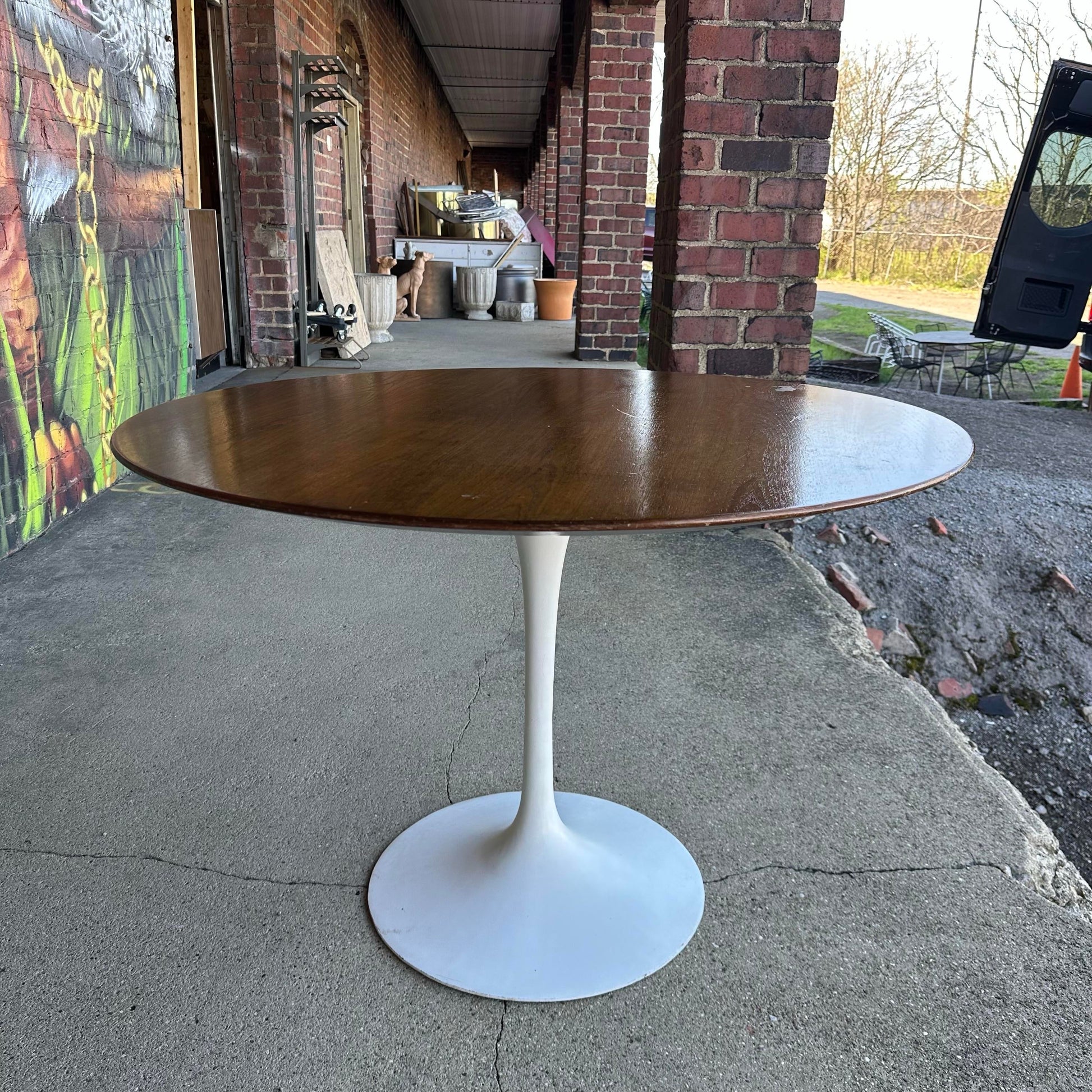 This table features a beautiful walnut top and metal tulip pedestal base. This is an iconic design that has been copied for years. There is a makers mark on the. Bottom side of the table.