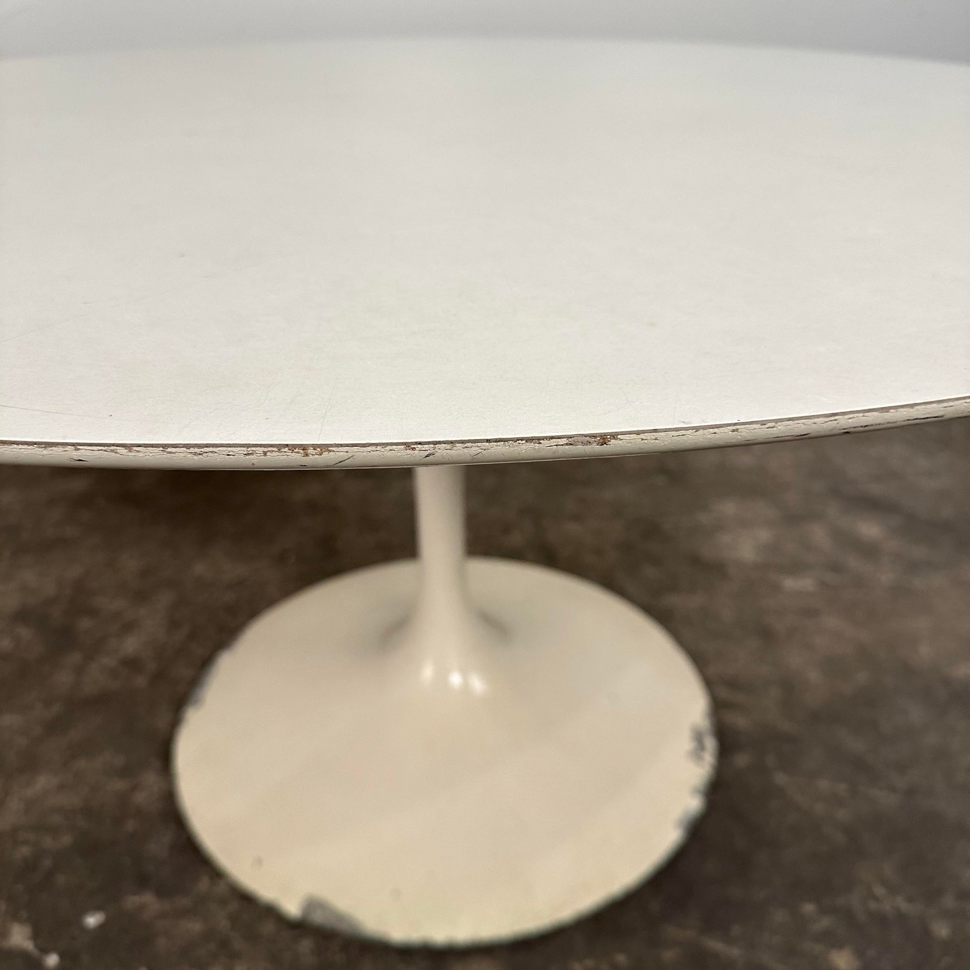 Mid Century Modern Eero Saarinen Knoll Tulip Dining Table. The table is designed by Saarinen for knoll furniture. The table features a metal tulip base and a circular laminate table top. There is no makers mark on the table.