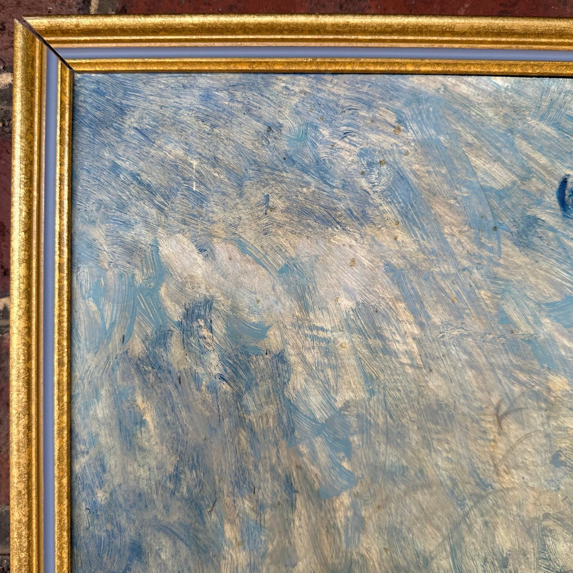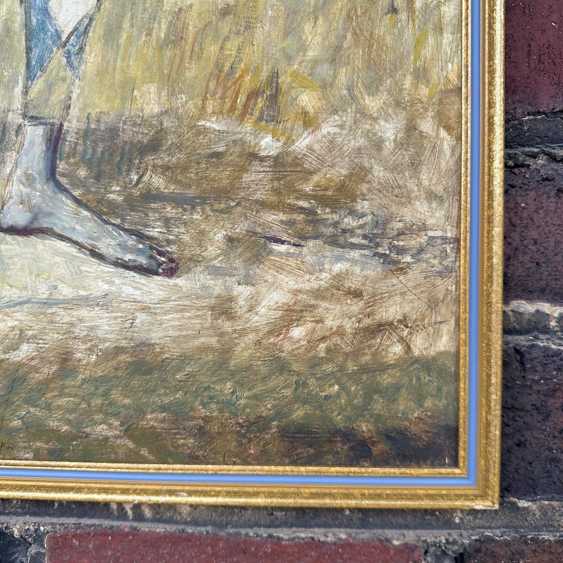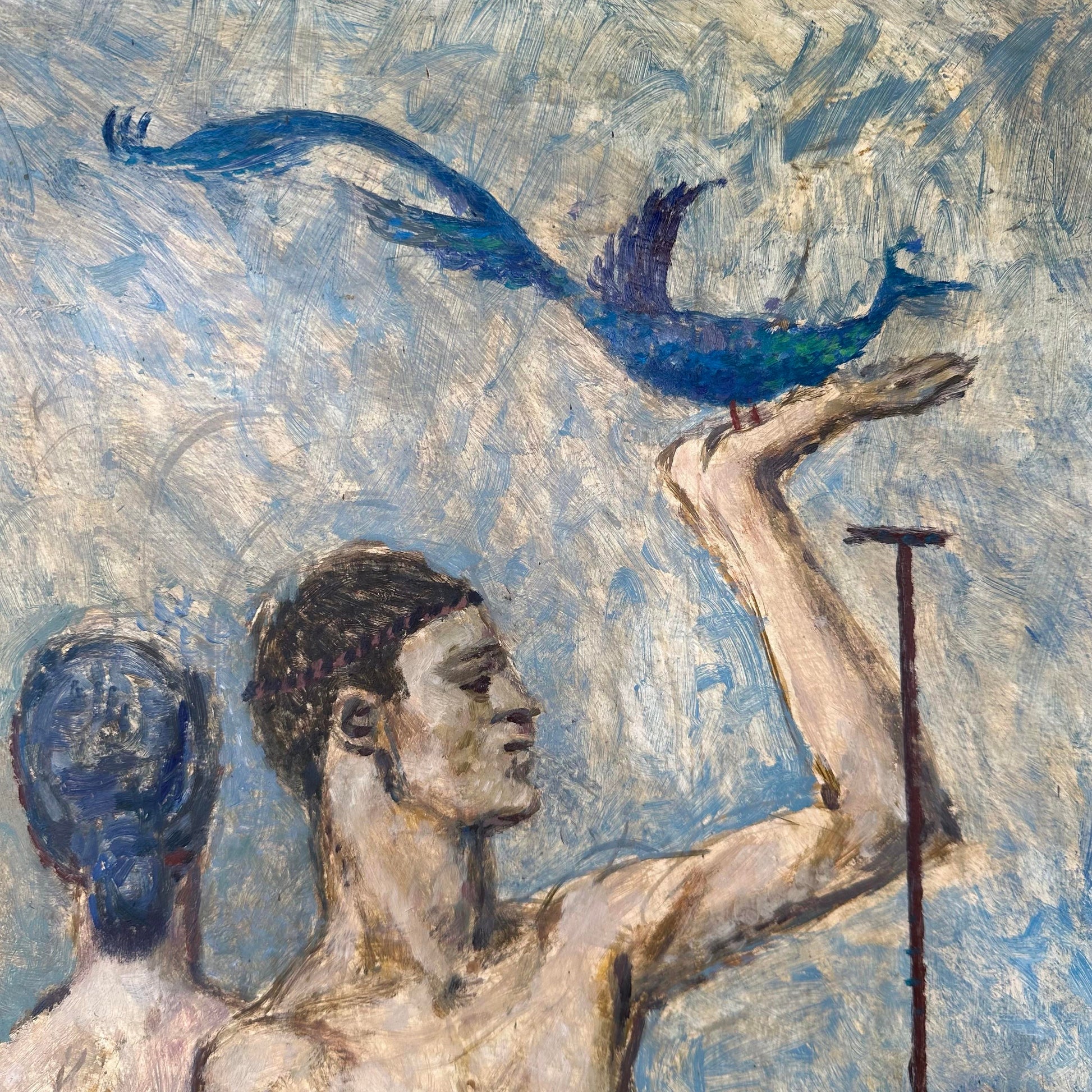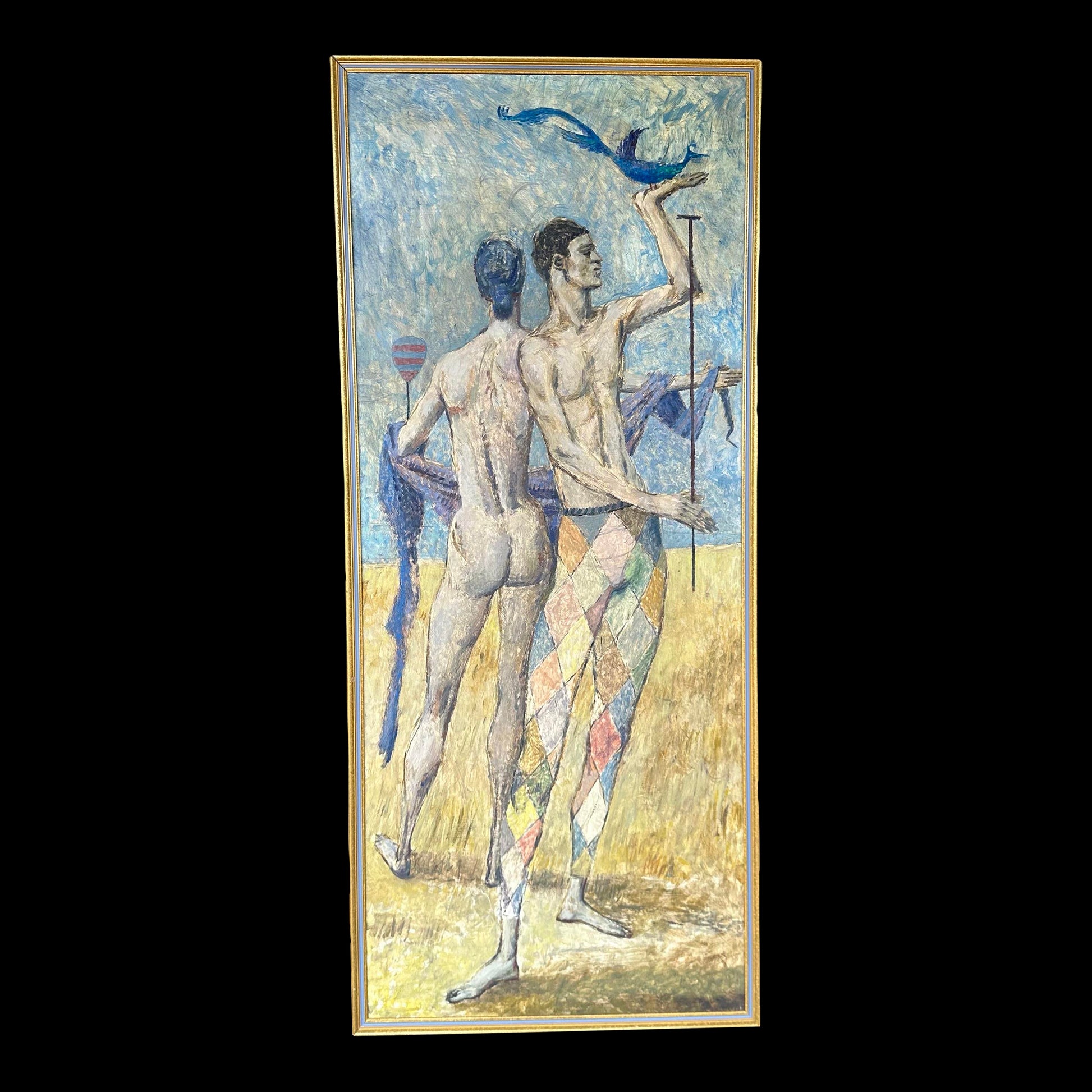 Mid-century modern painting by Robert C. Brisley. This piece depicts two people in a field, one nude and the other with colorful patterned pants on holding a blue bird. There is a sticker on the back from a Cleveland, Ohio based frame shop.