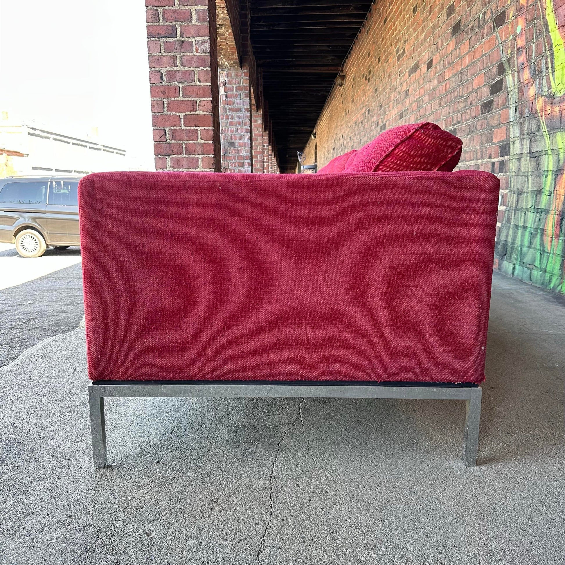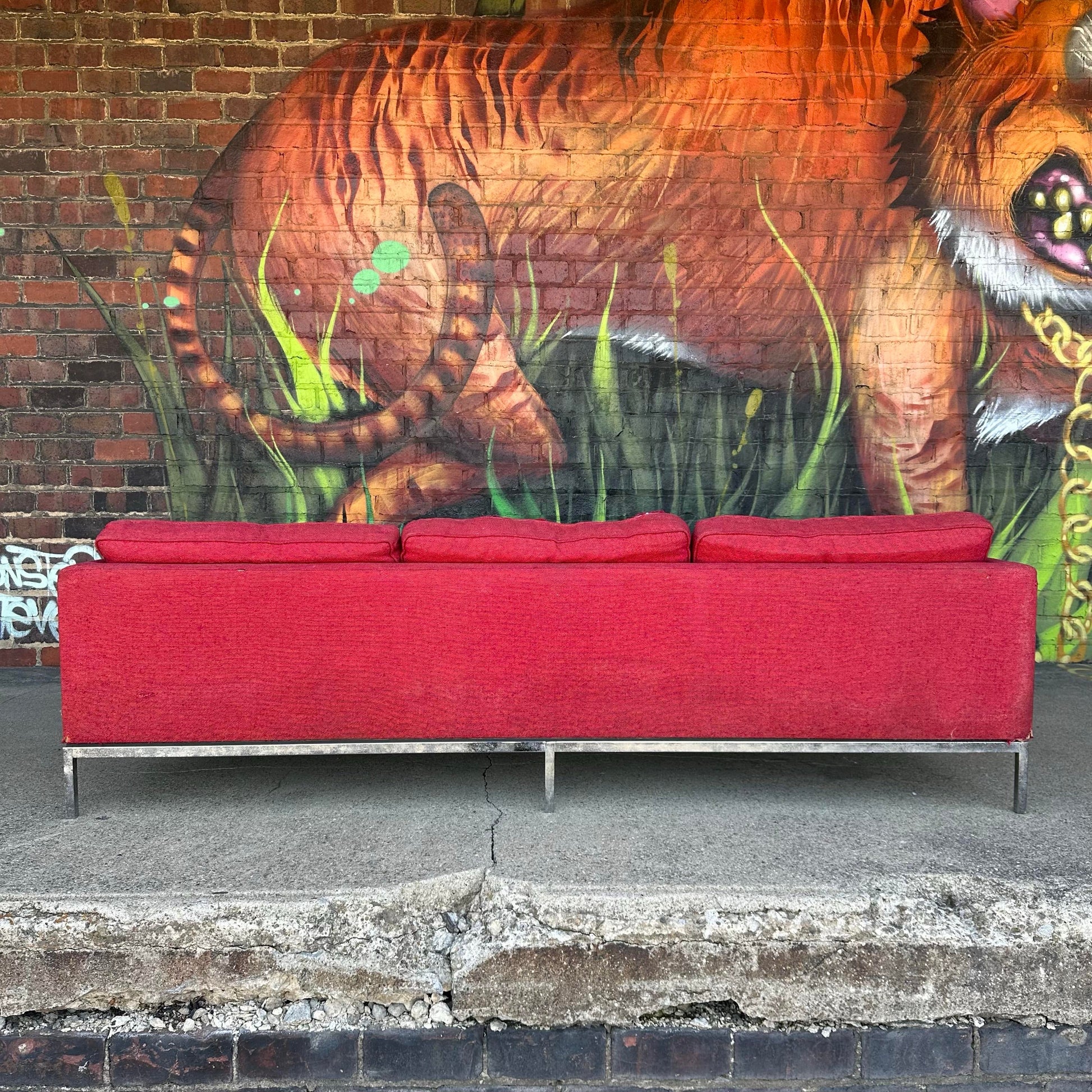 This Florence Knoll sofa is vintage and Features a chrome frame and supports in minimal rectilinear pillars, the body of the sofa is upholstered in a red fabric. The sofa has three seat cushions and back supports. This sofa is a gorgeous example of work of Florence Knoll, known for bringing modernist design sensibilities into the office space and thoughtfully using geometric minimal designs with humanizing materials, form, and colors. There is a makers mark.