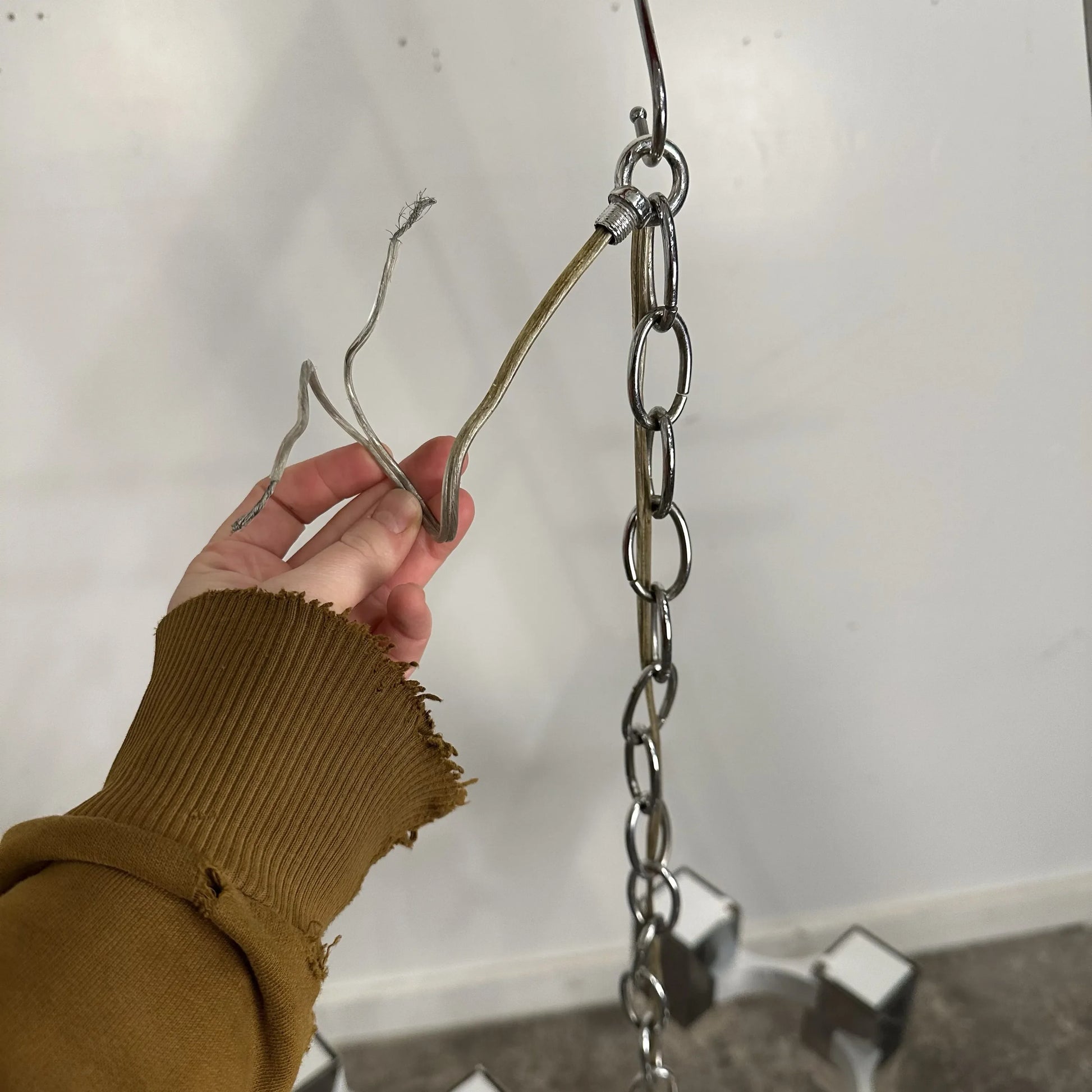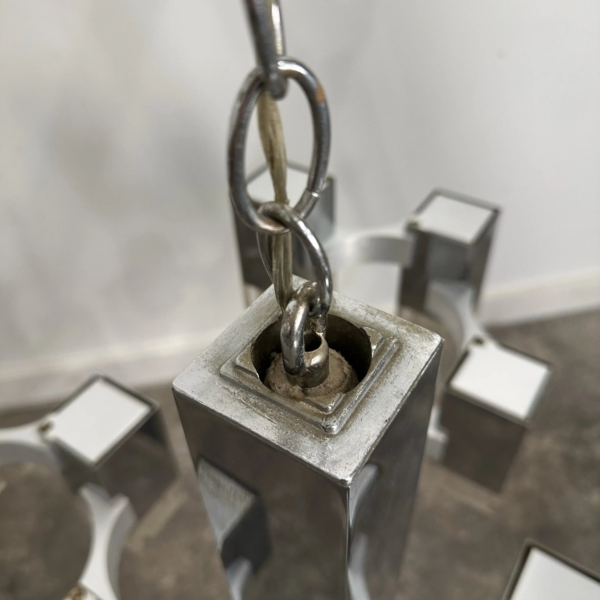 This iconic chandelier is by Italian company Gaetano Sciolari produced in the 1970. The chandelier is composed of 17 cube shaped acrylic lights that attached to a geometric chrome and brushed metal structure. The chandelier hangs from a metal chain. There is no makers mark on the chandelier.