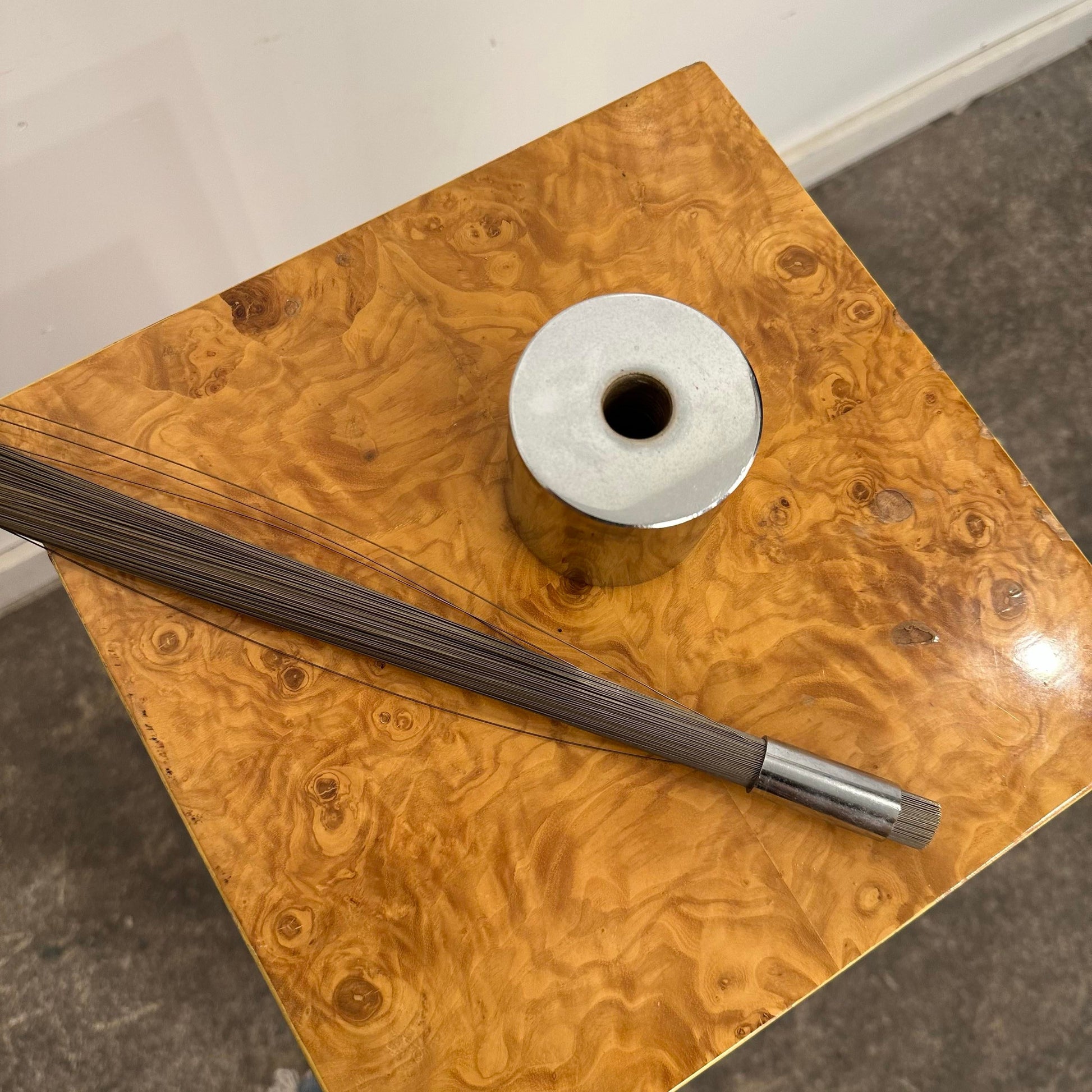 Mid Century Modern Harry Bertoia Style Spray Sculpture Chrome. This piece is inspired by a Harry Bertoia sculpture. This spray sculpture consisting of a chrome weighted base and a spray of light chrome wire kinetic strands suspended above. The light strands bounce and sway in the freely. The piece is marked Dave Grossman design.