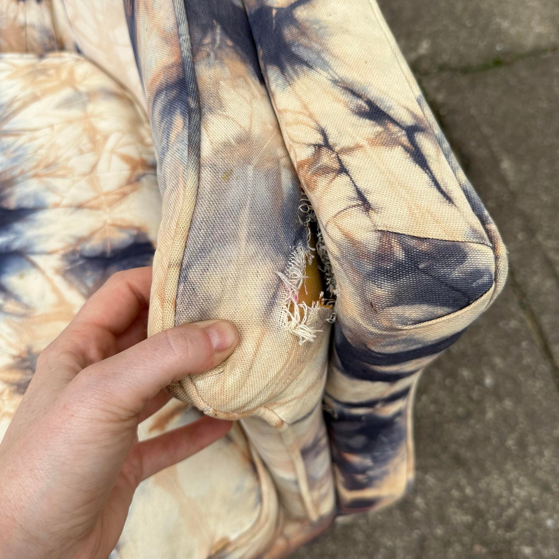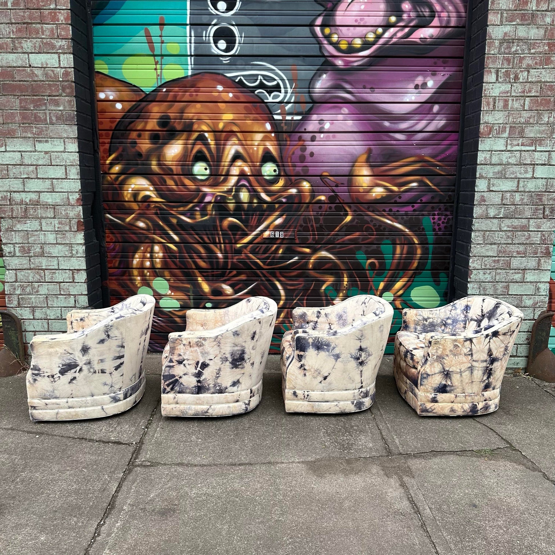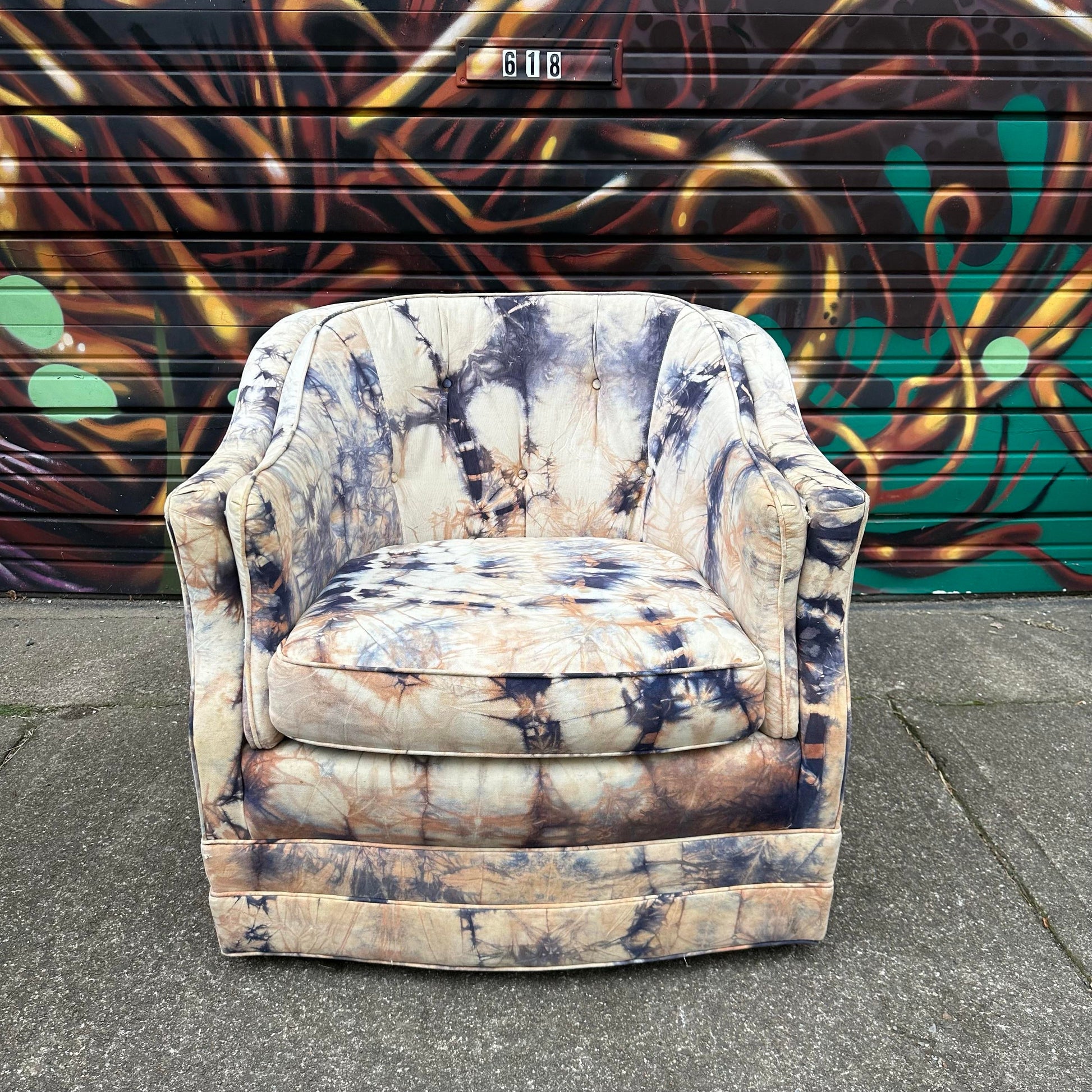 Mid century Henredon barrel back swivel lounge chairs. The chairs have a swivel mechanism as well as casters. The fabric is a tie dye style design. The chairs have a Henredon tag on the seat. We have a Set of 4 but we are selling them individually.