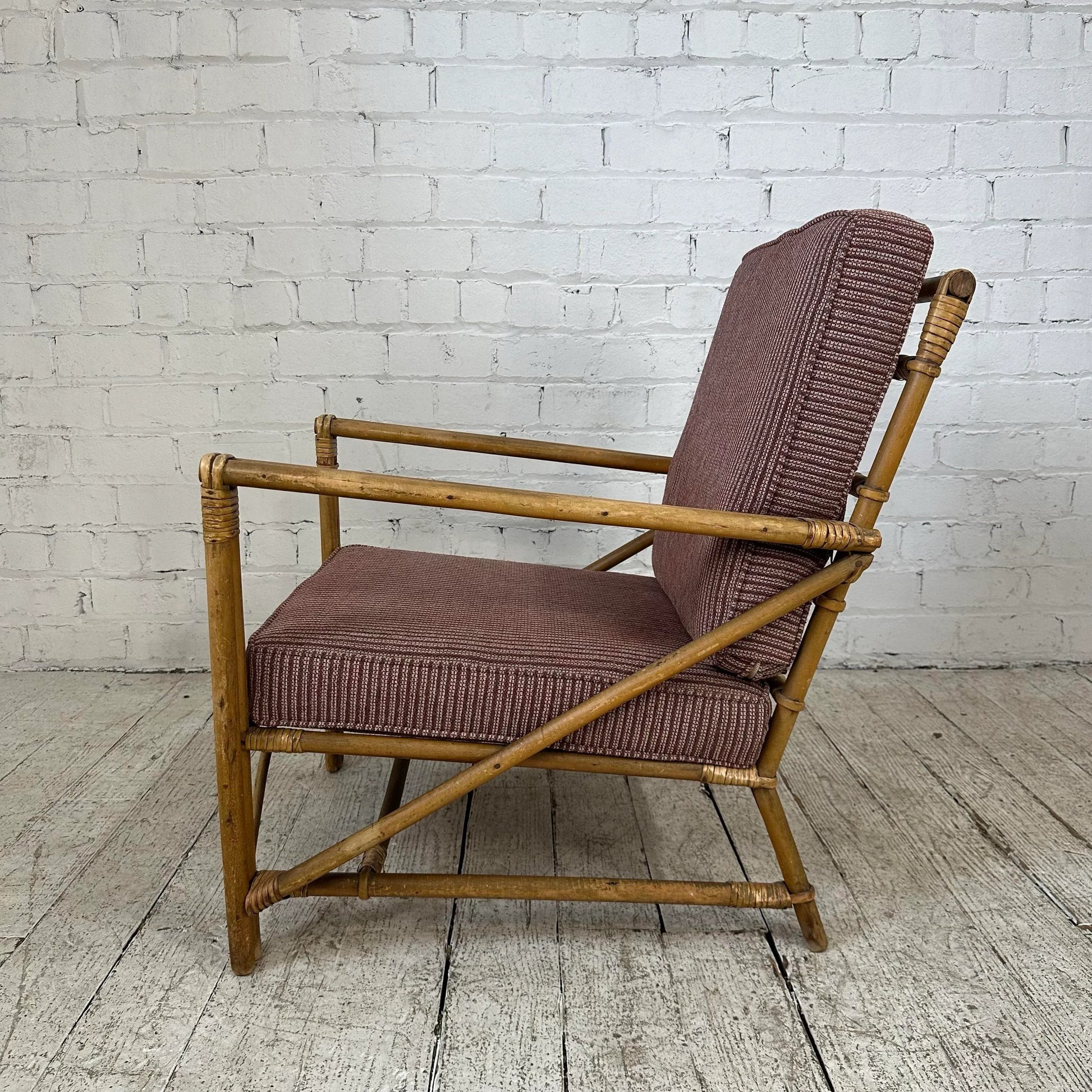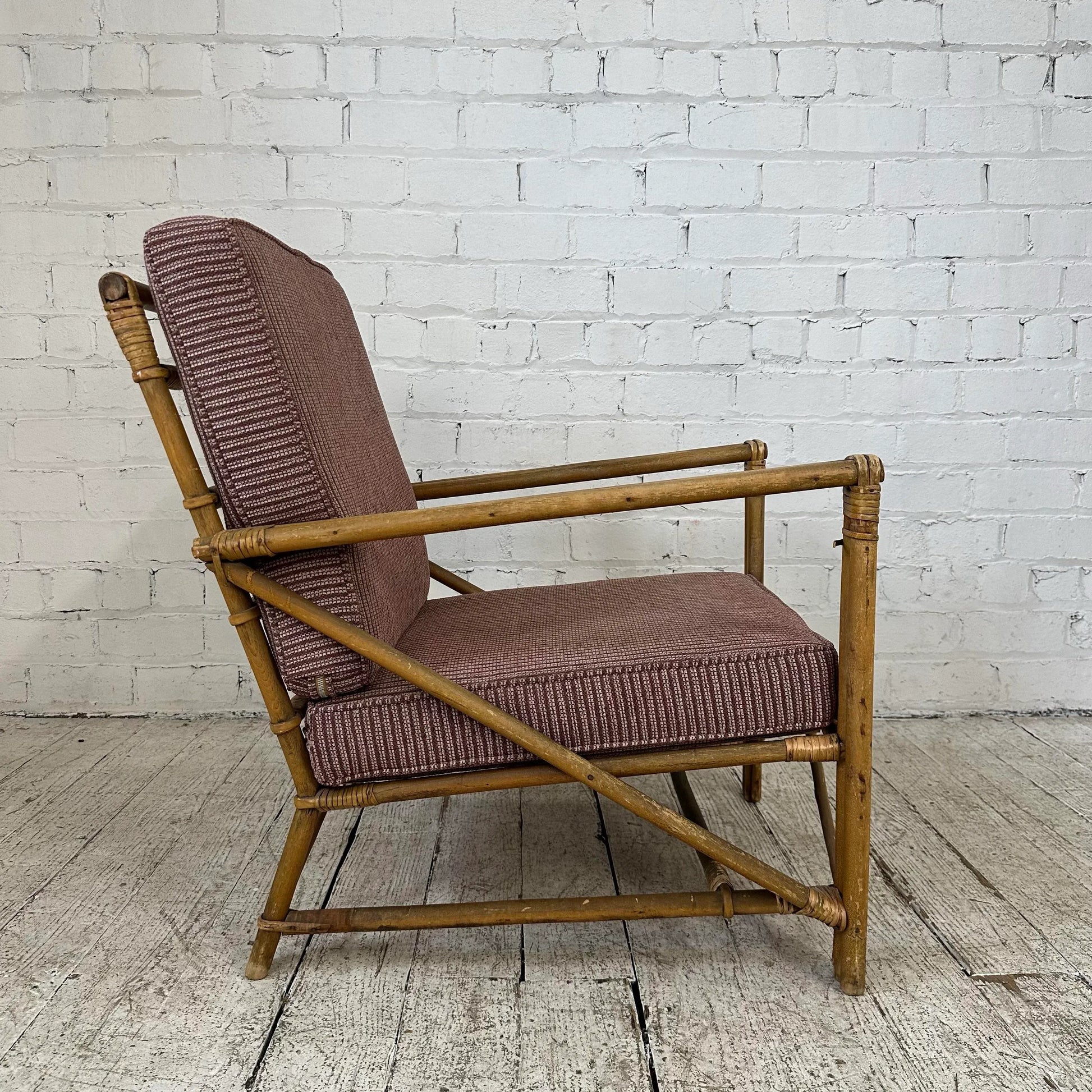 Mid Century Modern Bamboo Lounge Chair. This chair features an eye catching MCM lounge arm chair design. The base is made of solid bamboo with caning wrapped around the corners. The back and seat rest cushion are upholstered in a maroon striped fabric. There’s no makers mark on the chair.