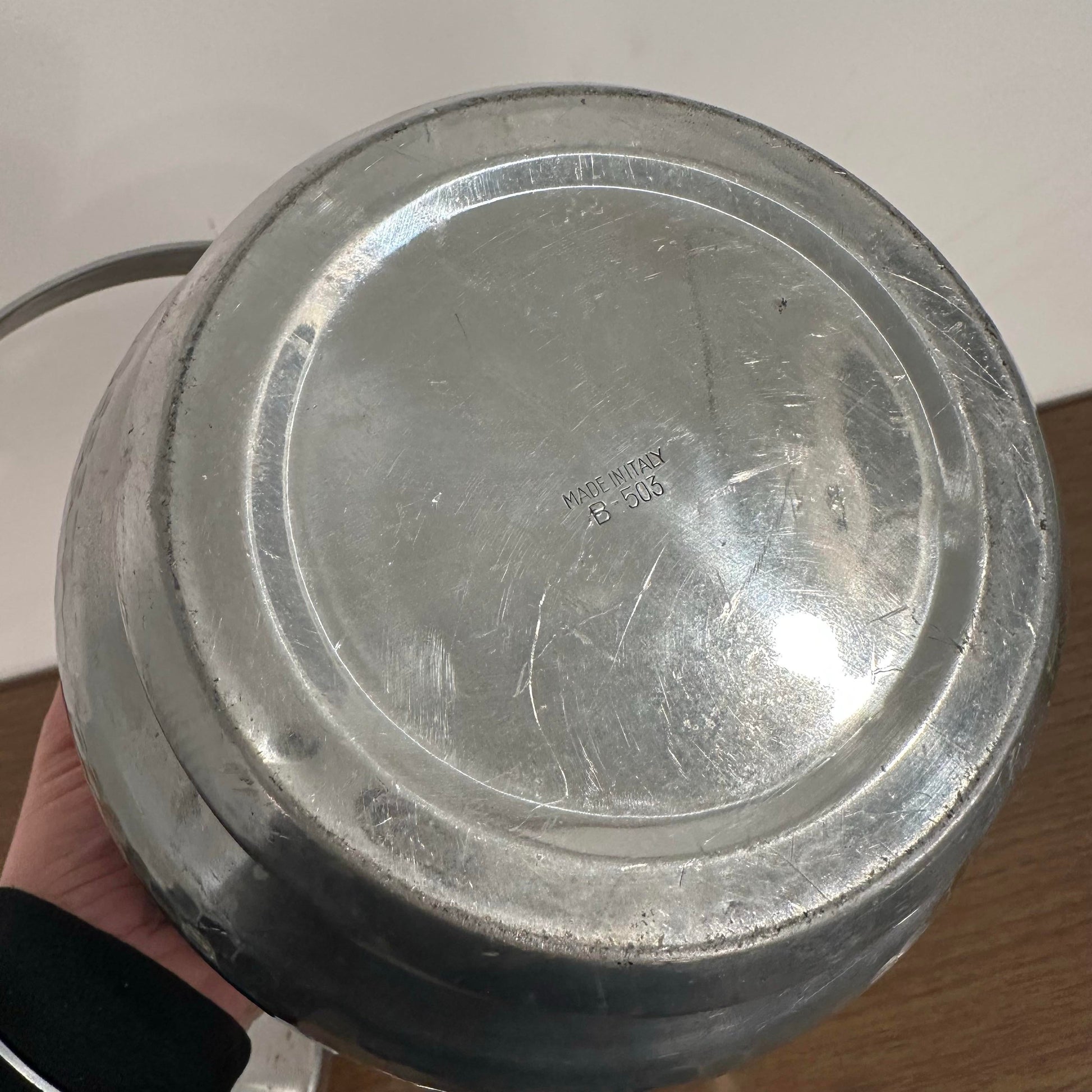 Mid-Century Modern Italian ice bucket featuring hammered aluminum detailing and a ridged handle. “Made in Italy B503” stamp on bottom.