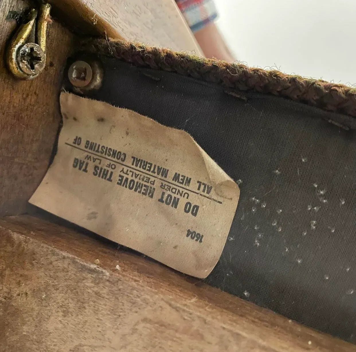 The seat and back are upholstered In a orange/brown fabric. The base is a sold dark wood. Original tag on bottom.