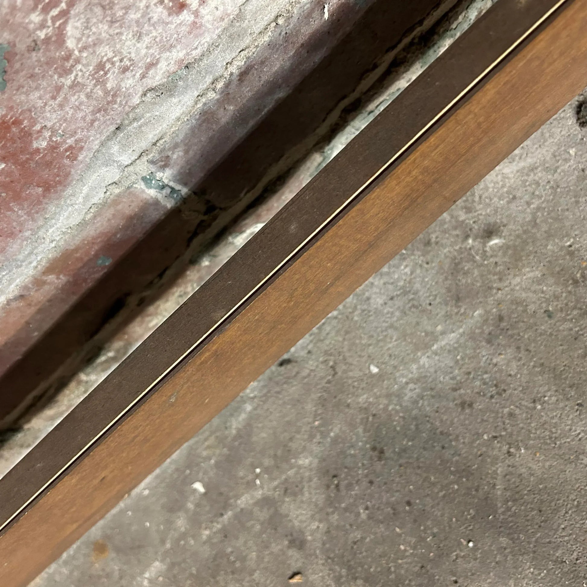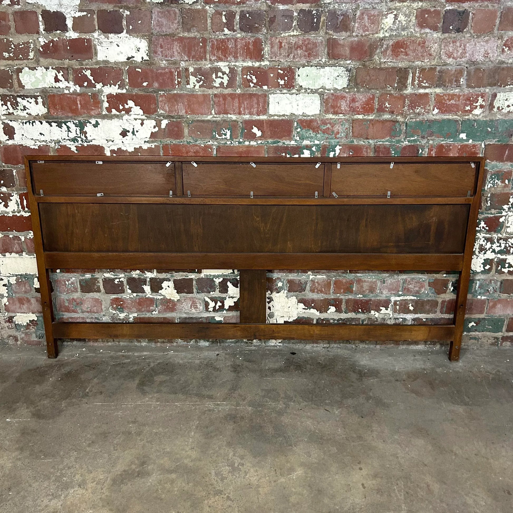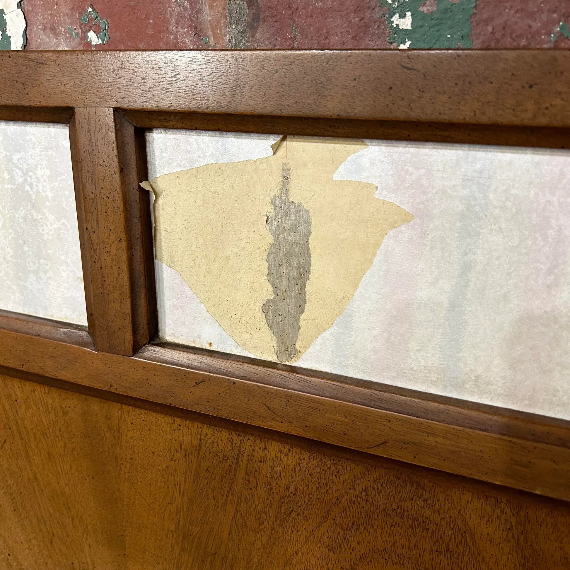 This mid century king size headboard is simple and classic in design. The three panels across the top are made of walnut and are reversible. The other side of the panels have been covered in an unfortunate wallpaper choice but would look great covered in anything else (leather, caning, a textile, or even another wood veneer). The wood has a speckled antique finish.