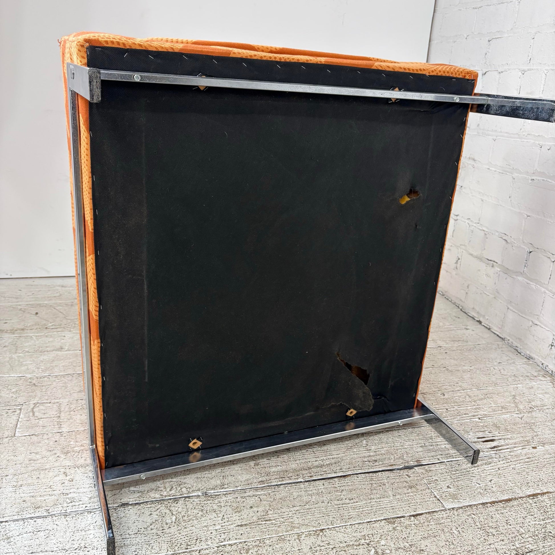 Mid Century Modern Knoll Style lounge Arm Chair. This chair features clean lines and a stlyish design with chrome legs and a cube shaped seat. We are unsure of the maker of this chair but we believe it was styled after a knoll design.
