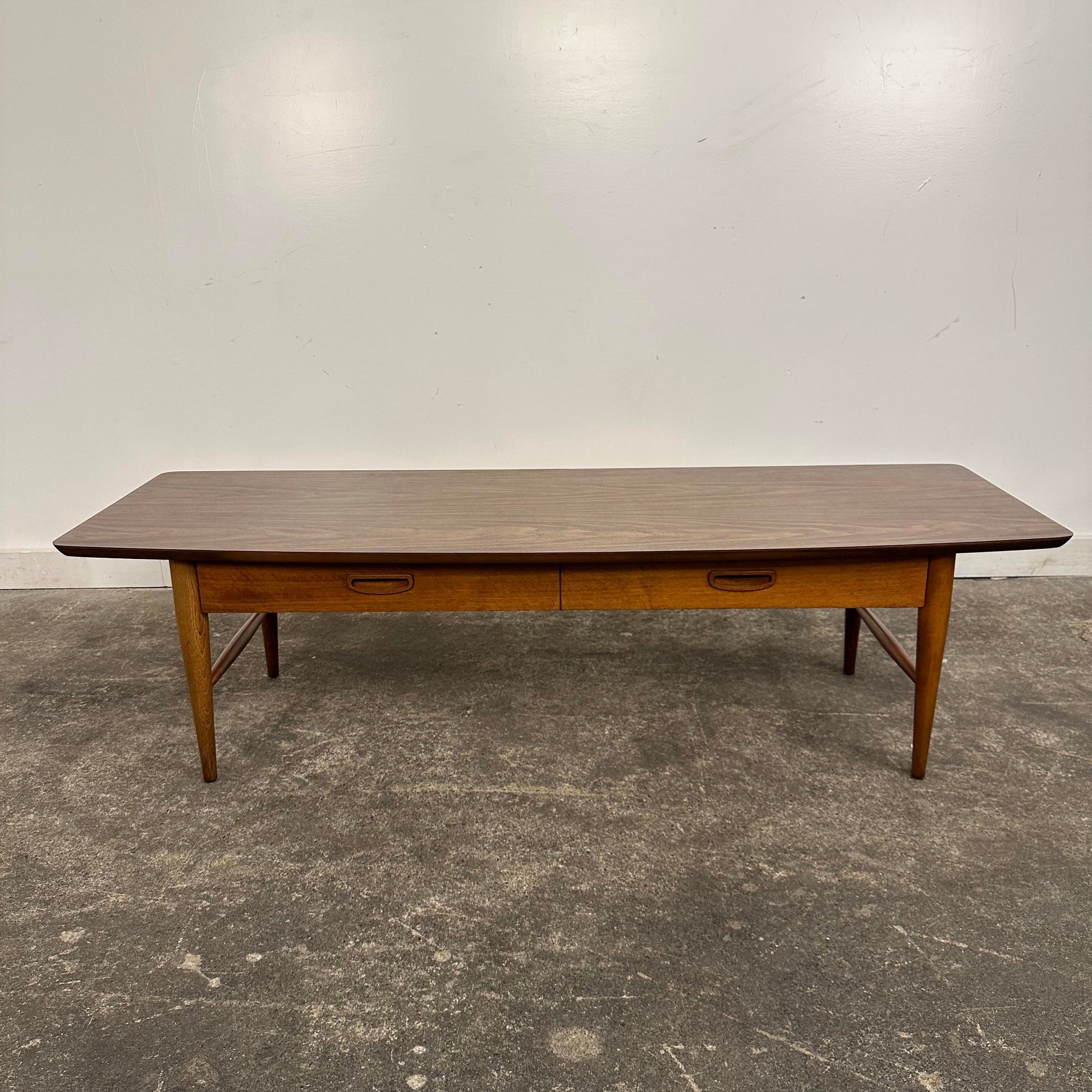Mid-Century Modern Lane coffee table with walnut base and laminate top. This pieces features one large drawer for storage and a rounded rectangular shape. Makers mark on the inside of drawer.