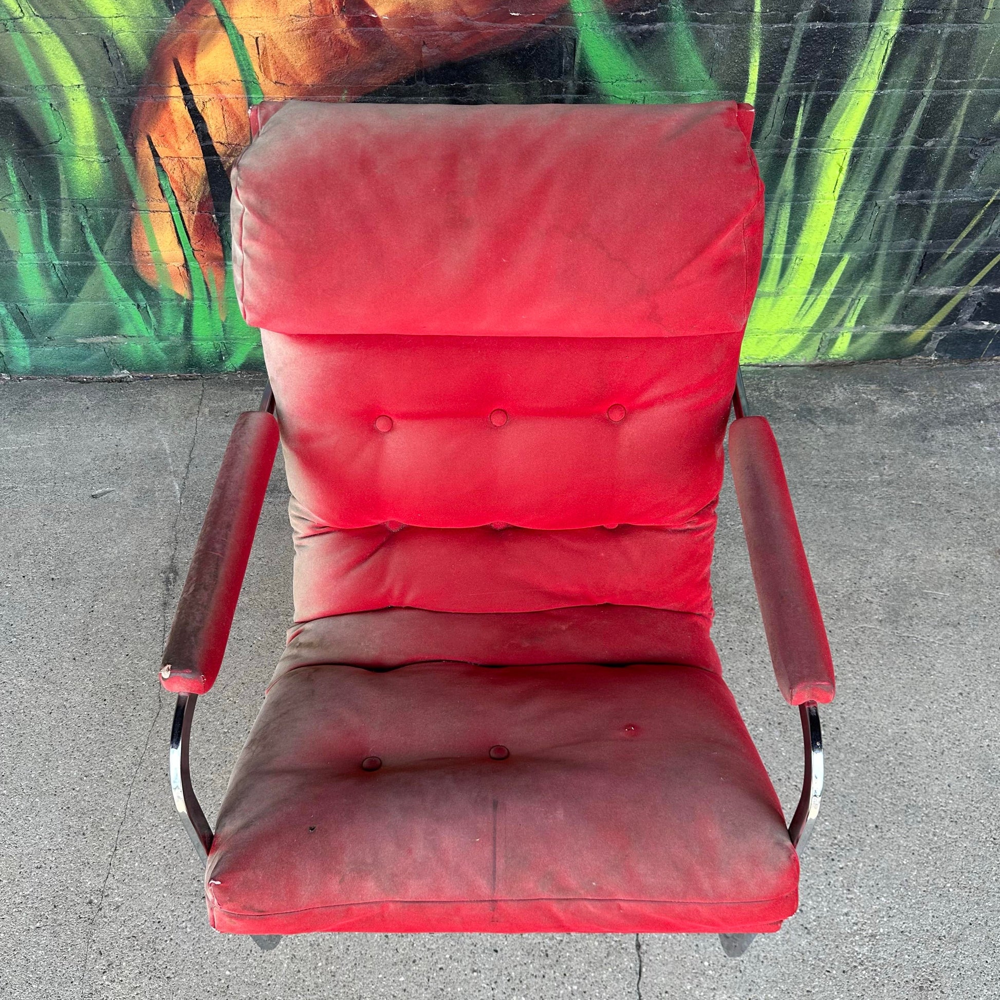 Mid Century Modern Milo Baughman for Carson Inc. Chrome Cantilever Lounge Chair. This chair features a polished chrome frame and a red velvet upholstery there is a Carson’s inc. tag on the bottom of the chair .