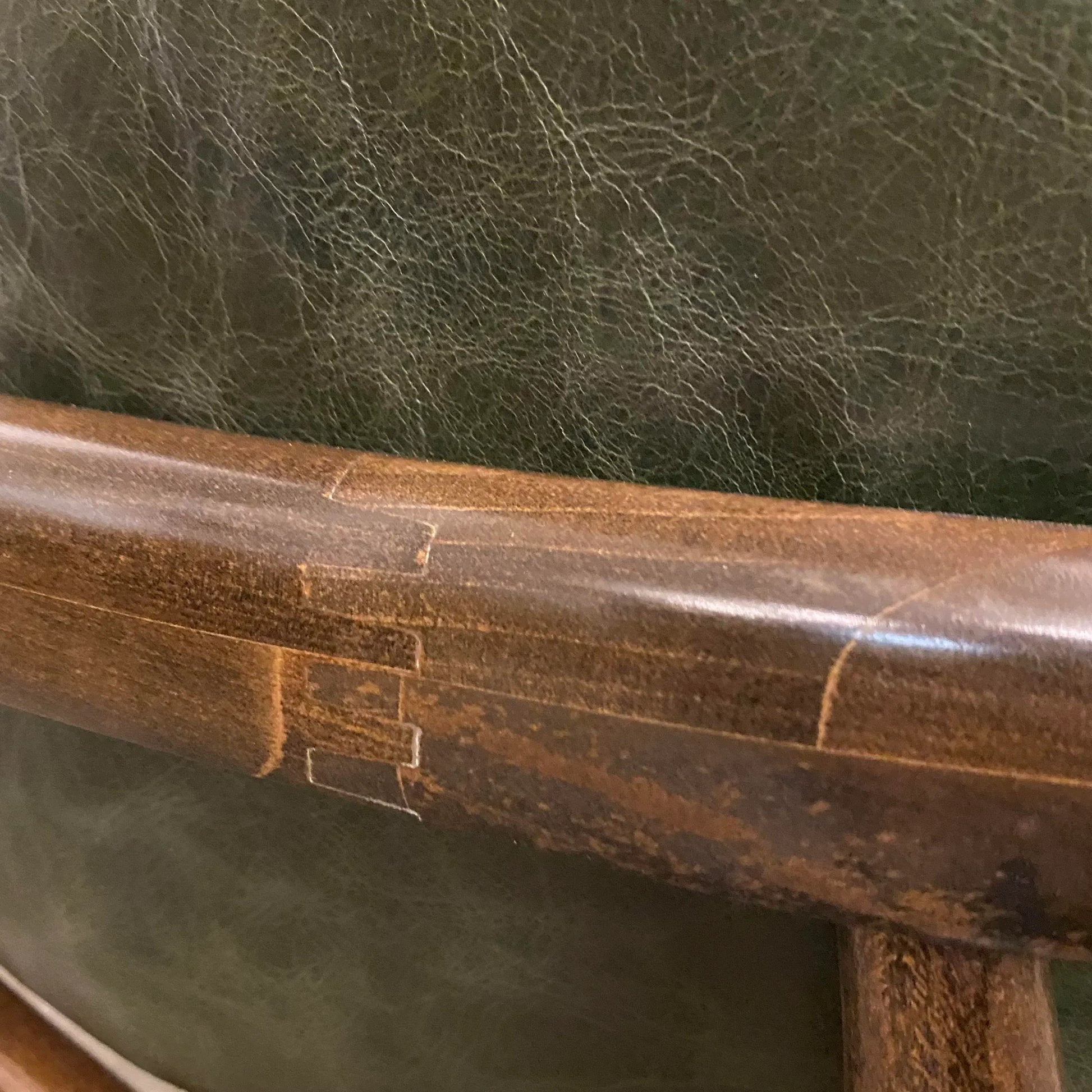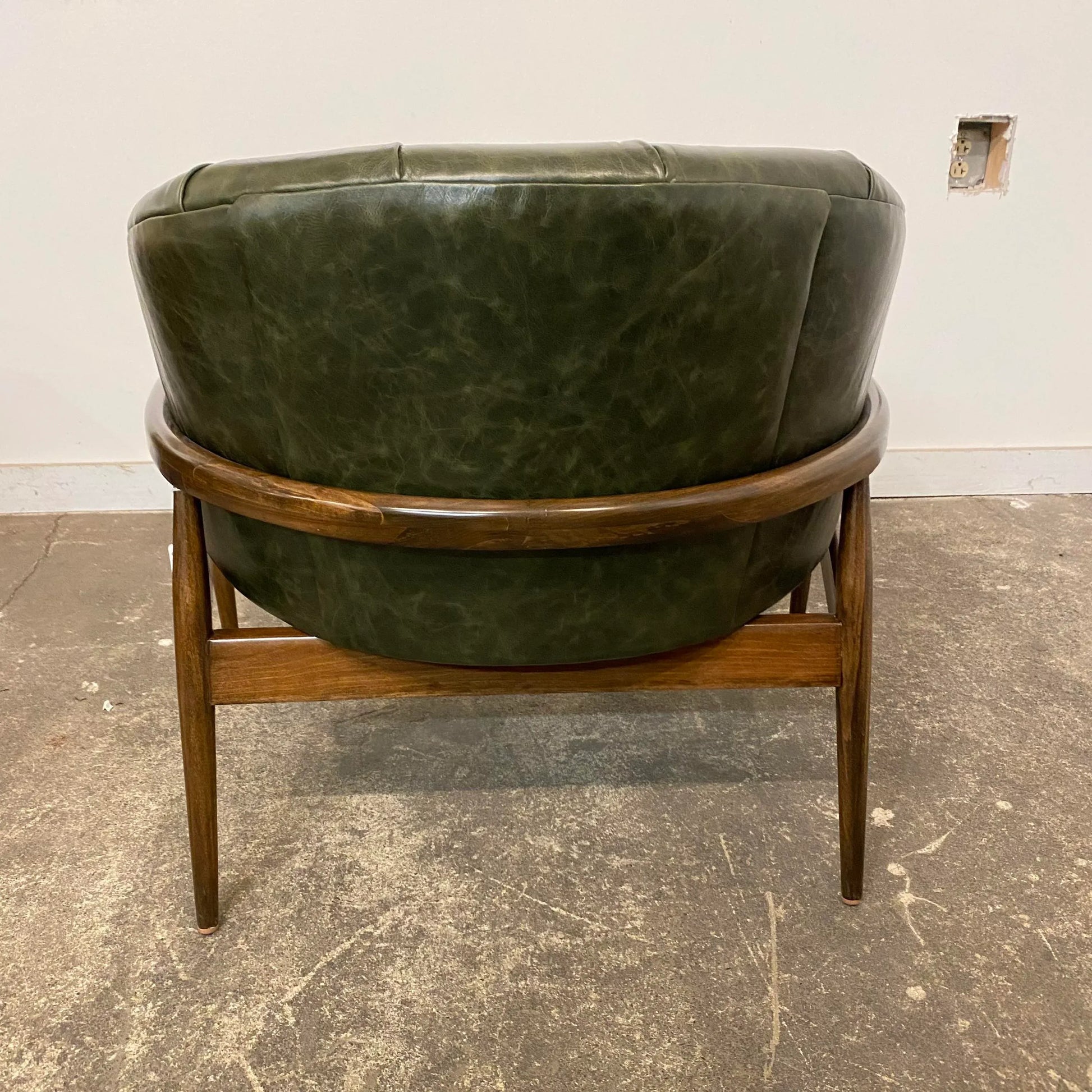 In the style of Milo Baughman barrel back chair refinished reupholstered in distressed green leather. This is a wonderfully restored mid century piece.