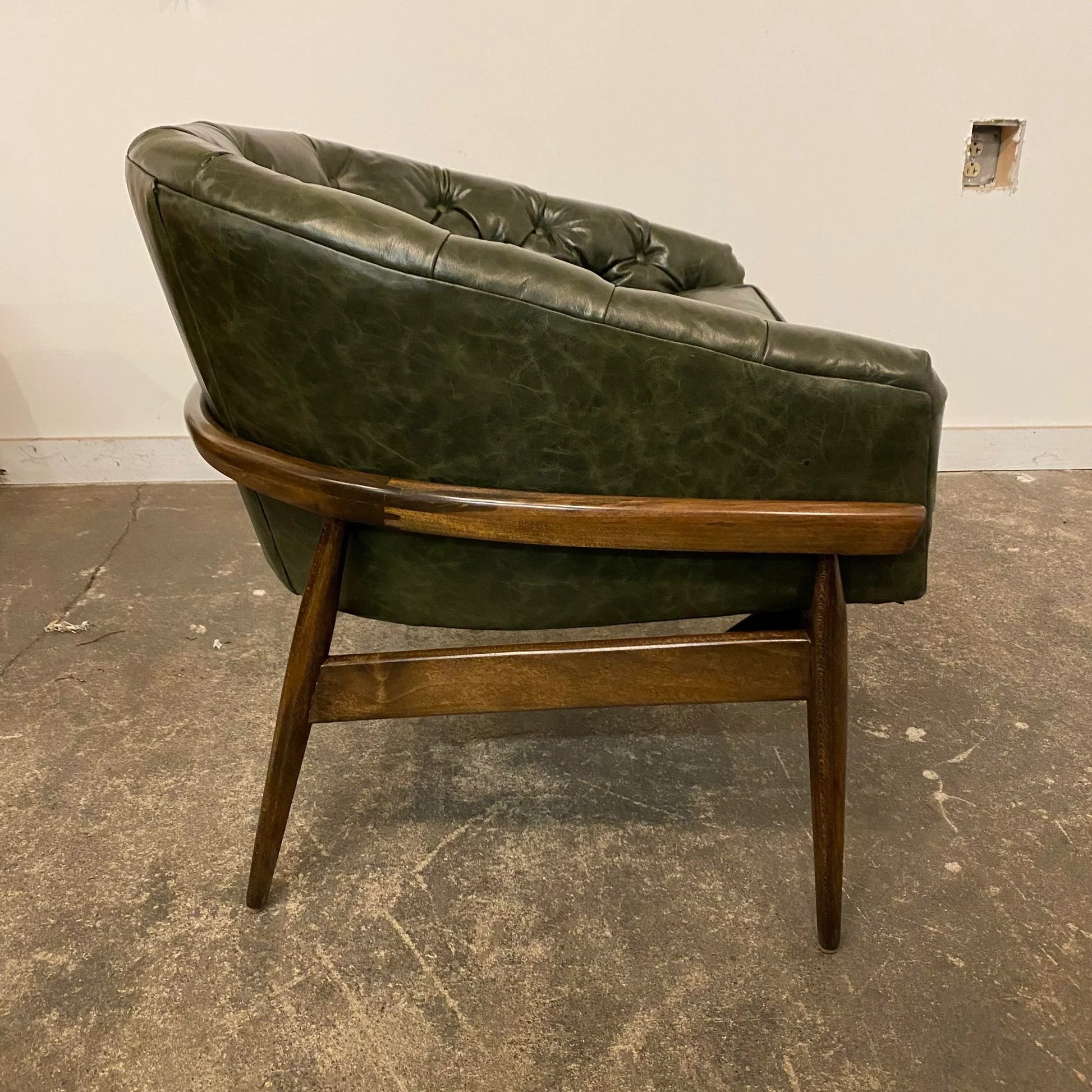 Mid Century Modern Milo Baughman Style Reupholstered Leather Barrel Back Chair. Green