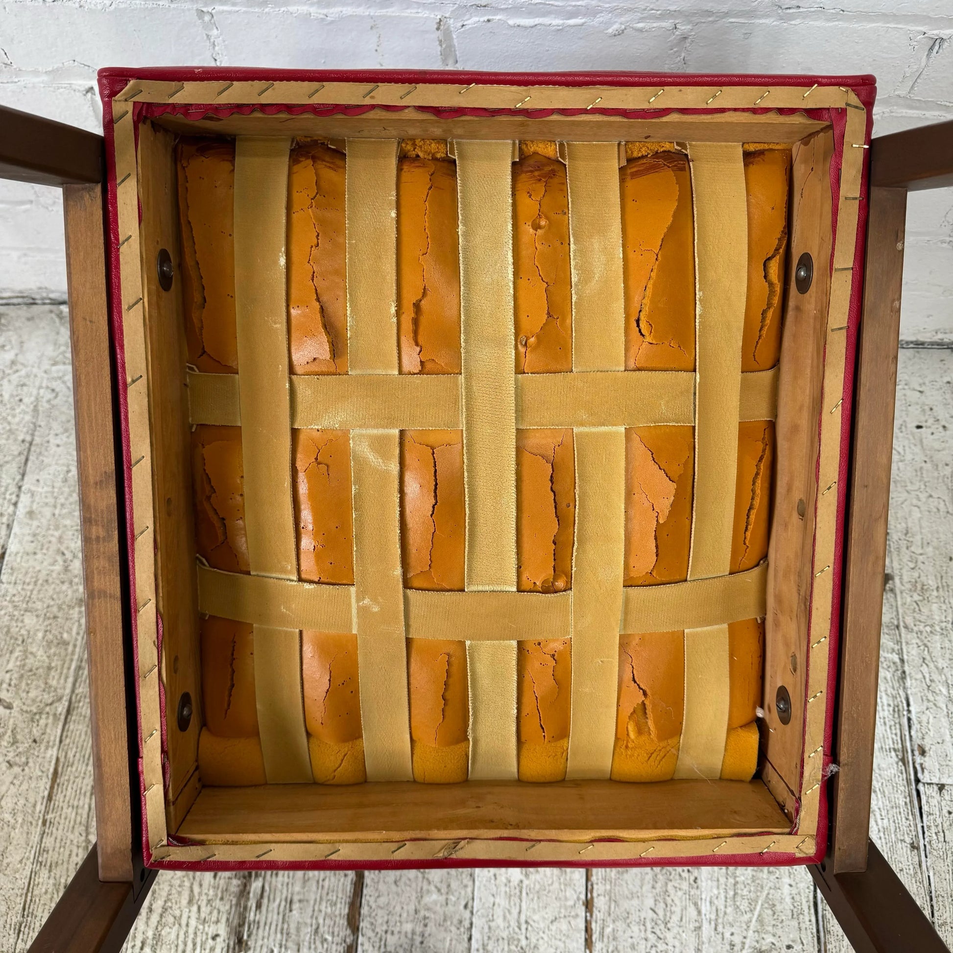 This chairs feature a red vinyl seat and back and a walnut wood frame. This set could be used in the office or at home. This is a good looking set that has a Jens Risom look but without the designer cost. There’s no makers mark on the chair.