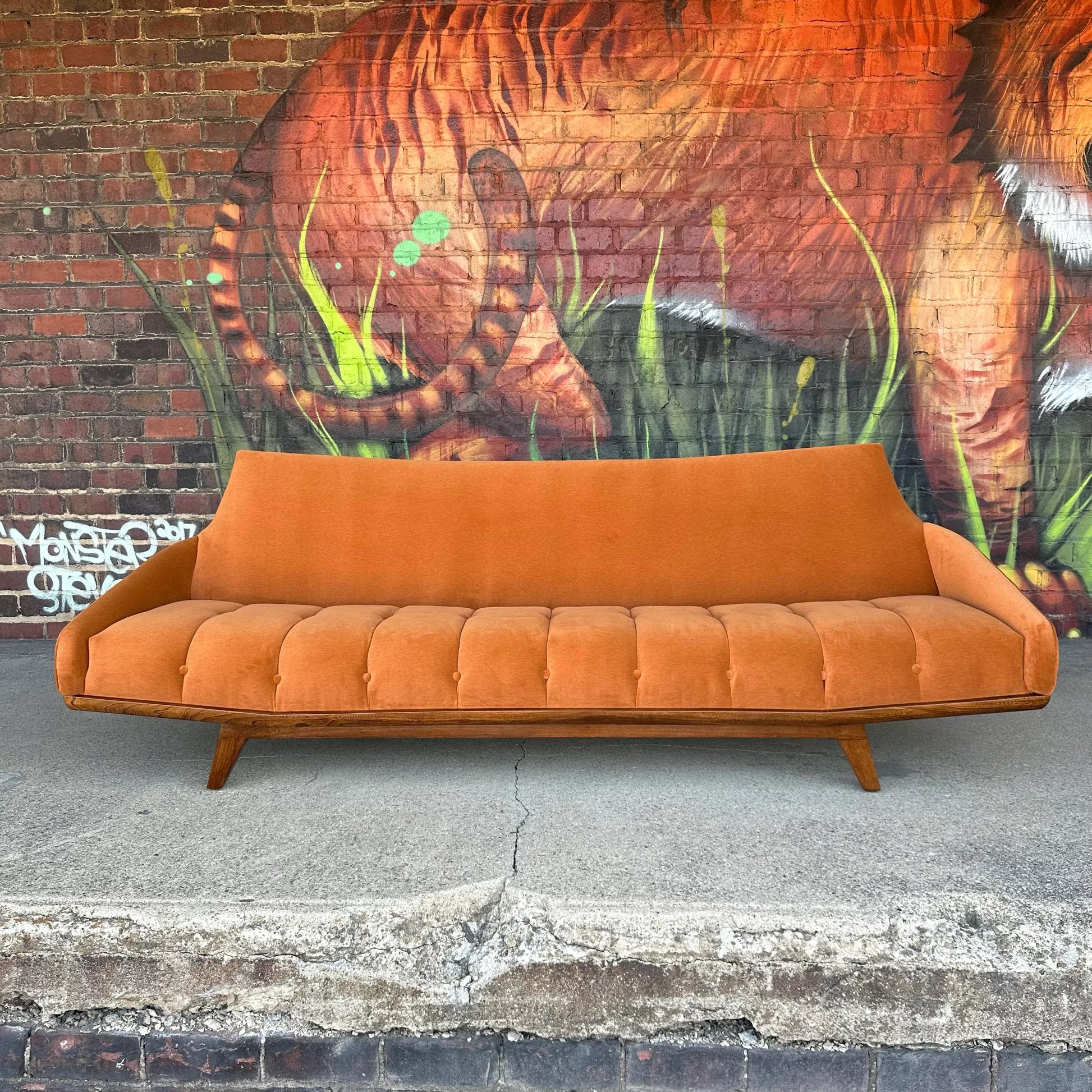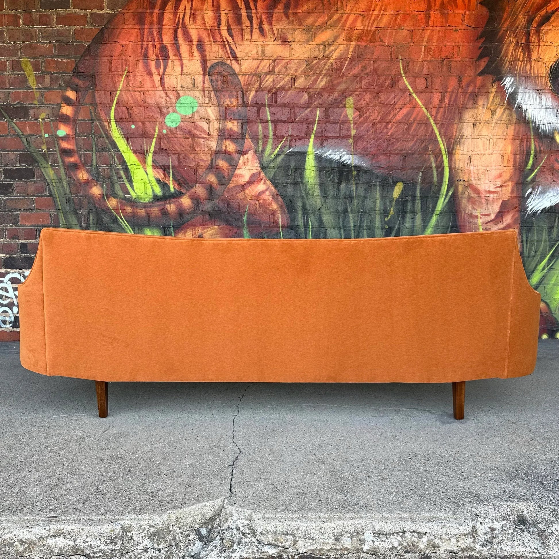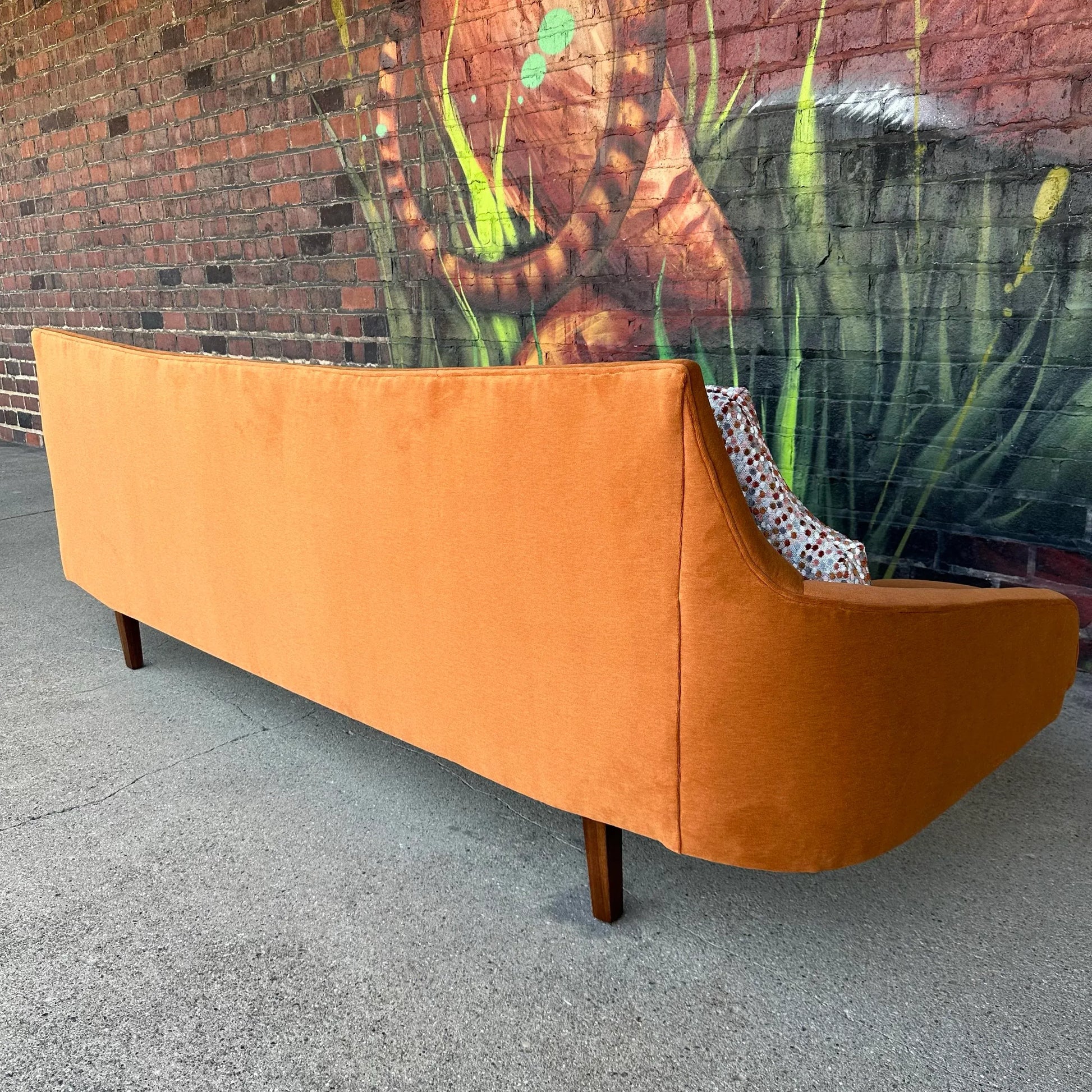 Mid-Century Modern Pearsall Style Sofa that has been completely restored. This sofa has incredible curves and angles giving it an interesting form. It’s recovered in a muted orange velvet with contrasting cushions featuring colors of pink, rust, baby blue, and gray.