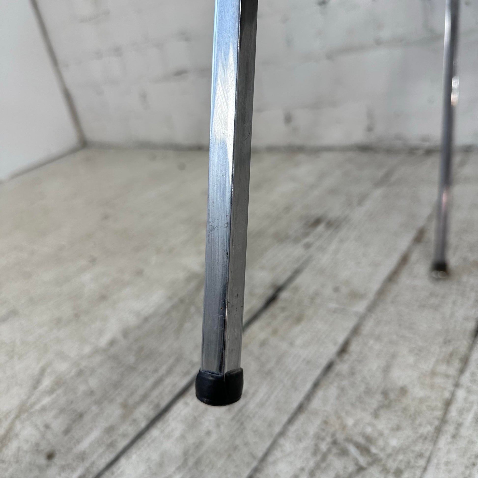 Mid Century Modern Robert John Stainless Steel Armchair. The armchair features a walnut padded armrest and polished stainless steel frame. The seat and backrest are upholstered in a green fabric. The chair had a nice elegant MCM design, reminiscent of a George Nelson armchair . The chair has a makers mark on the bottom.