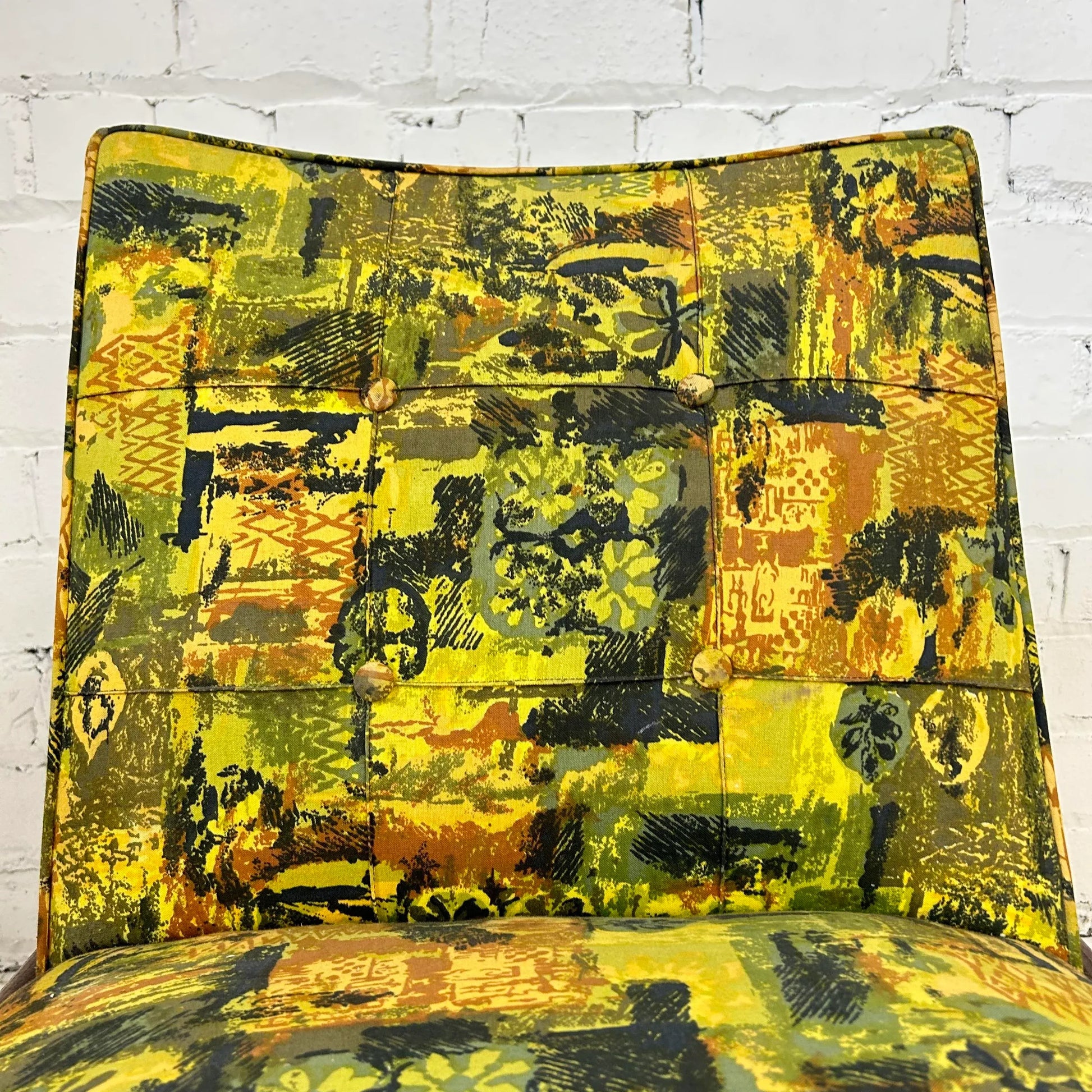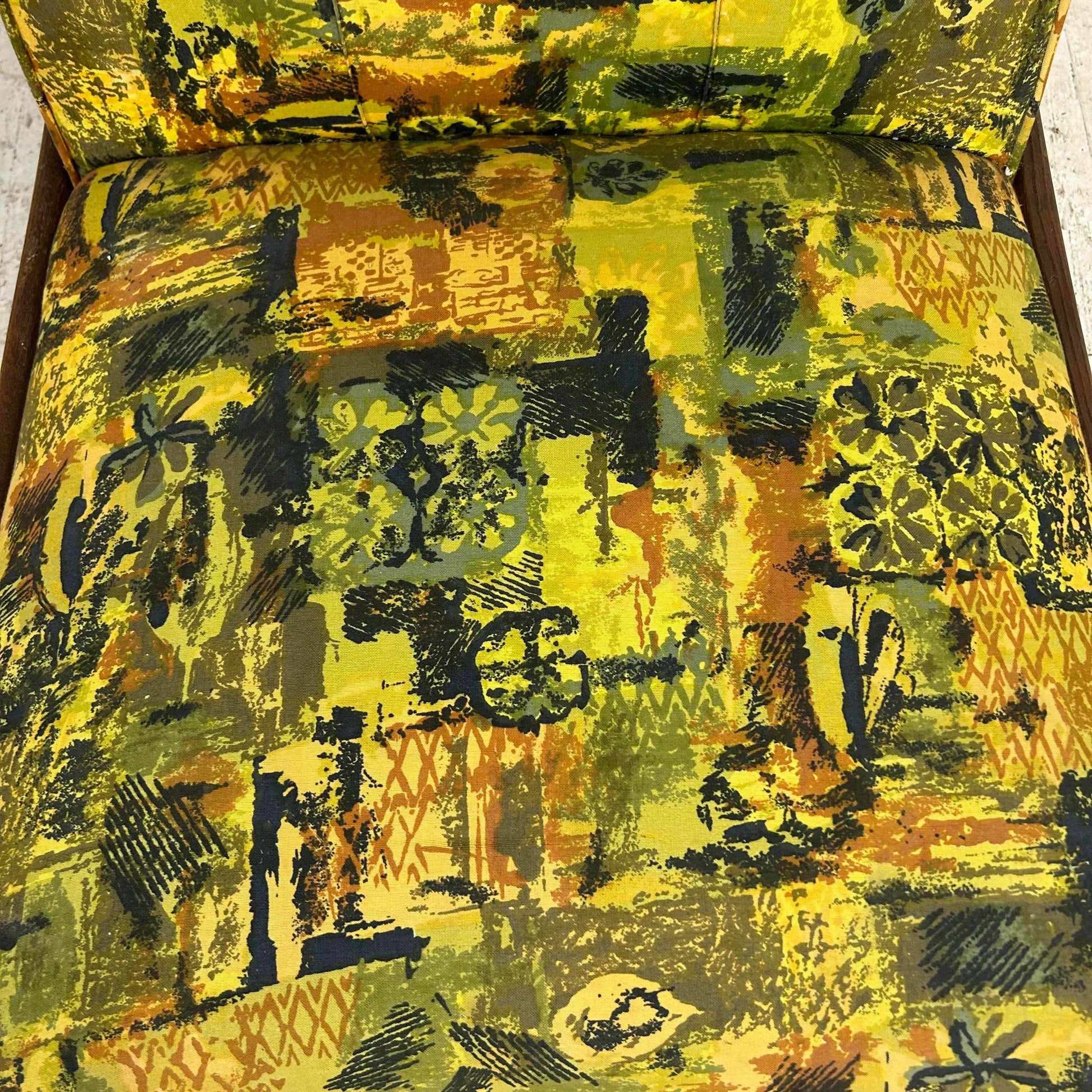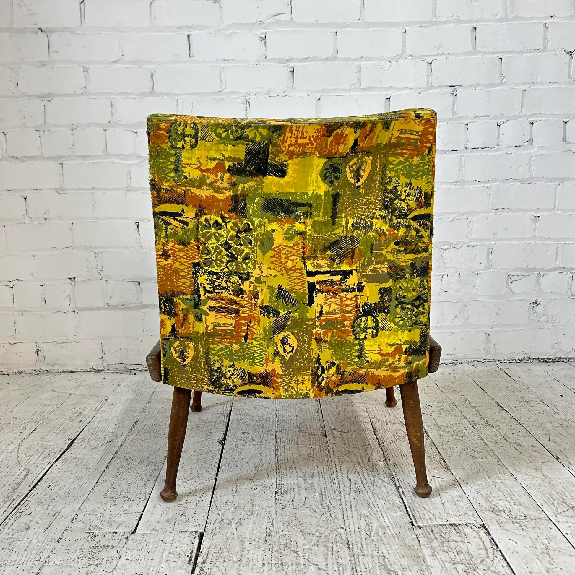 Mid century modern slipper chair with wooden base/legs. Covered in a colorful abstract patterned fabric.