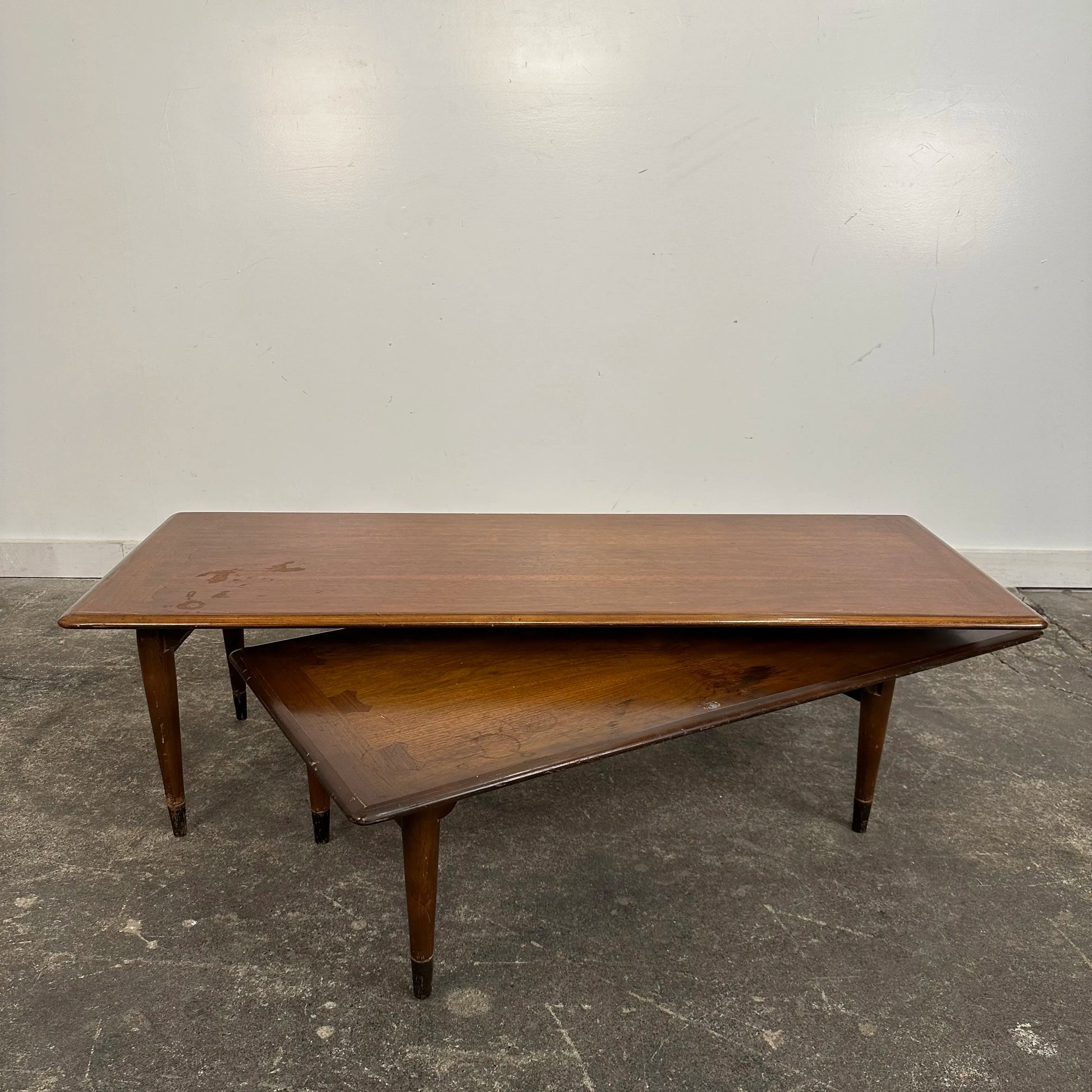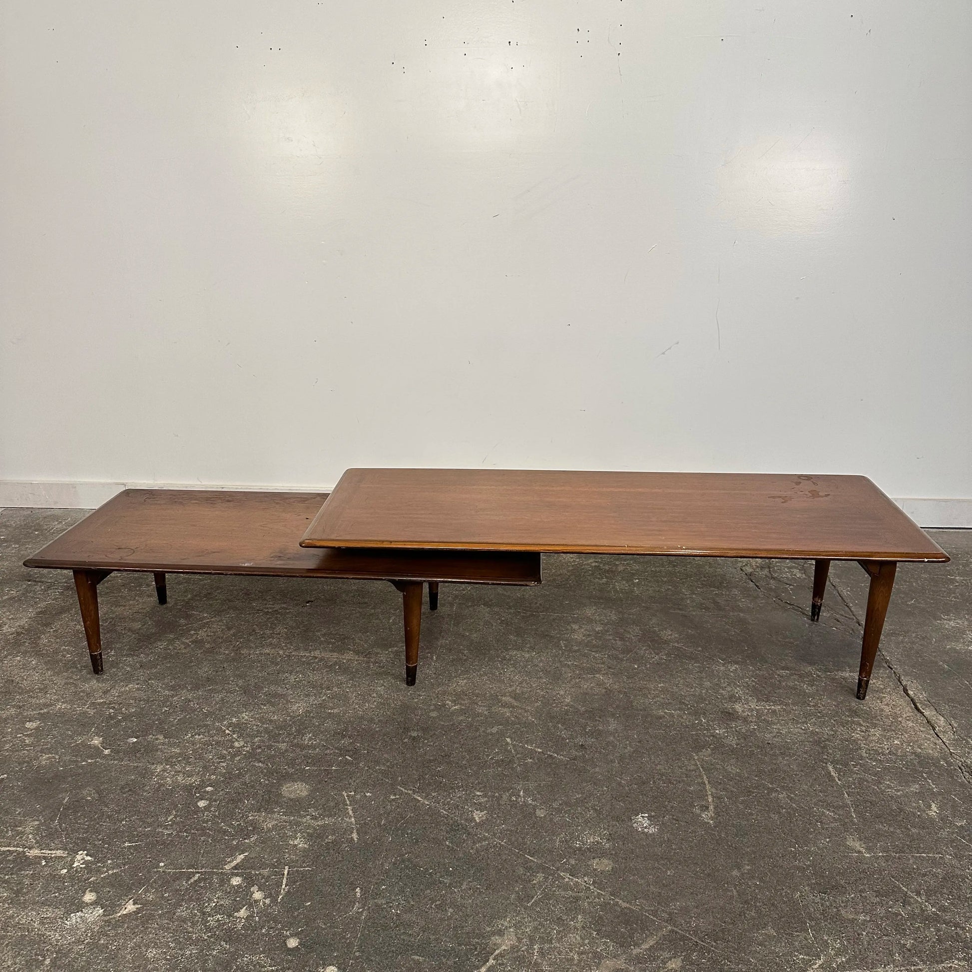 This coffee table is In the style of lane acclaim. We are unsure of the maker of this piece. There is lane style dovetail inlay.