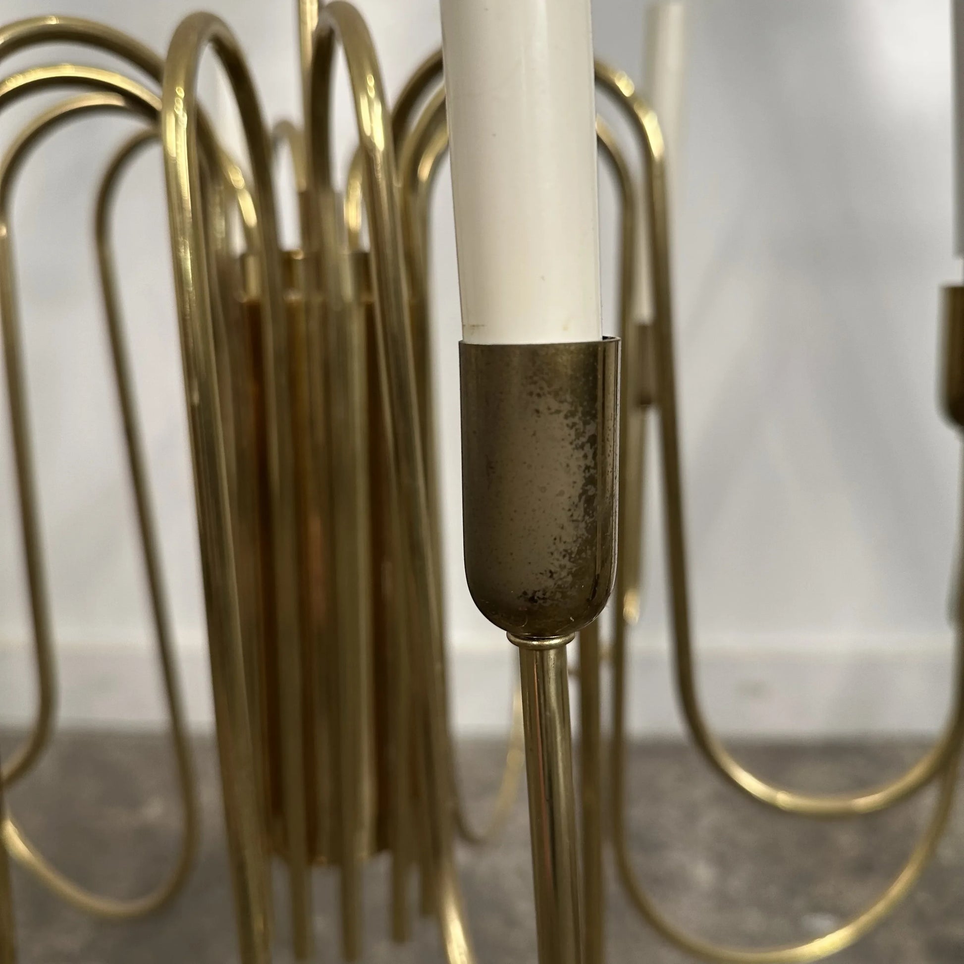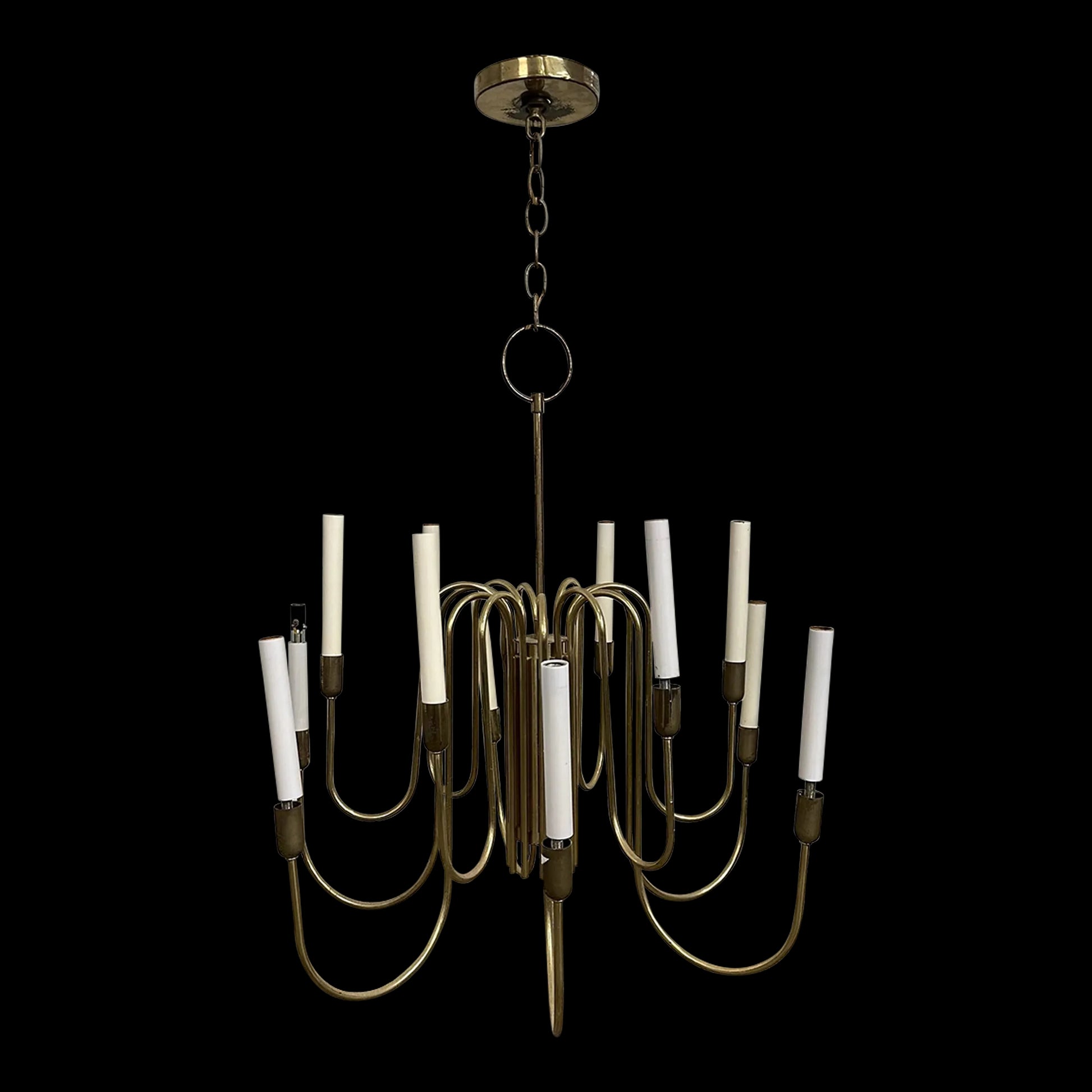 Mid Century Modern brass chandelier attributed to Tommi Parzinger for Lightolier. 12 delicate brass arm chandelier with extended candlestick ends. This piece fits in with a traditional yet modern design. There’s no makers mark on the chandelier.