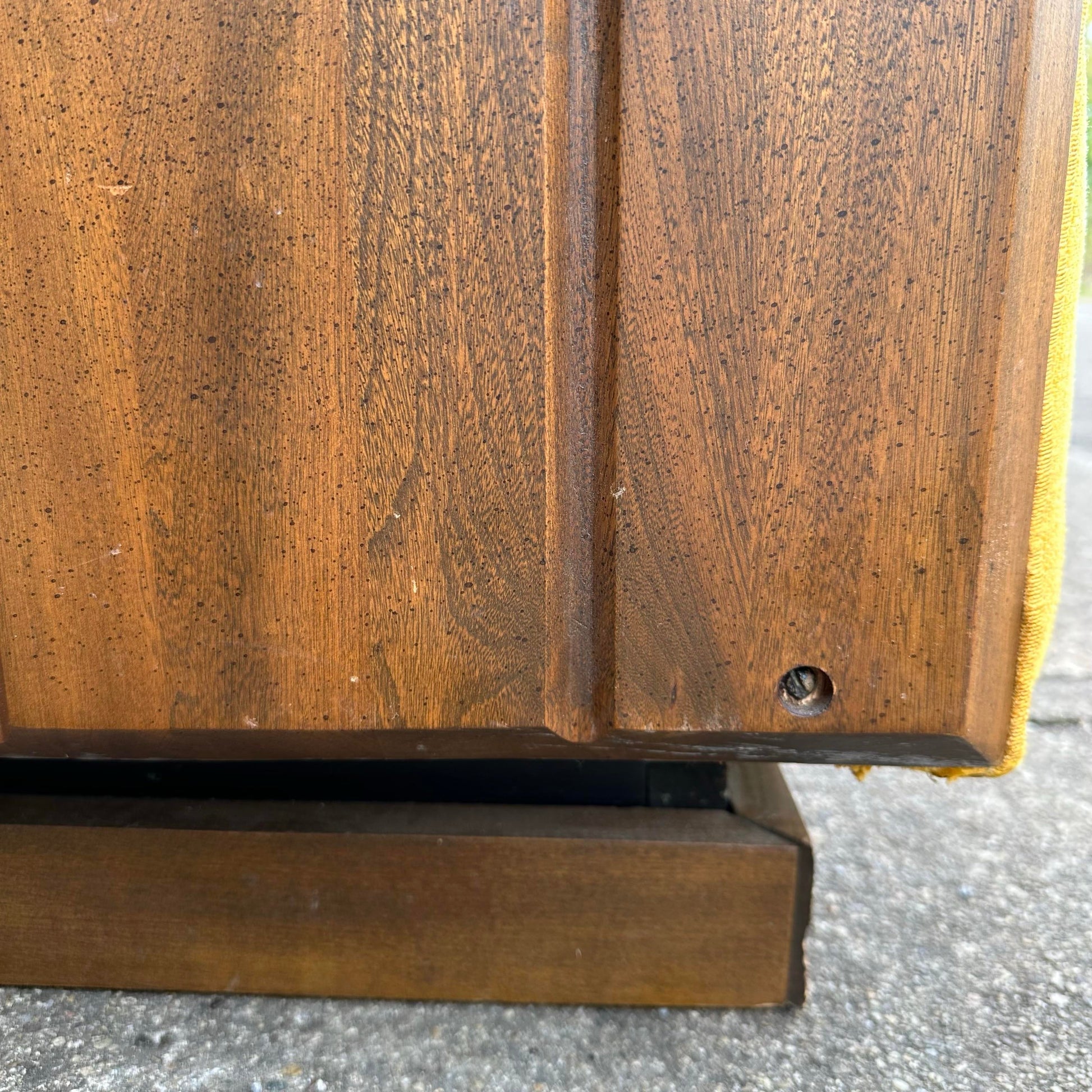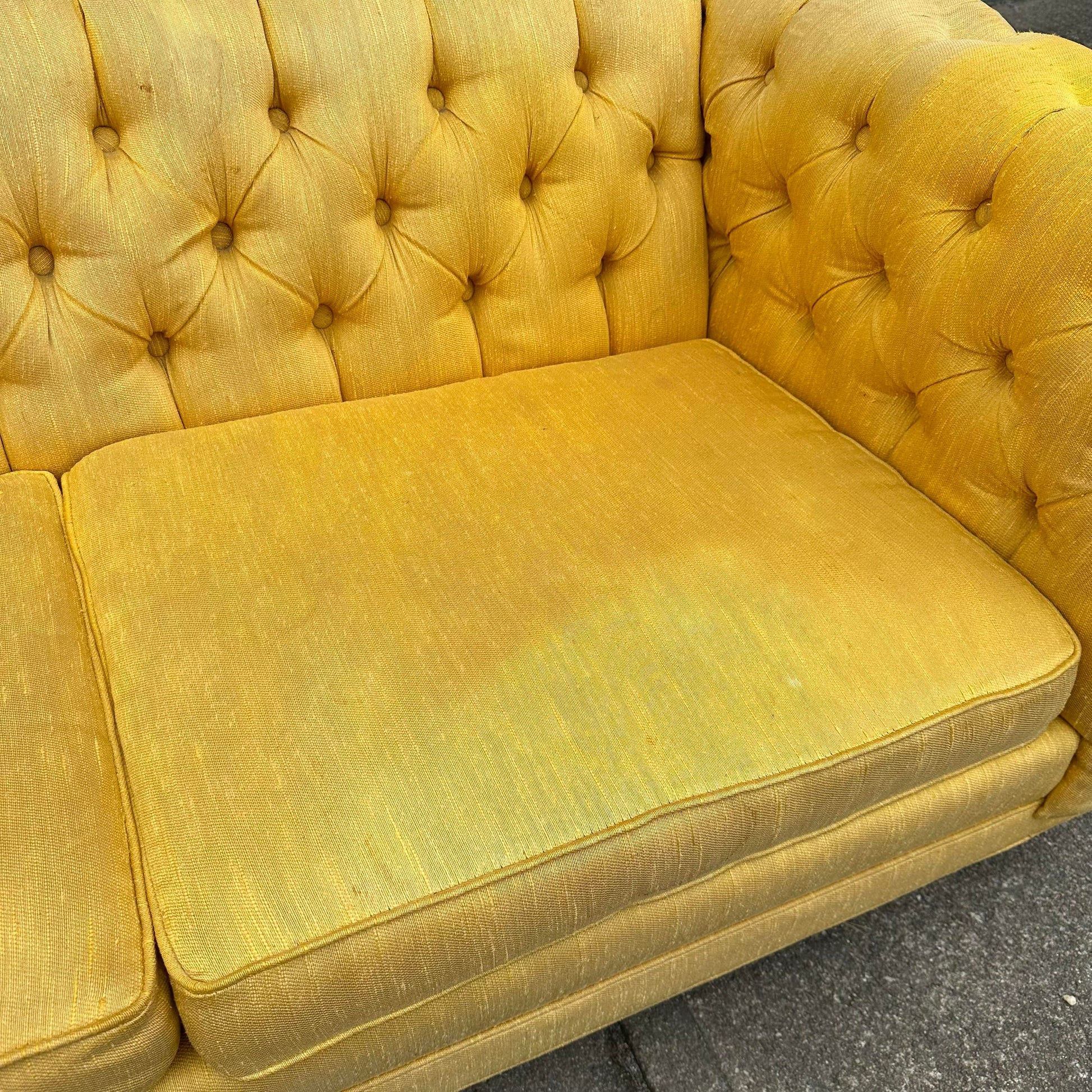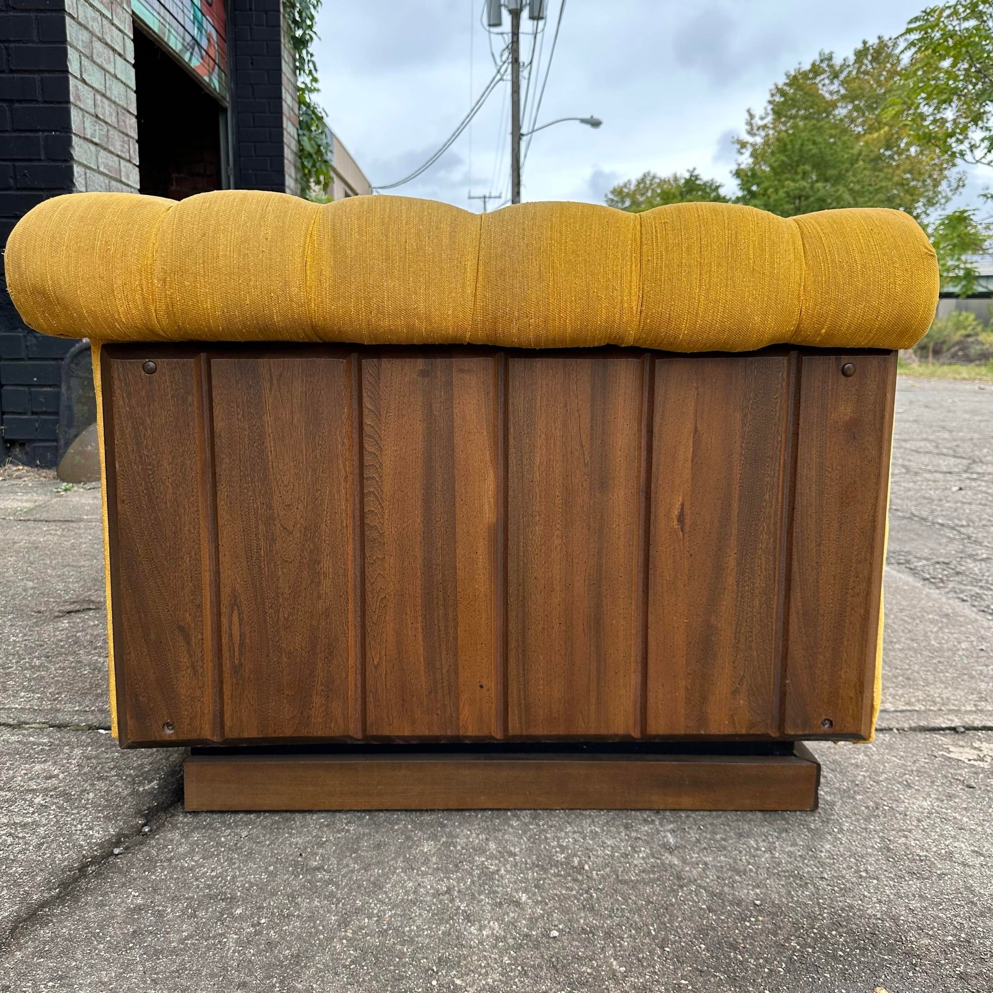 Mid Century Modern Tufted Party style Sofa with wood panel sides. This sofa is a covered in a gold fabric thoughout and a walnut wood panel side detail. There no makers mark on the sofa but has an Edward Wormley party sofa design.