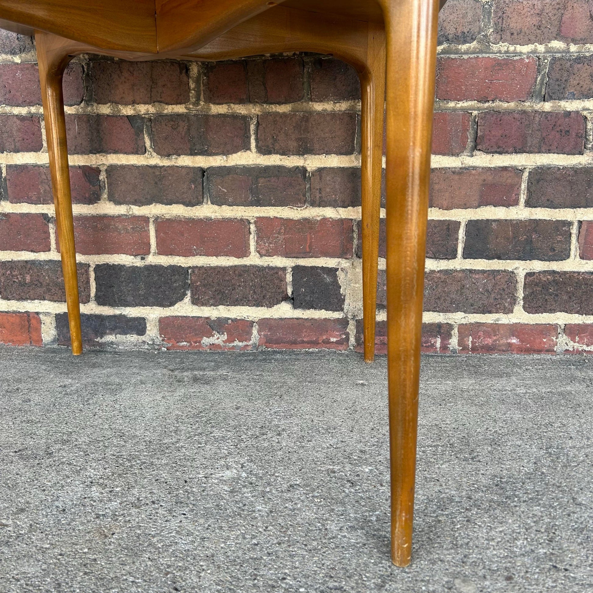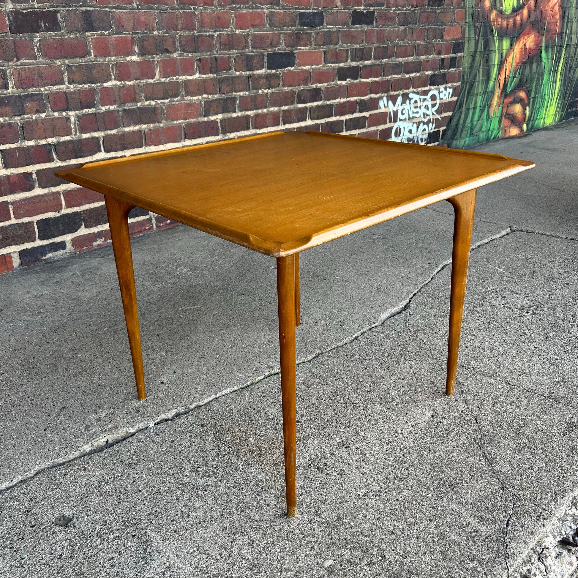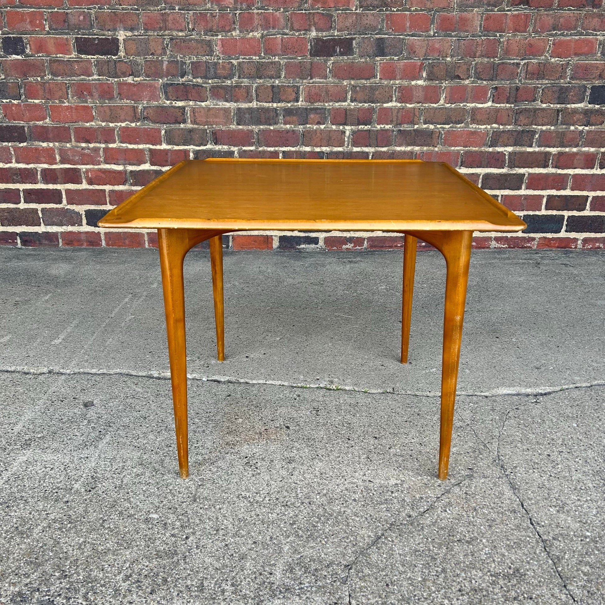 Designed by Erik Christensen. This game table is made of walnut with classic mid century modern tapered legs that are solid walnut. The table is square shaped with rounded corners and a lip detailing along the edges of the table’s top.