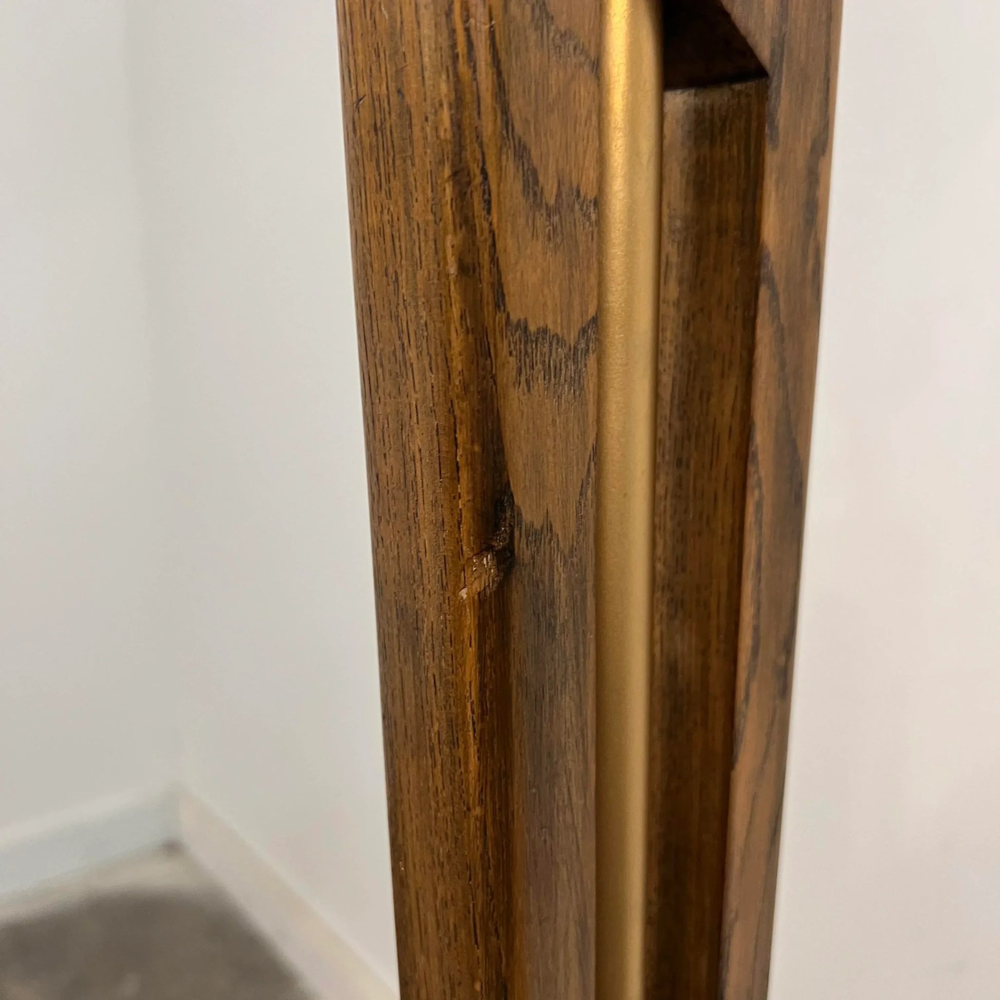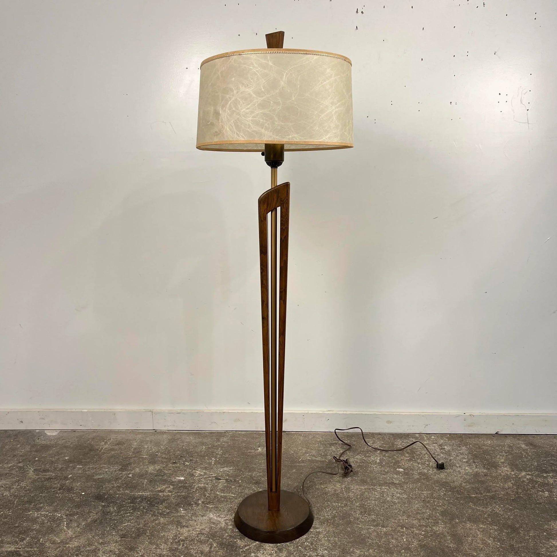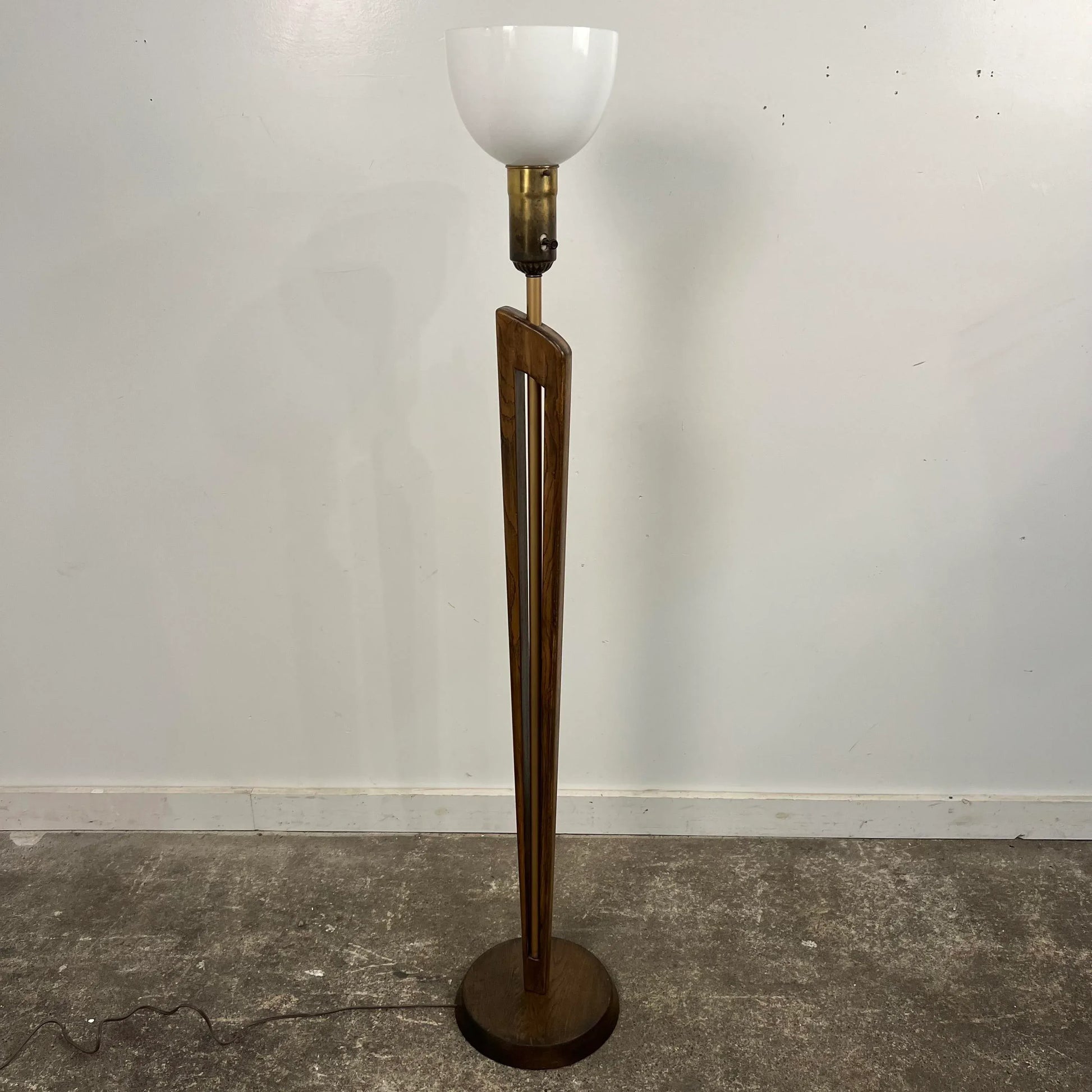 Mid century modern wooden floor lamp with brass detailing.