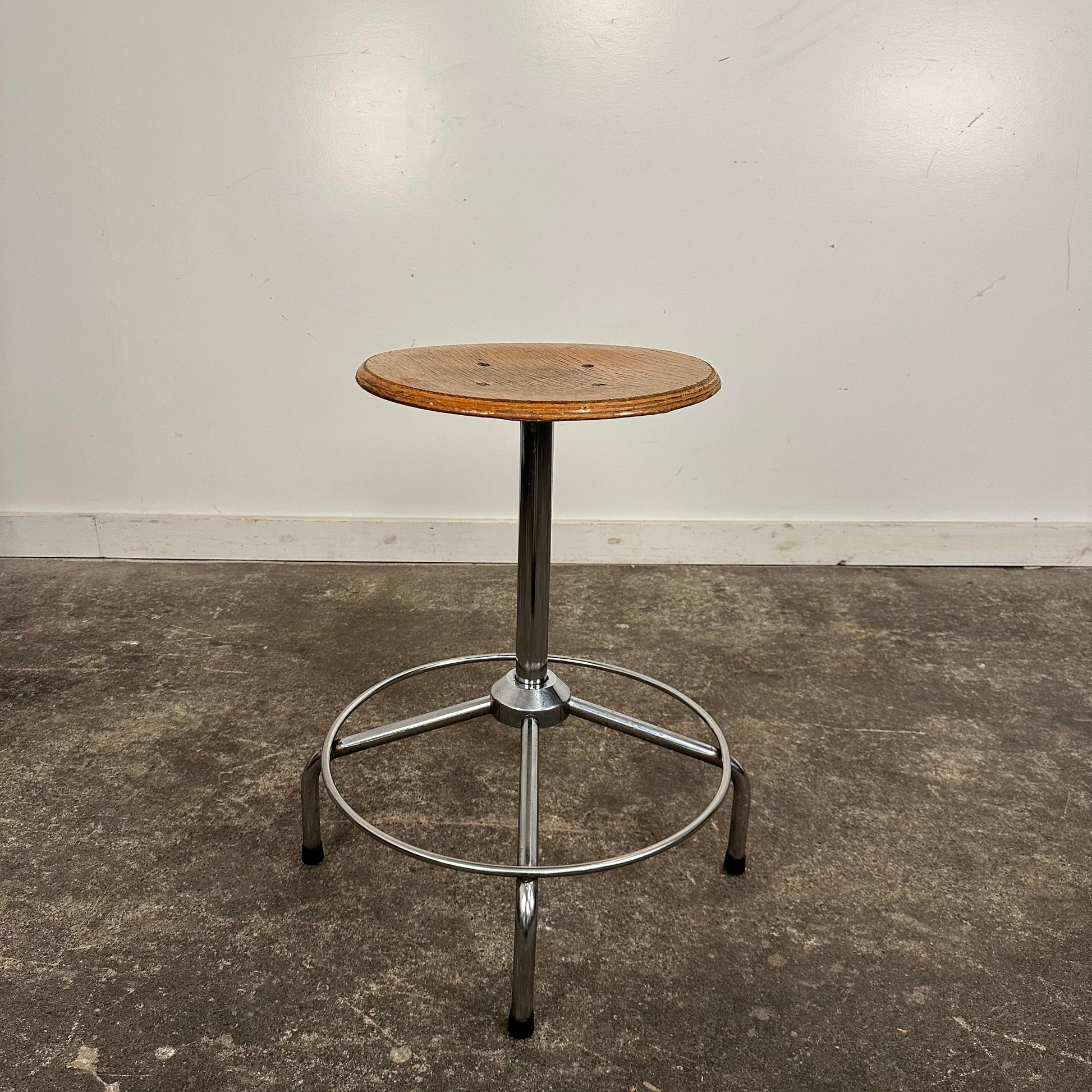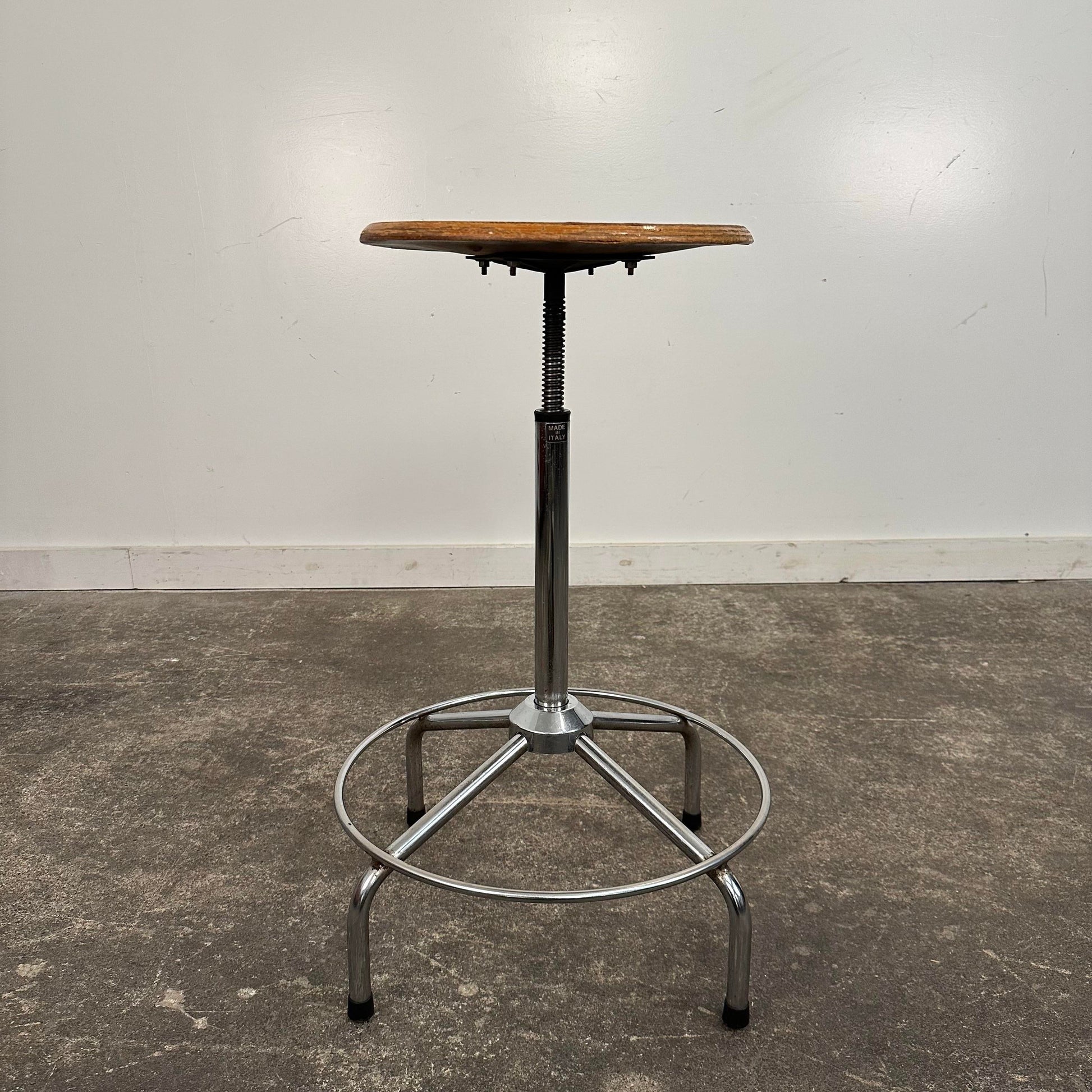 Mid Century Modern Workshop Stool. This stool features a round wooden seat that swivels and adjusts in height. The base is a chromed tubular metal. The piece is marked made in Italy on the base.