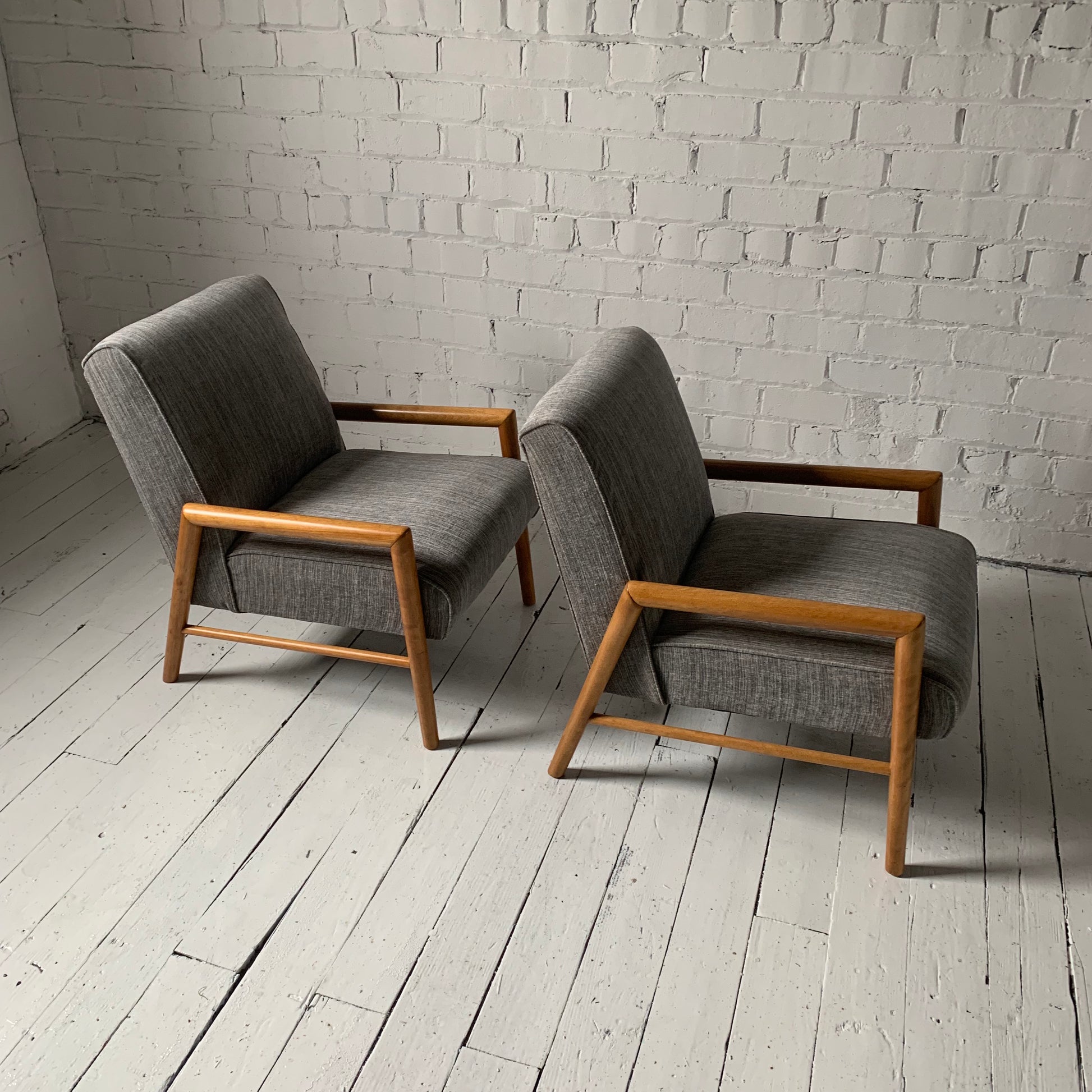 Pair of lounge chairs designed by Leslie Diamond for Conant Ball have open-arm frames of maple which support seats that have been reupholstered in a textured light gray velvety fabric. The chair frames have also been completely refinished by our in house professional.