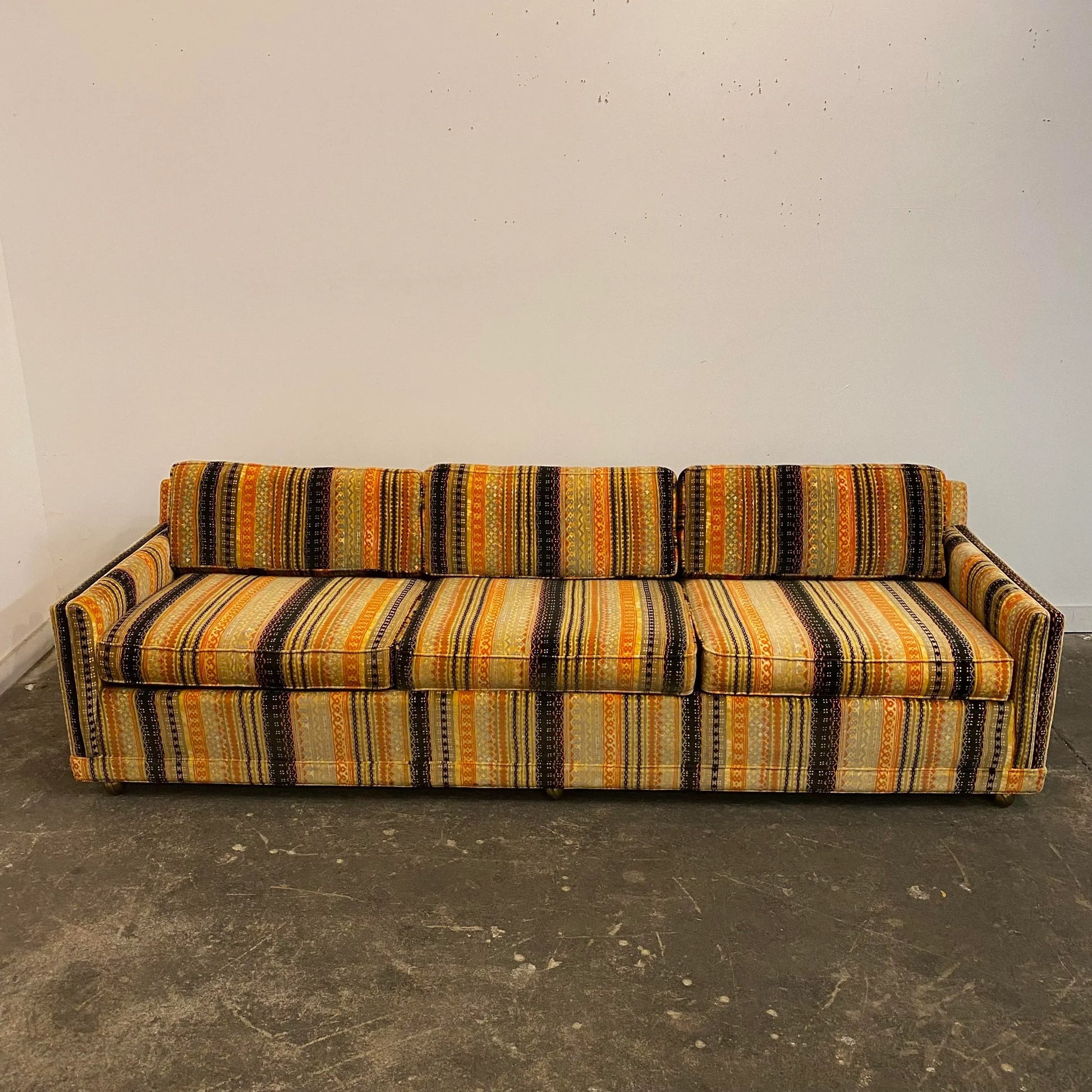 this amazing colorful print velvet is in nearly perfect condition. the sofa to be or in the style of Milo Boughman is from the 1960's we assume and still in extremely clean came out of a clean single owner home. we have photographed the sofa to show the entire piece. feels very much like Jack Lenoir Larsen.