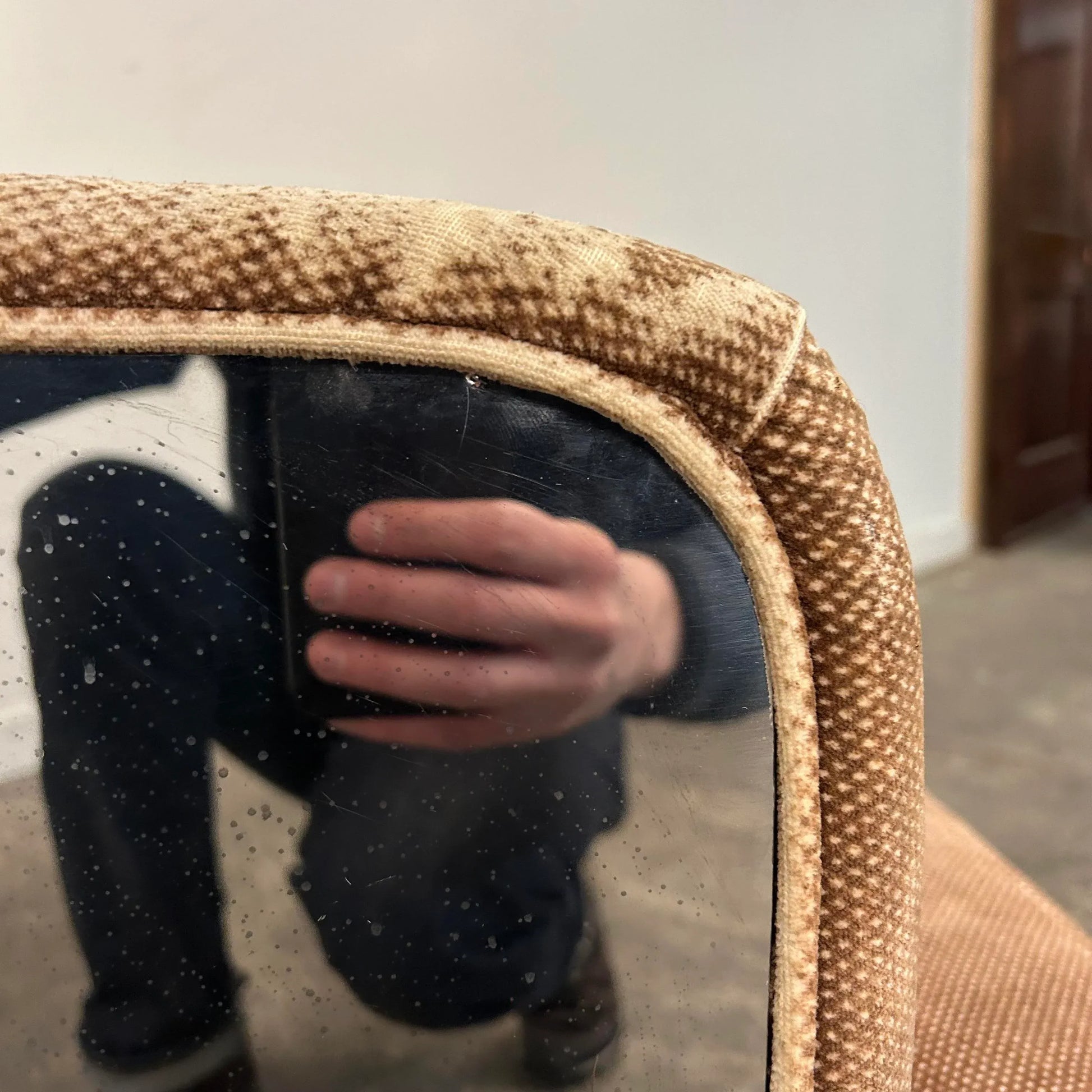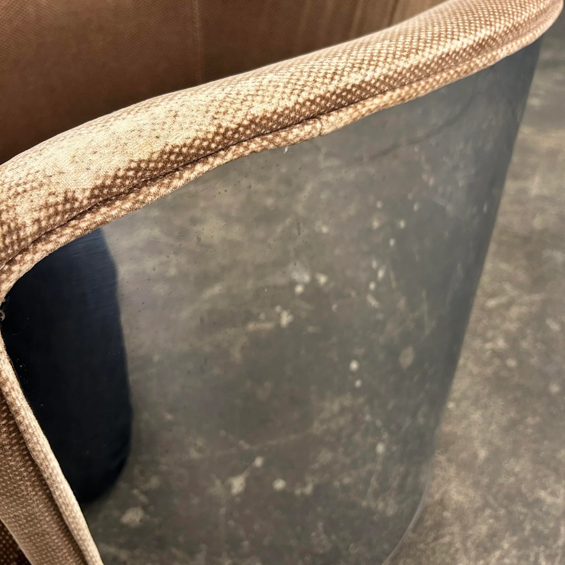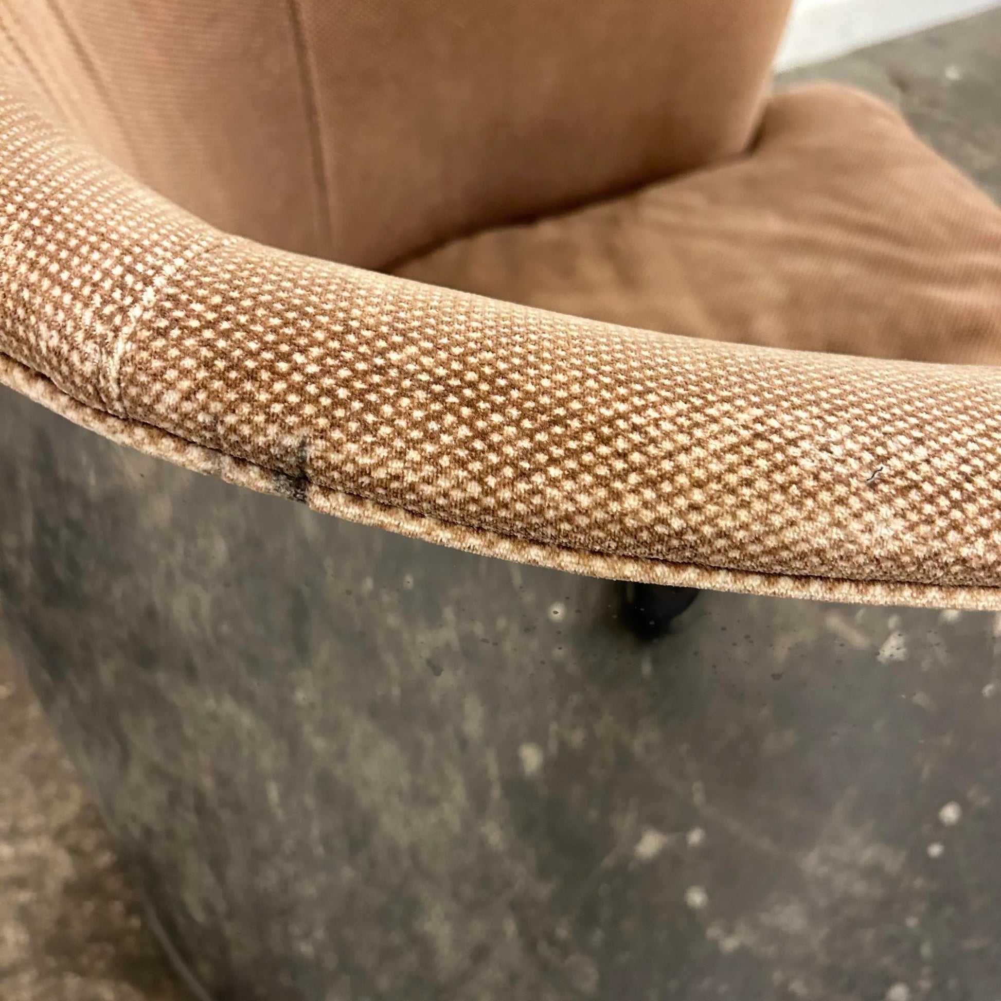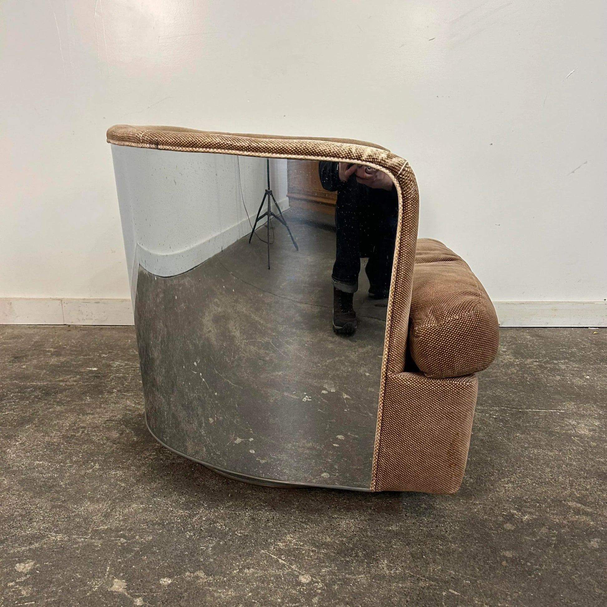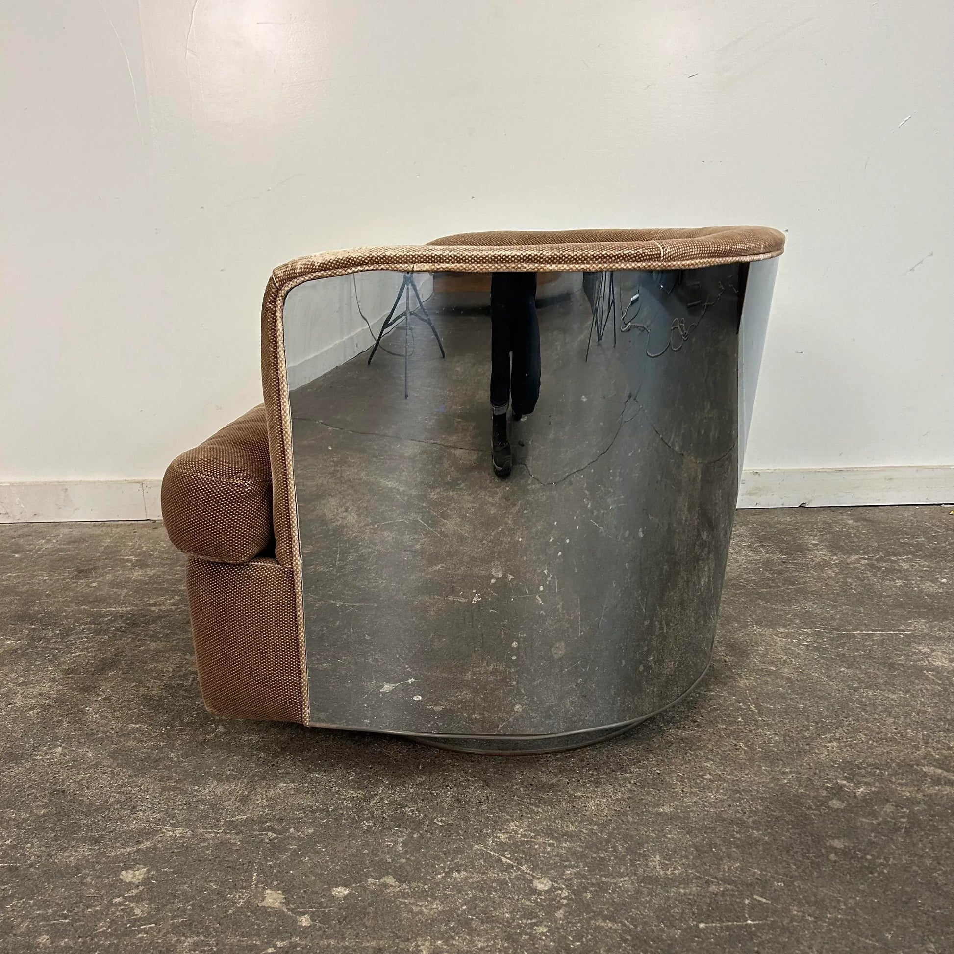 This stunning barrel chair by Milo Baughman for Thayer Coggin. Chrome mirror-finish  backs and rock swivel bases. This is a chair that stands out from the rest and is just dying for you cover in an