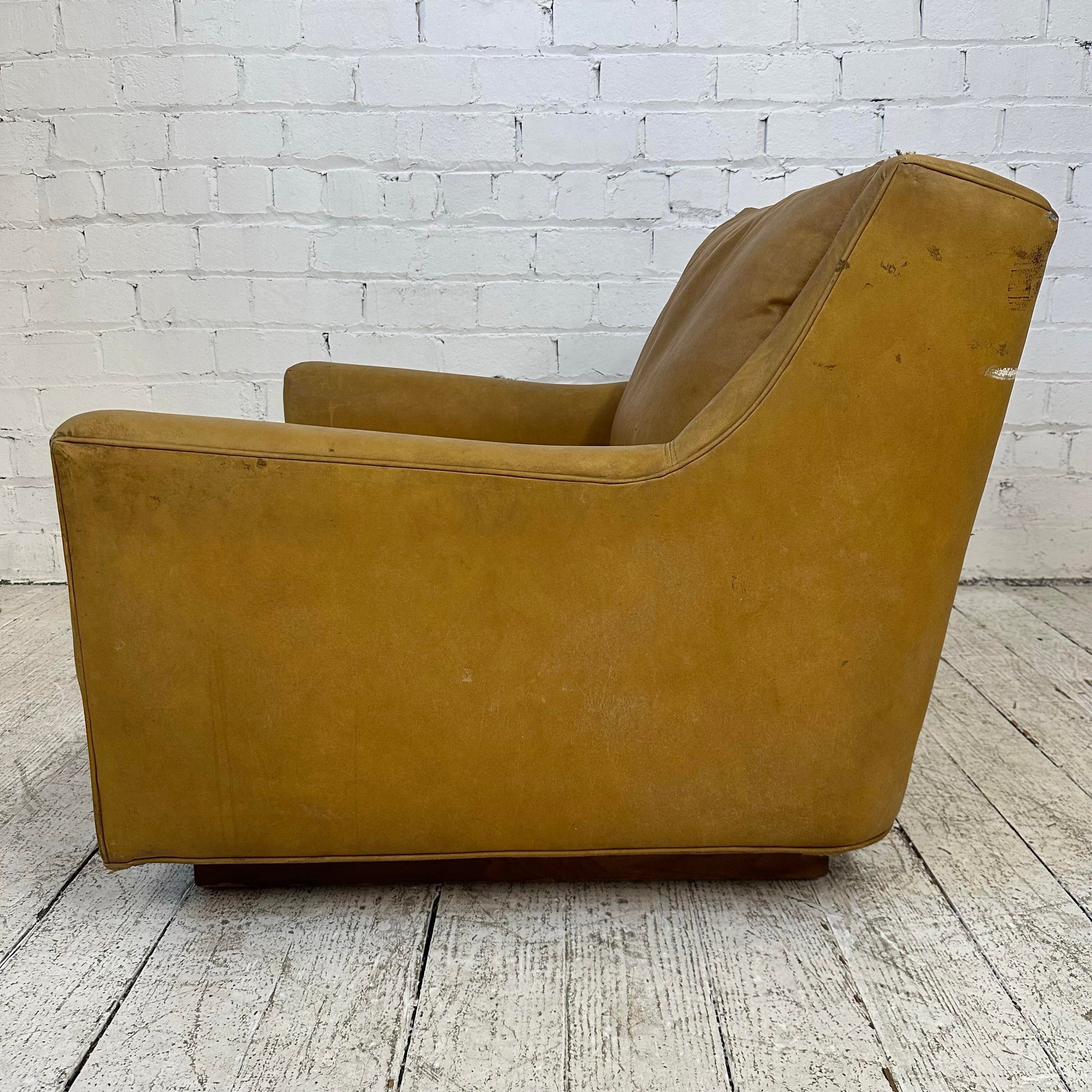 Large brown leather lounge chair by Milo Baughman with plinth style base.
